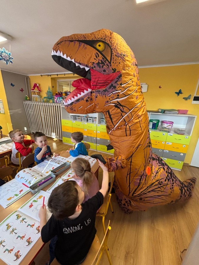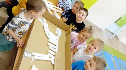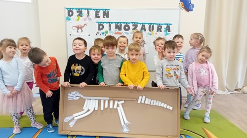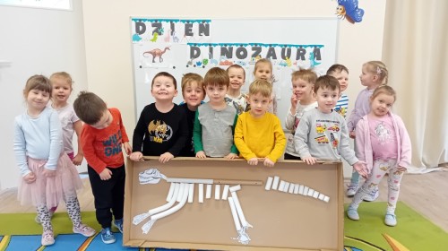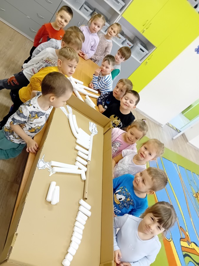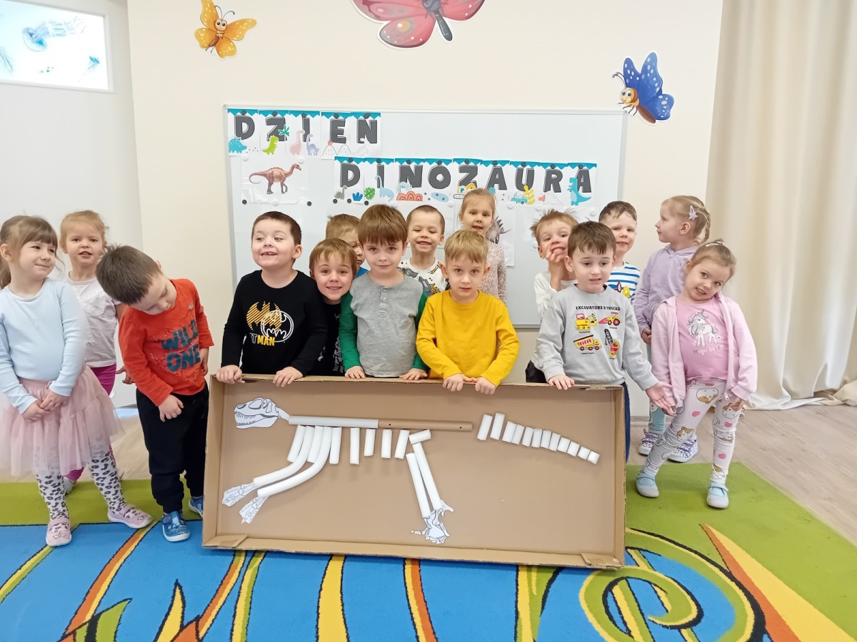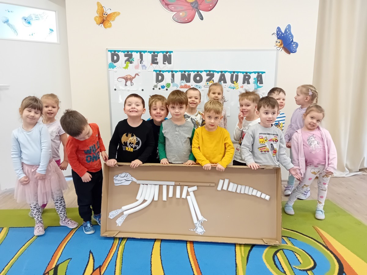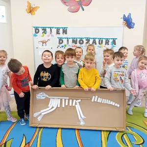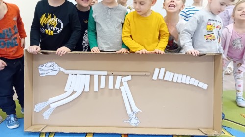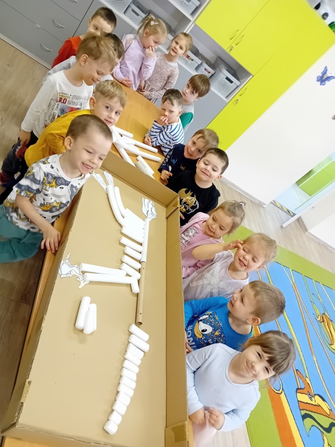 Zakończyliśmy naszą niesamowitą przygodę w świecie prehistorycznych olbrzymów. To był tydzień pełen wrażeń, ale ostatnie dni dostarczyły nam wyjątkowo dużo emocji! Nie zabrakło matematycznych zabaw Przedszkolaki dzielnie przeliczały dinozaury, a za pomocą kolorowych klamerek przypisywały odpowiednie wartości do ich sylwet, ćwicząc przy tym sprawność rączek. W piątek poczuliśmy się jak prawdziwi paleontolodzy. Wspólnymi siłami stworzyliśmy imponujący szkielet dinozaura, przy którego tworzeniu było pełno radości i uśmiechu!