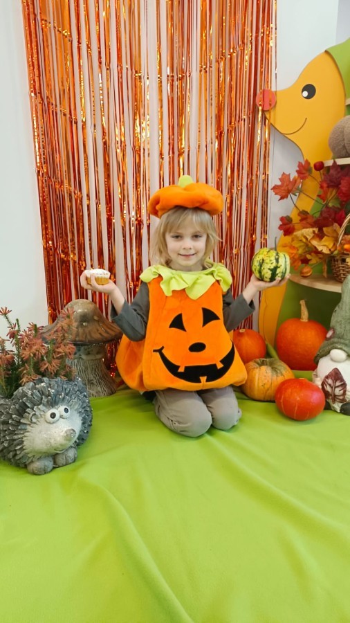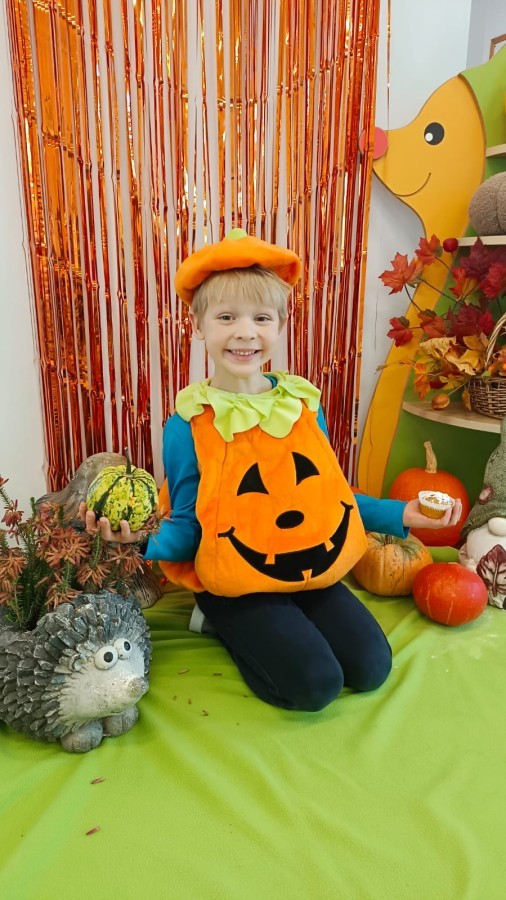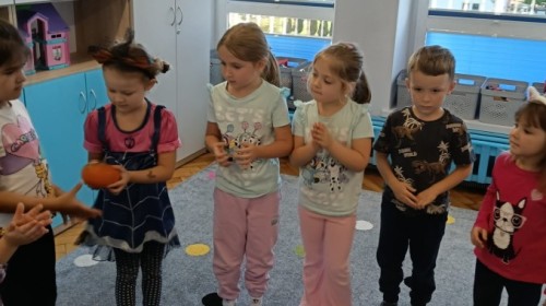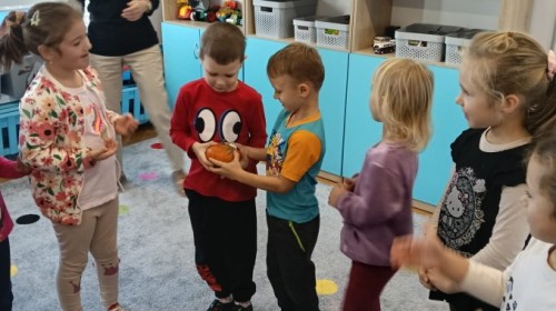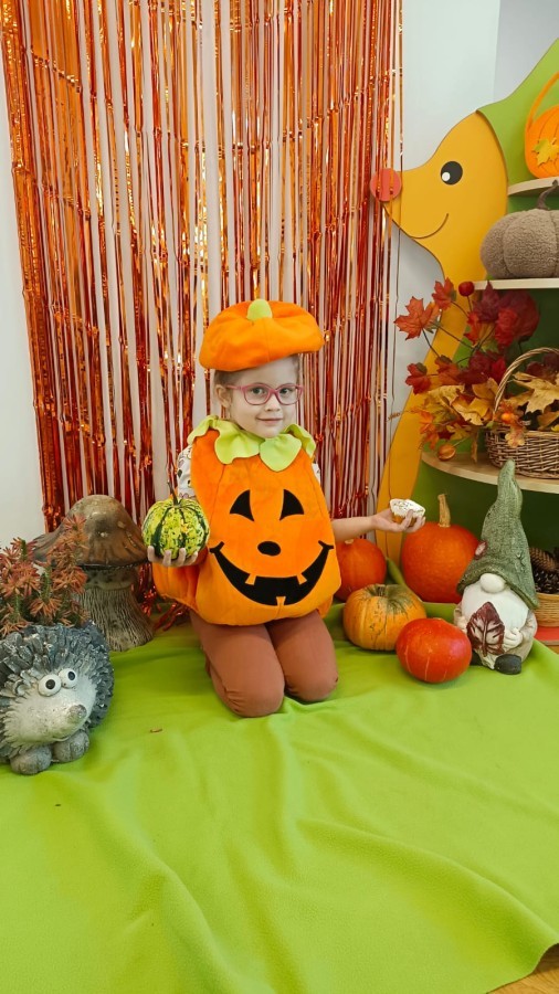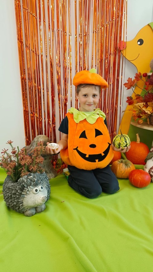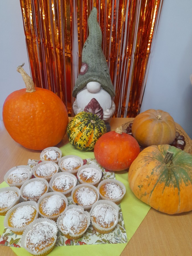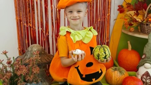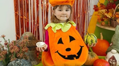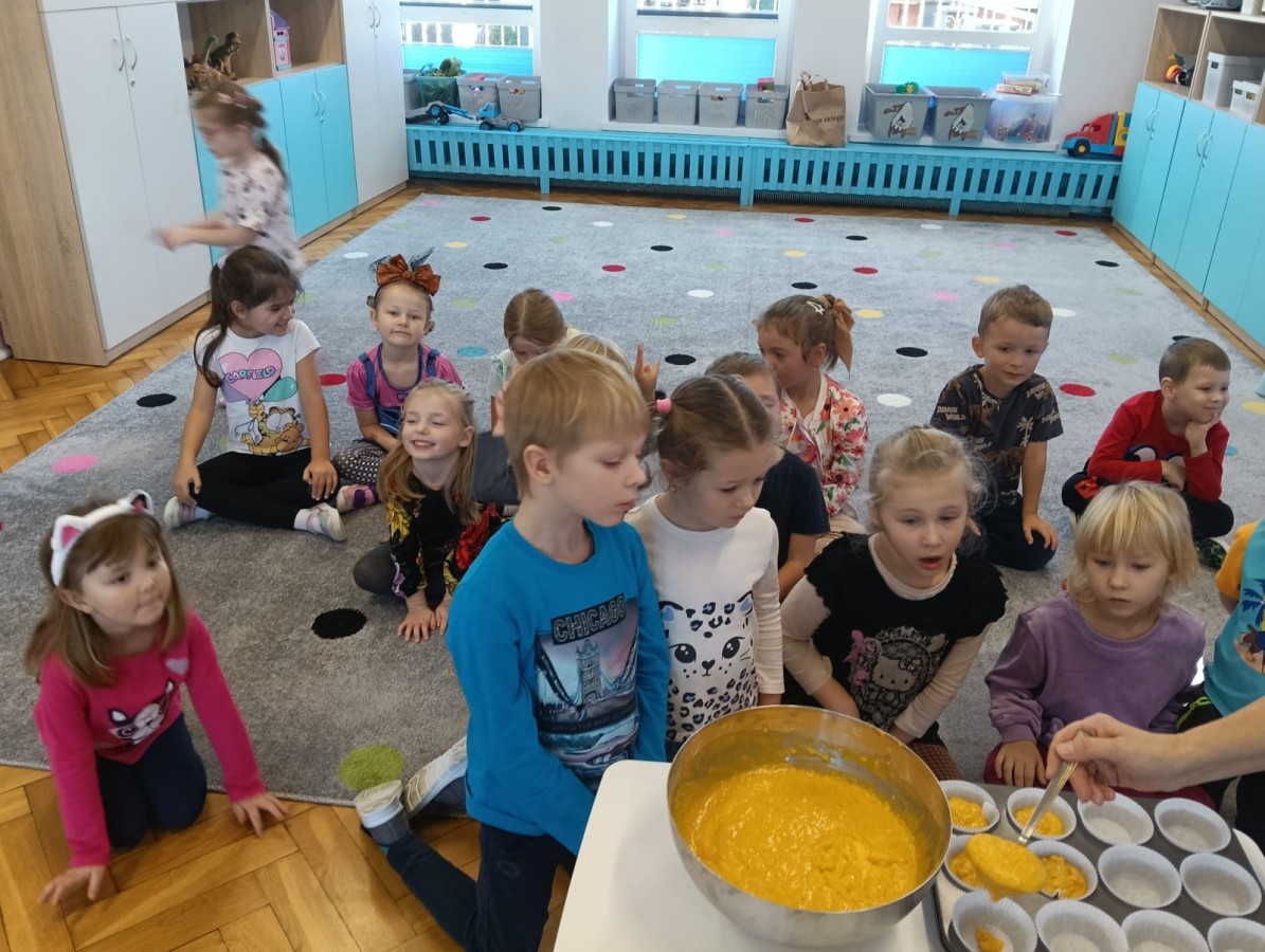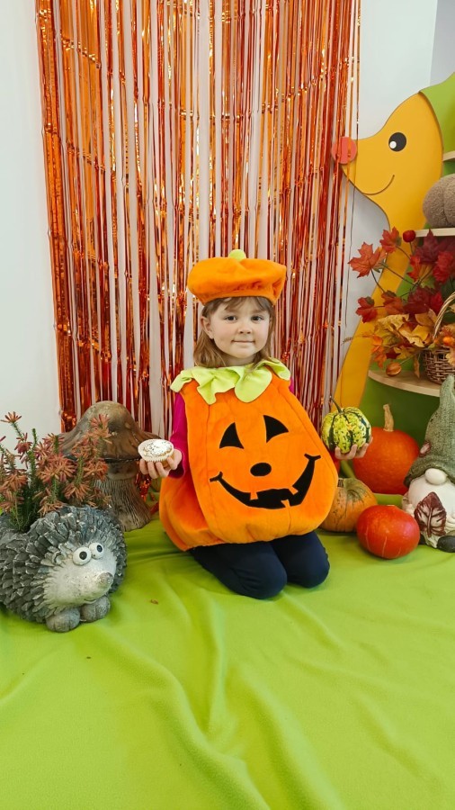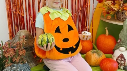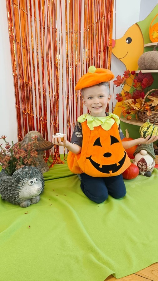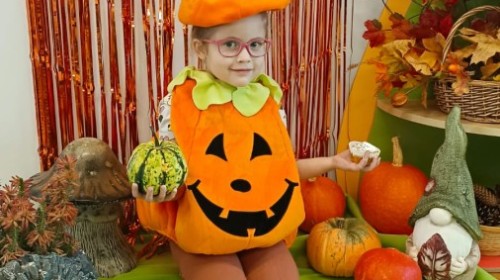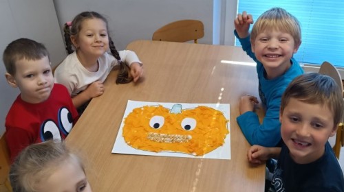 W dniu dzisiejszym obchodziliśmy w naszym przedszkolu Święto Dyni. Był to kolejny kolorowy, wesoły, jak również zdrowy dzień. Od samego rana towarzyszyła nam dynia w zabawach, piosenkach i pracy plastycznej. Dynia była również w przepisie, z którego upiekliśmy pyszne "Dyniowe babeczki". Na koniec dnia mieliśmy kolejną atrakcję: foto-ściankę, na której pozowaliśmy w pięknym pomarańczowym stroju dyni.
