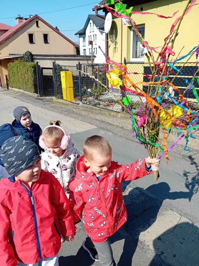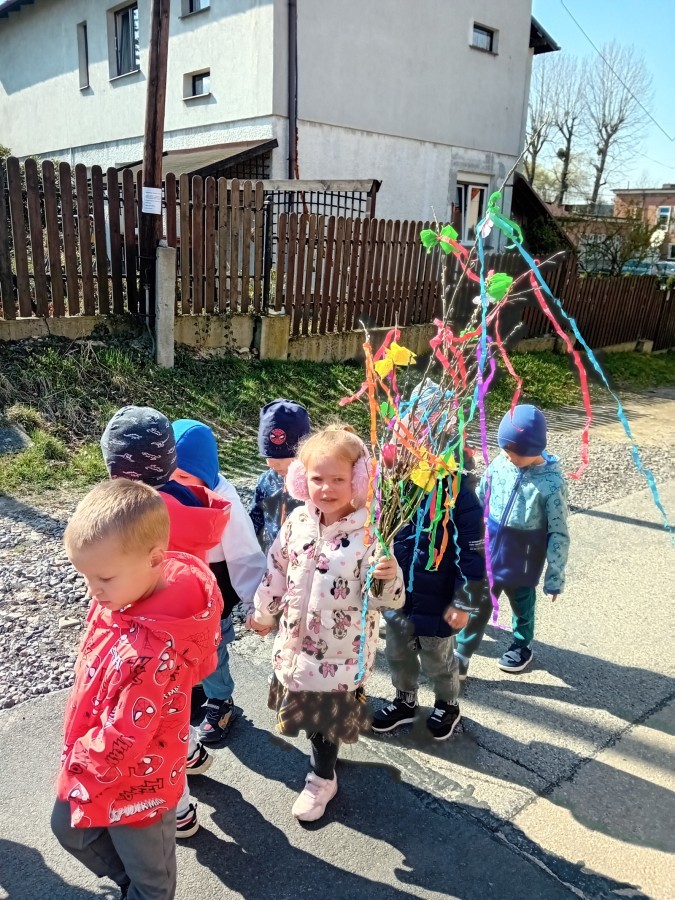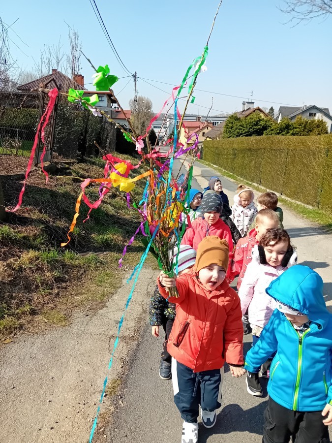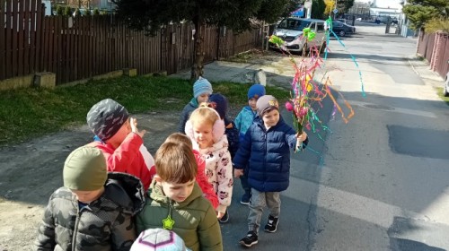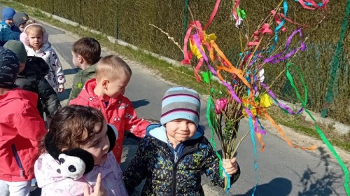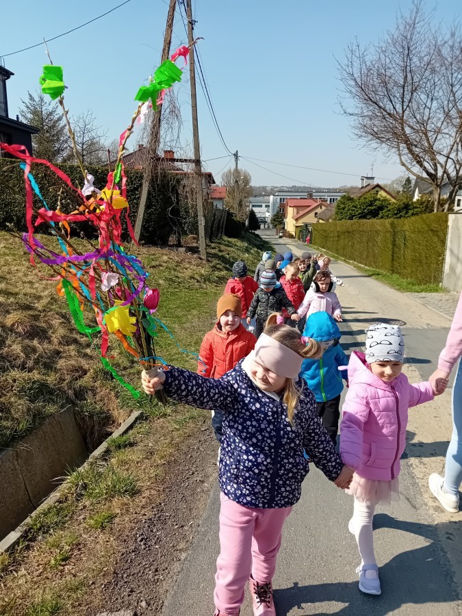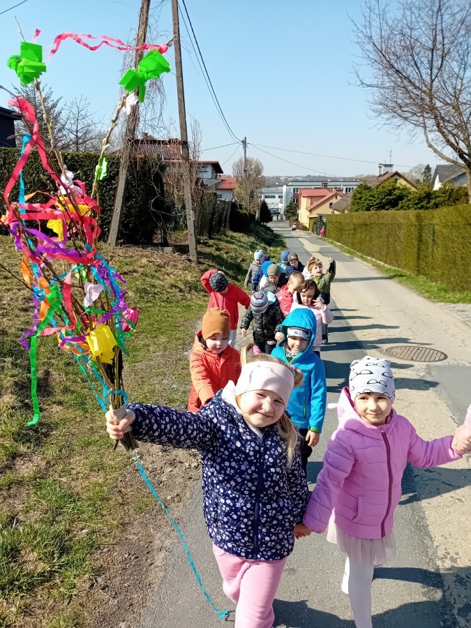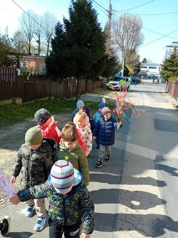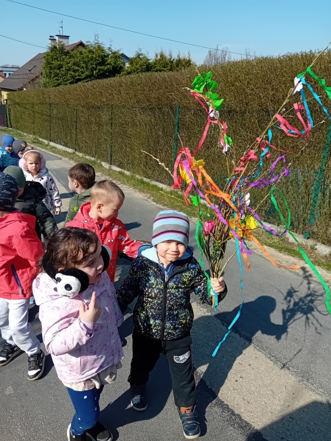 Z taką „magiczną różdżką” ruszyliśmy na wiosenny spacer po okolicy. Głośnym śpiewem i radosnymi okrzykami skutecznie odganialiśmy ostatnie powiewy zimy, zapraszając słońce do wspólnej zabawy. Małe nóżki dzielnie przemierzały pobliskie uliczki, a uśmiechy nie schodziły z twarzy naszych przedszkolaków.