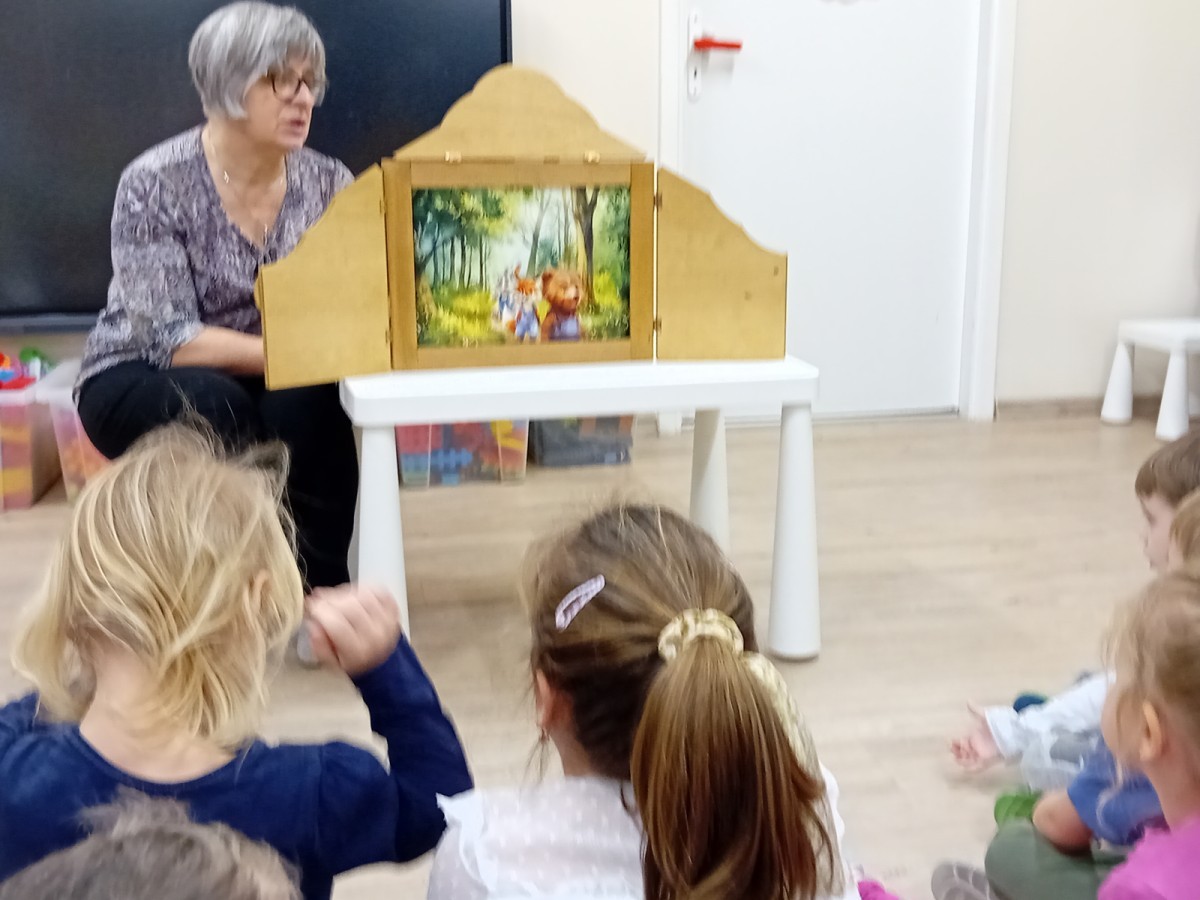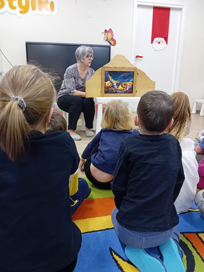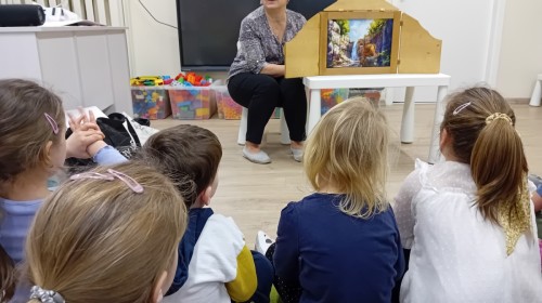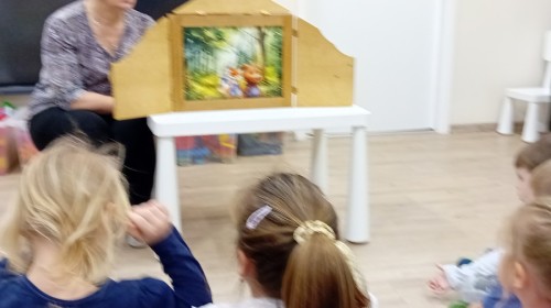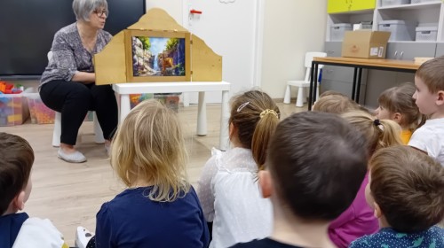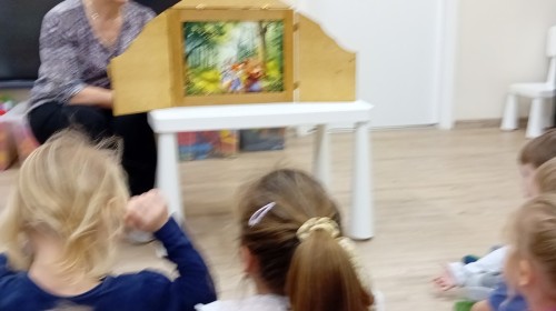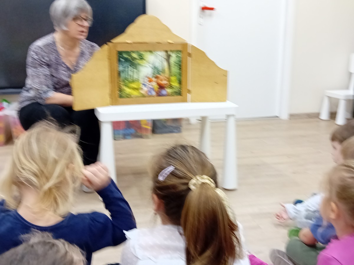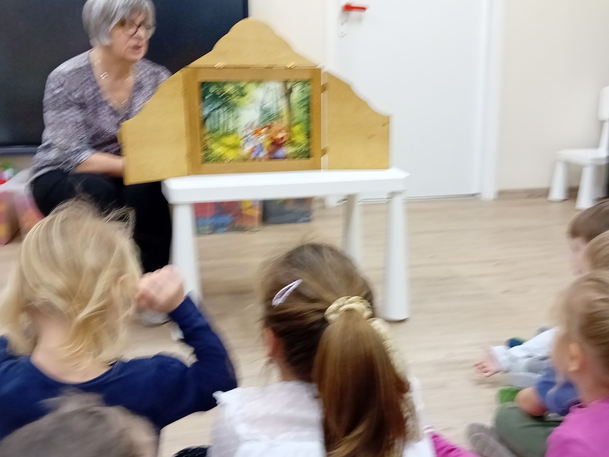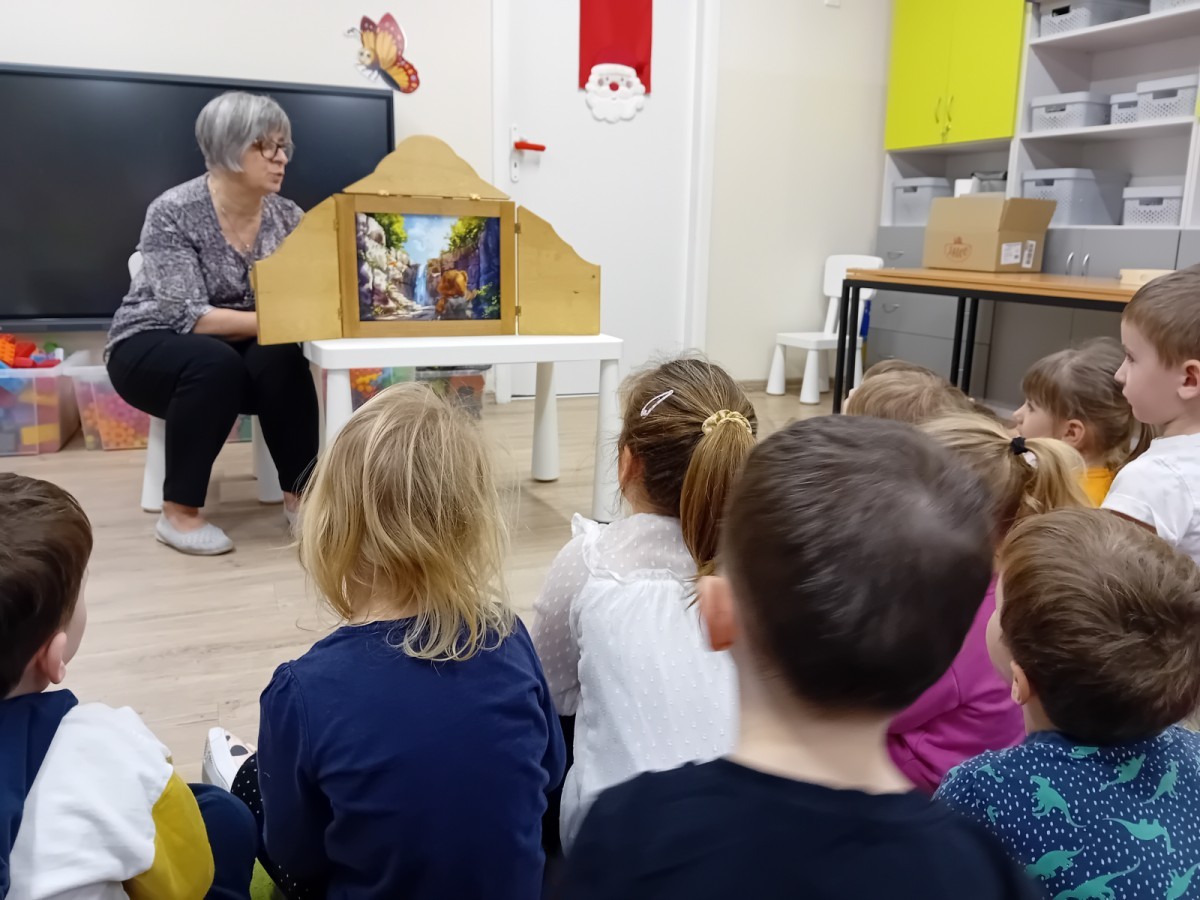 Dzisiaj nasze przedszkole zamieniło się w małą salę teatralną! Odwiedziła nas Pani z biblioteki, która przywiozła ze sobą niezwykły drewniany teatrzyk Kamishibai.