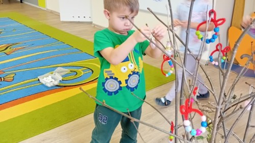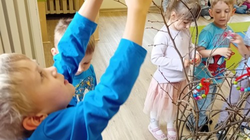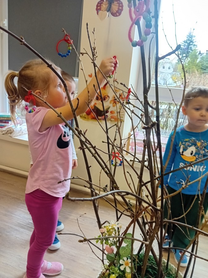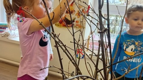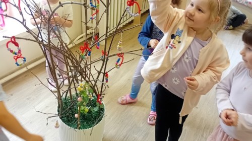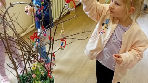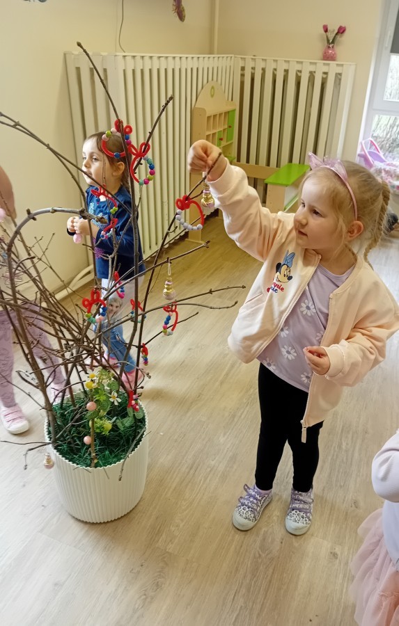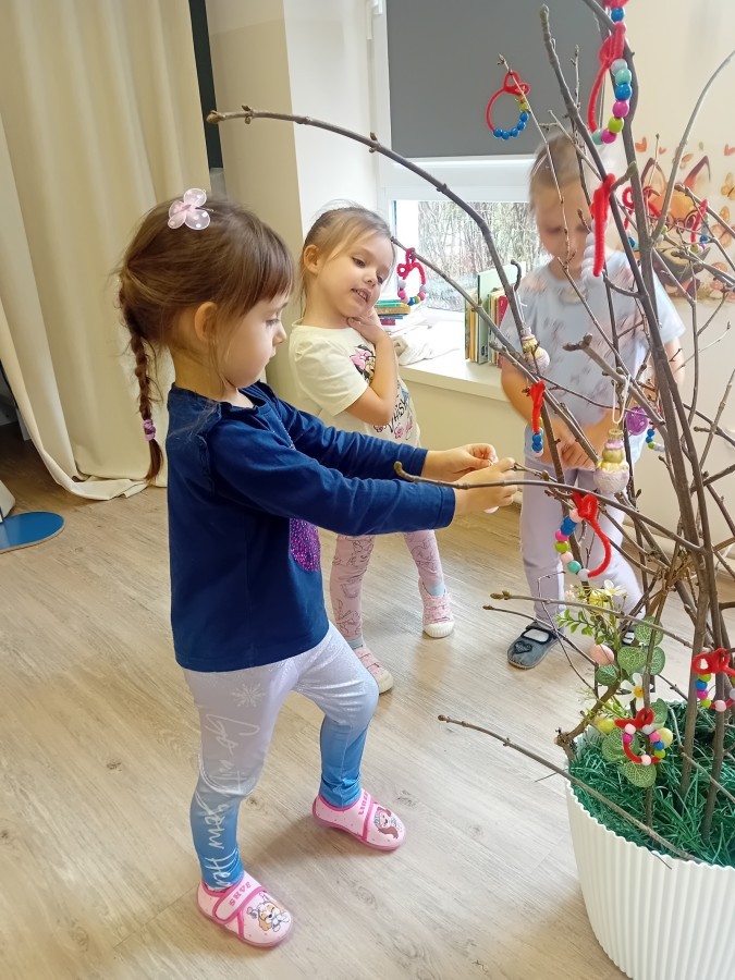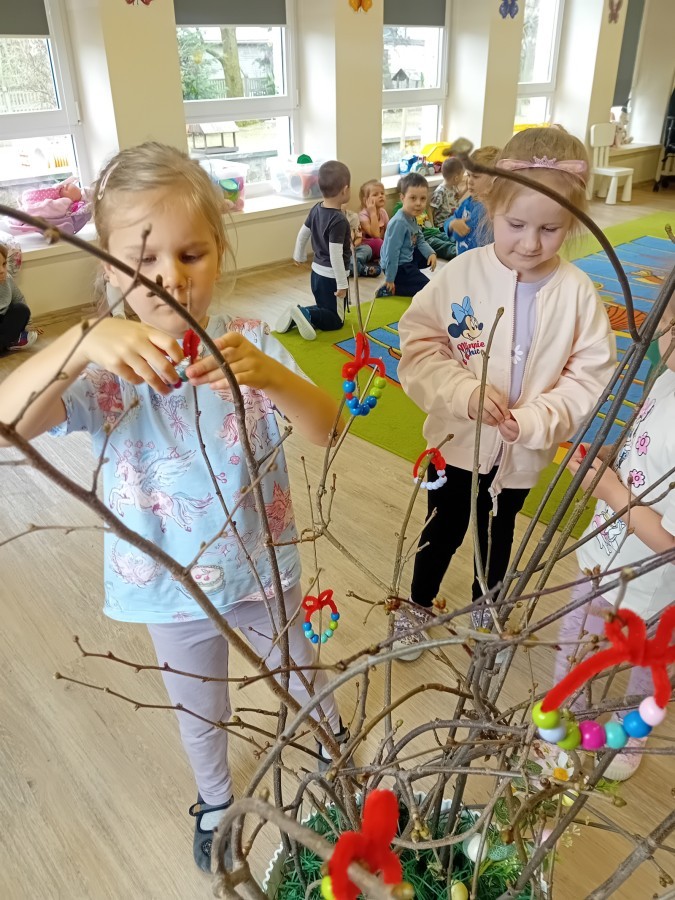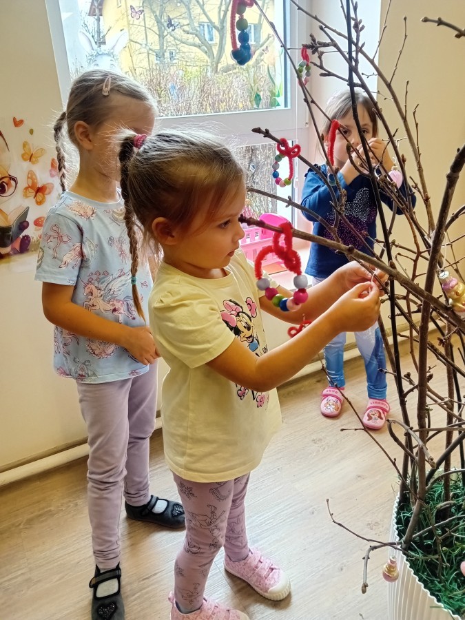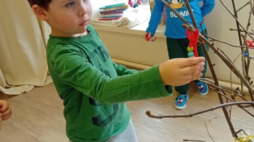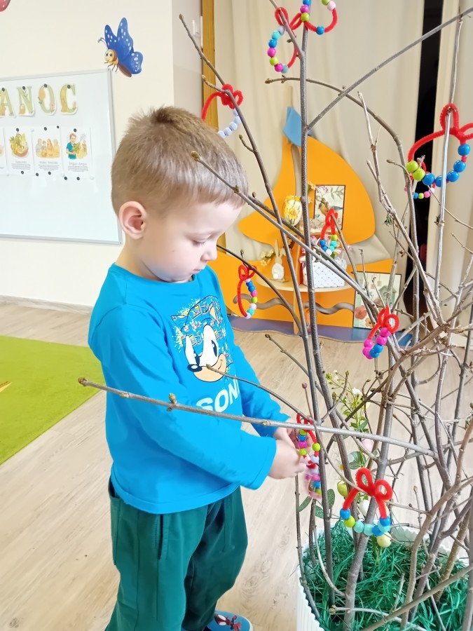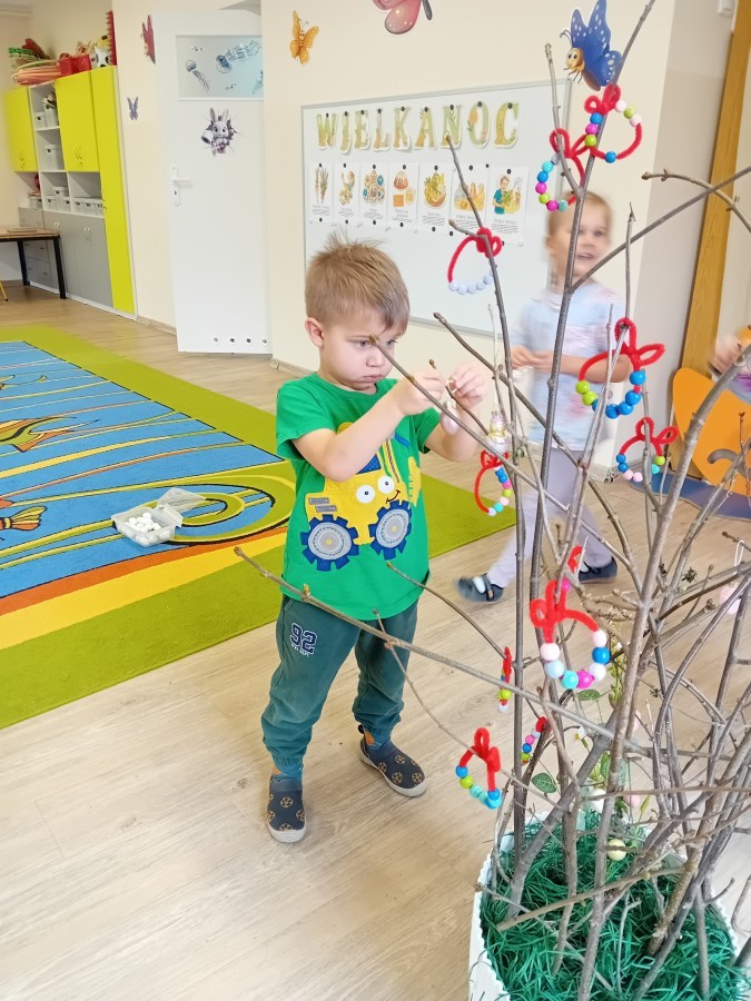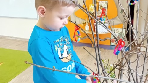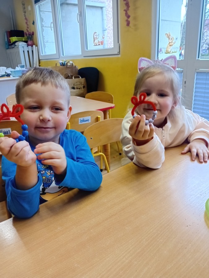 Nasze przedszkolaki z wielkim zaangażowaniem wyczarowały własnoręczne ozdoby – z kolorowych koralików powstały urocze wielkanocne zajączki, które wymagają nie lada cierpliwości i precyzji. Wspólnie zadbaliśmy też o świąteczny klimat w naszej sali, dekorując nasze wielkanocne drzewko.
