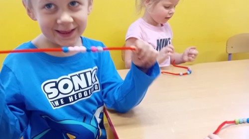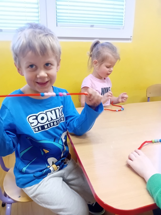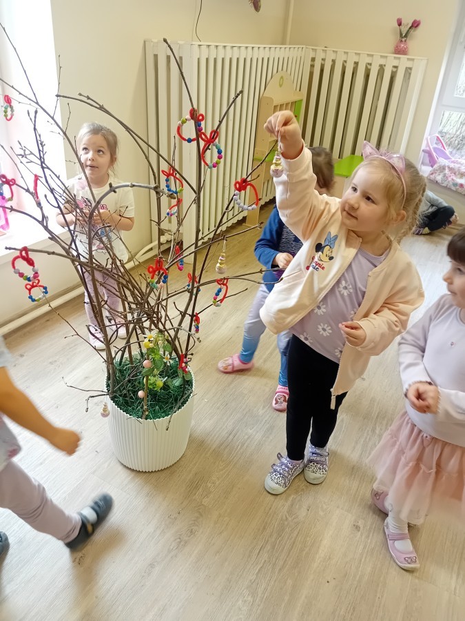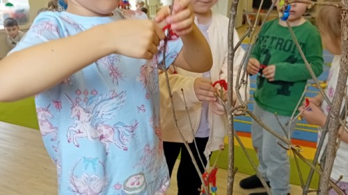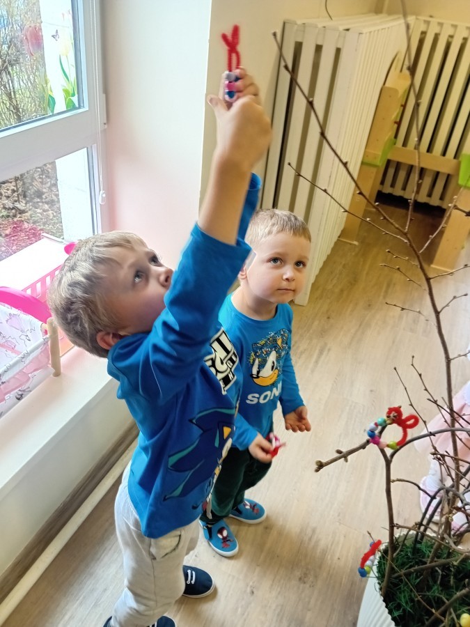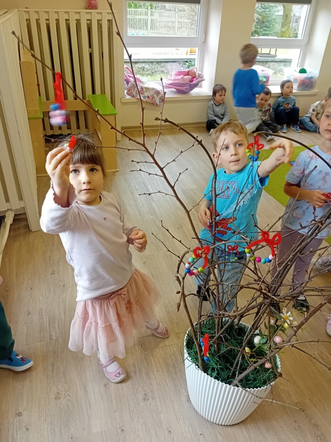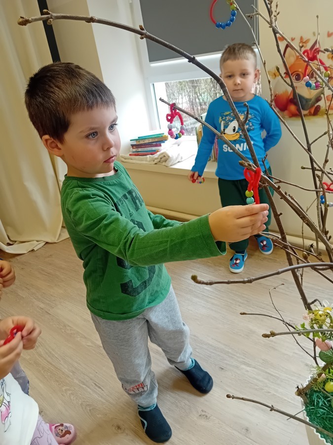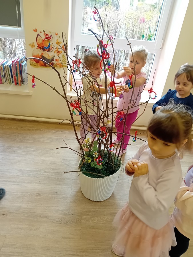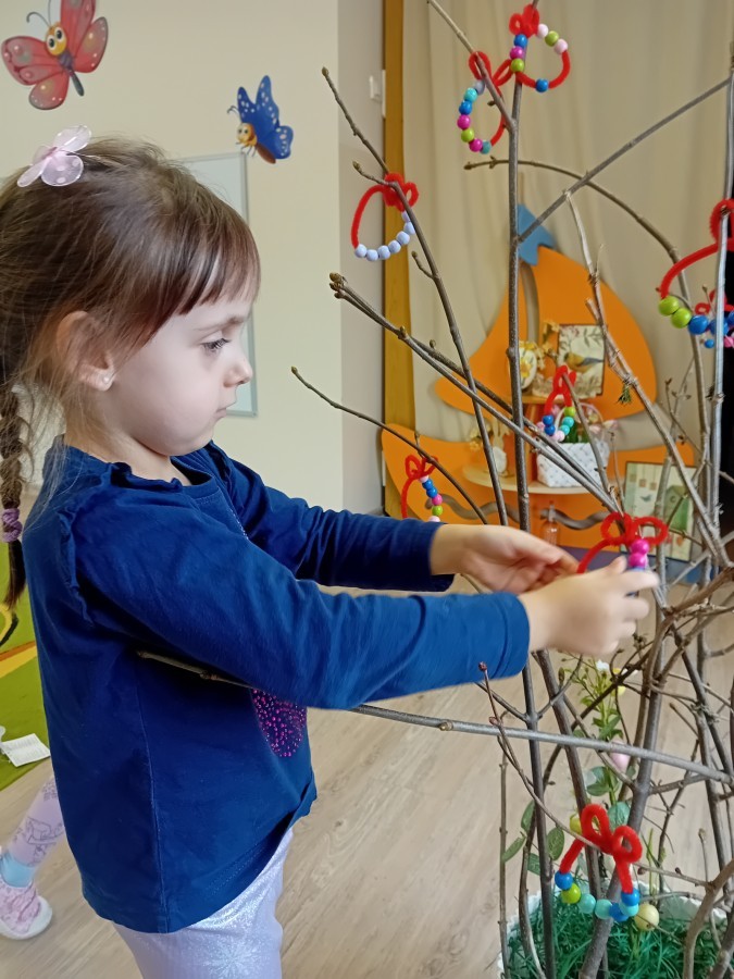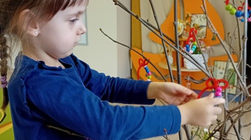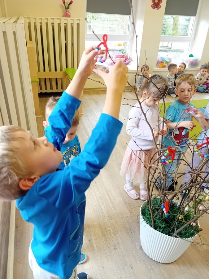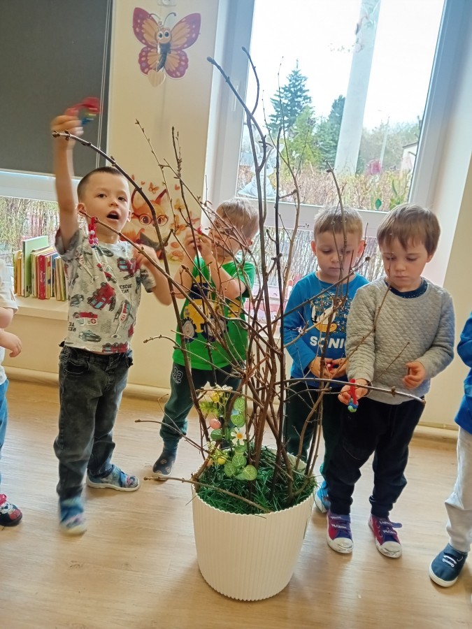 Nasze przedszkolaki z wielkim zaangażowaniem wyczarowały własnoręczne ozdoby – z kolorowych koralików powstały urocze wielkanocne zajączki, które wymagają nie lada cierpliwości i precyzji. Wspólnie zadbaliśmy też o świąteczny klimat w naszej sali, dekorując nasze wielkanocne drzewko.