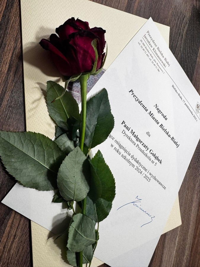Pani Małgosia odebrała nagrodę za osiągnięcia dydaktyczne i wychowawcze z rąk Pana Prezydenta Jarosława Klimaszewskiego. Pani Dyrektor wzorowo wypełnia swoje zadania i dzięki jej zaangażowaniu Nasza placówka cały czas się rozwija.