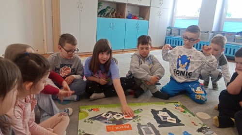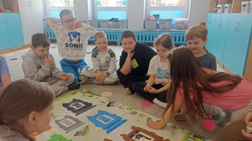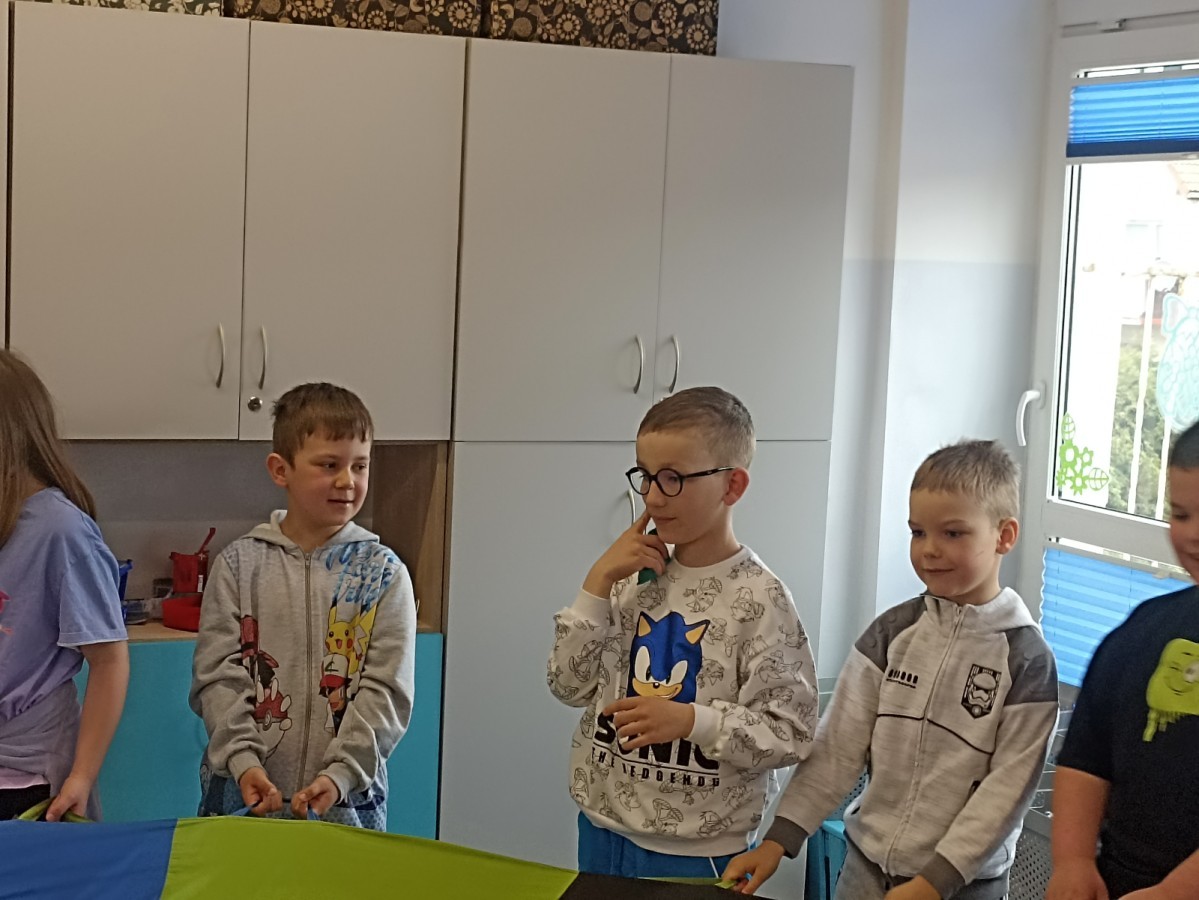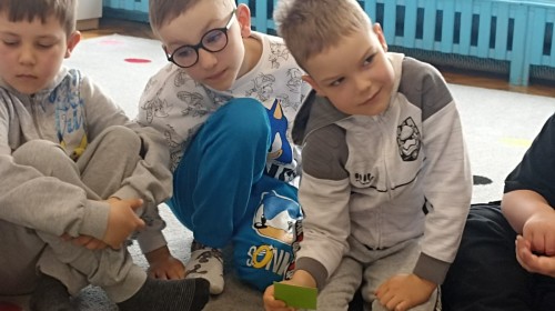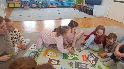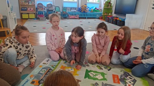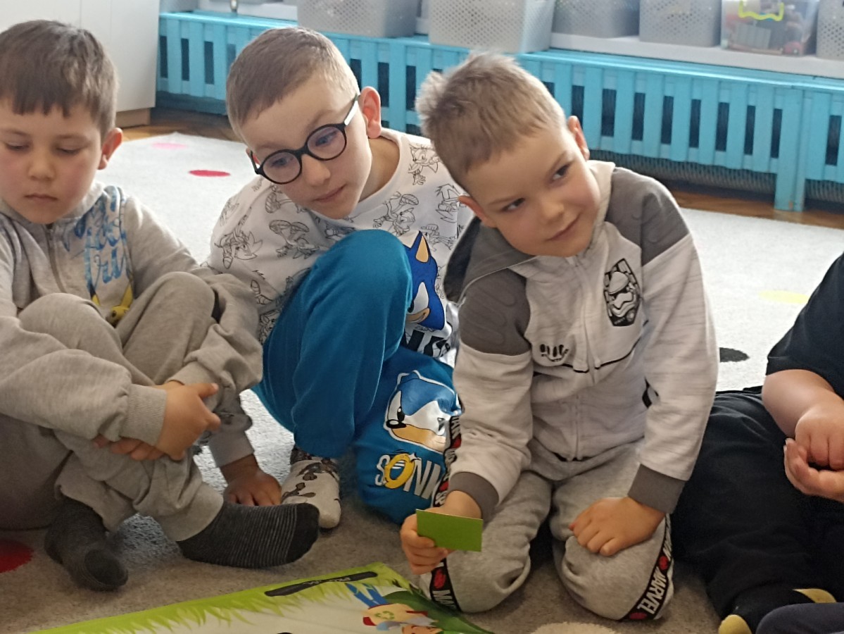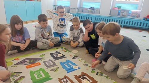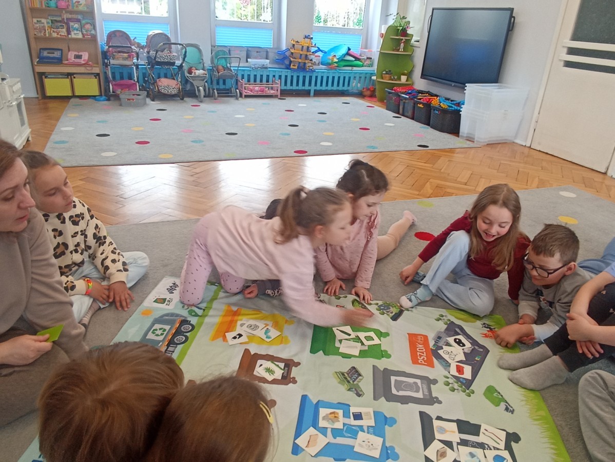 Pani edukatorka w ciekawy sposób opowiedziała o procesie recyklingu, a następnie zaprosiła przedszkolaki do wspólnej zabawy. Dzieci miały okazję sprawdzić swoją wiedzę w praktyce, dopasowując różne przedmioty do odpowiednich kolorów pojemników. To był dzień pełen nauki i świetnej zabawy!