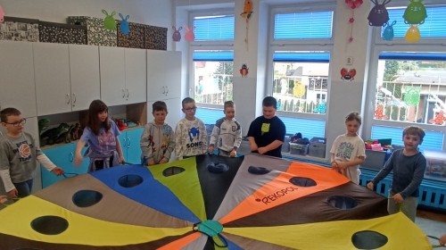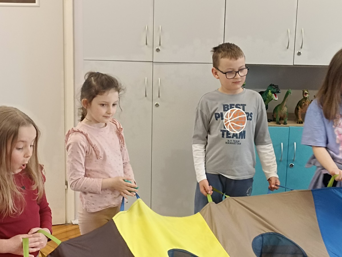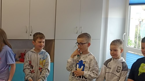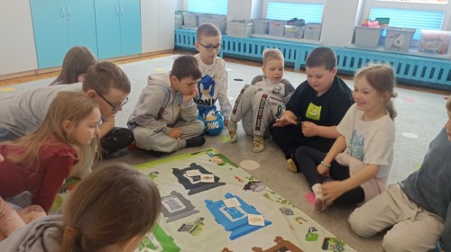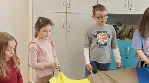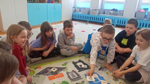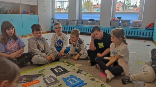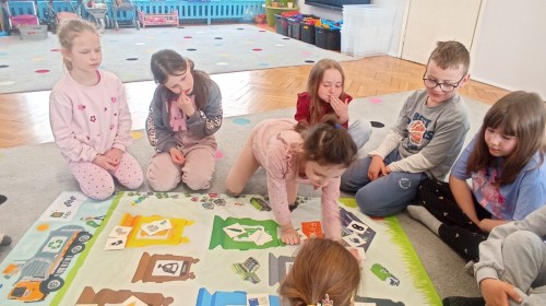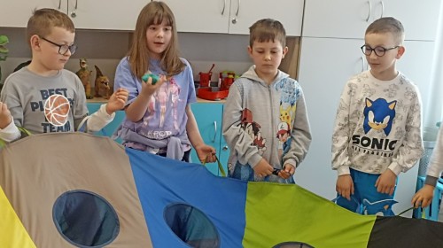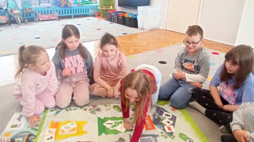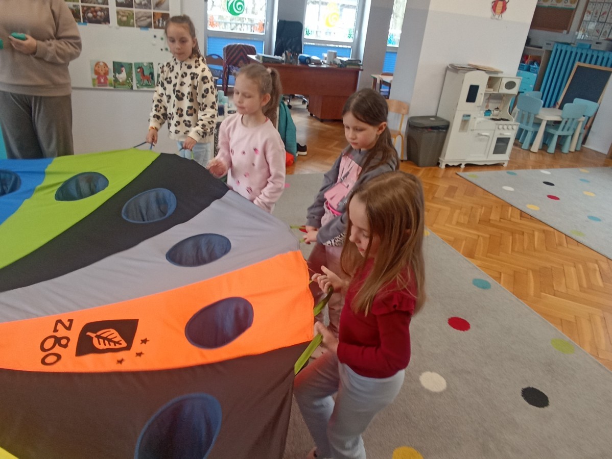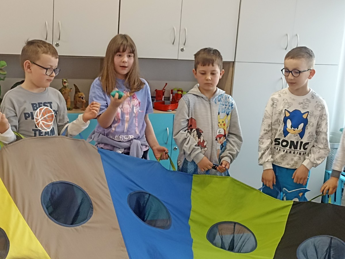 Pani edukatorka w ciekawy sposób opowiedziała o procesie recyklingu, a następnie zaprosiła przedszkolaki do wspólnej zabawy. Dzieci miały okazję sprawdzić swoją wiedzę w praktyce, dopasowując różne przedmioty do odpowiednich kolorów pojemników. To był dzień pełen nauki i świetnej zabawy!