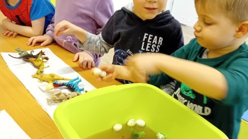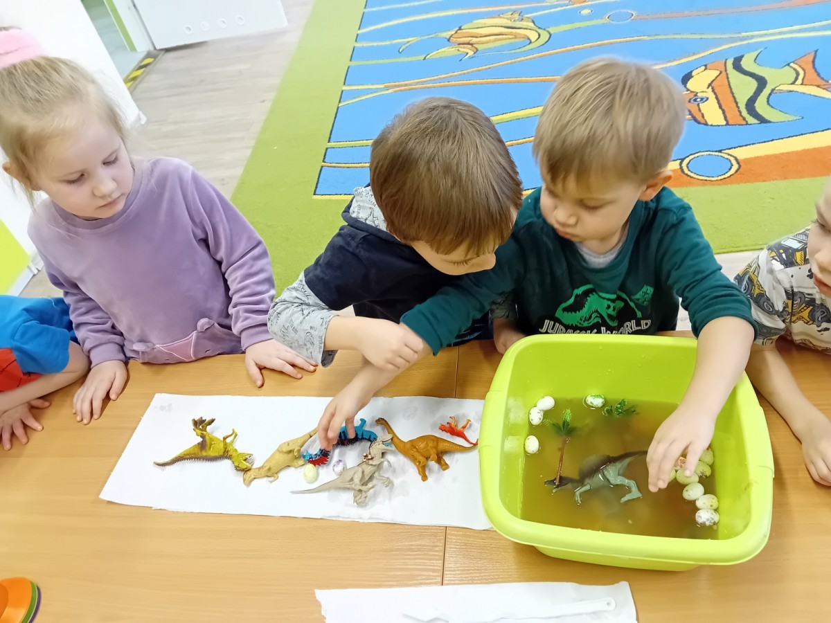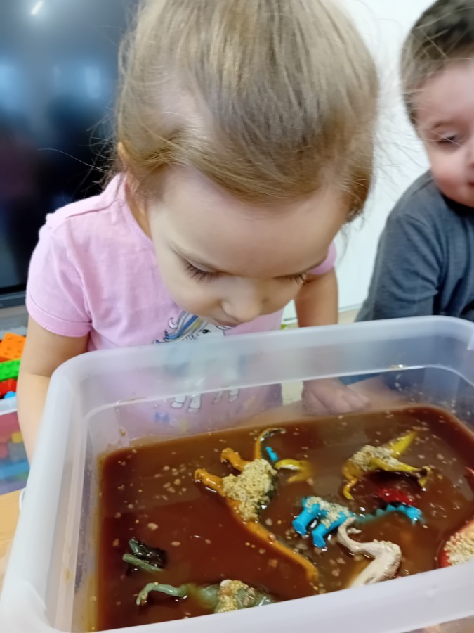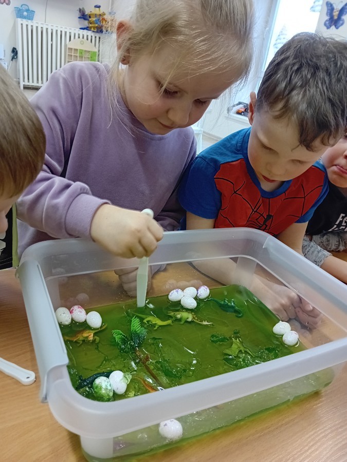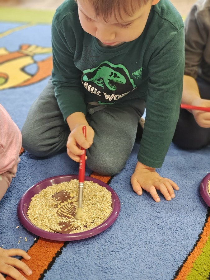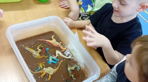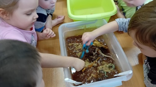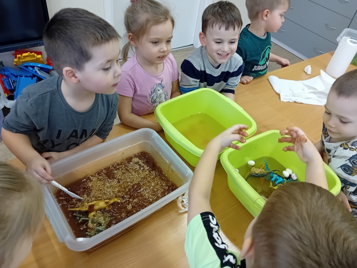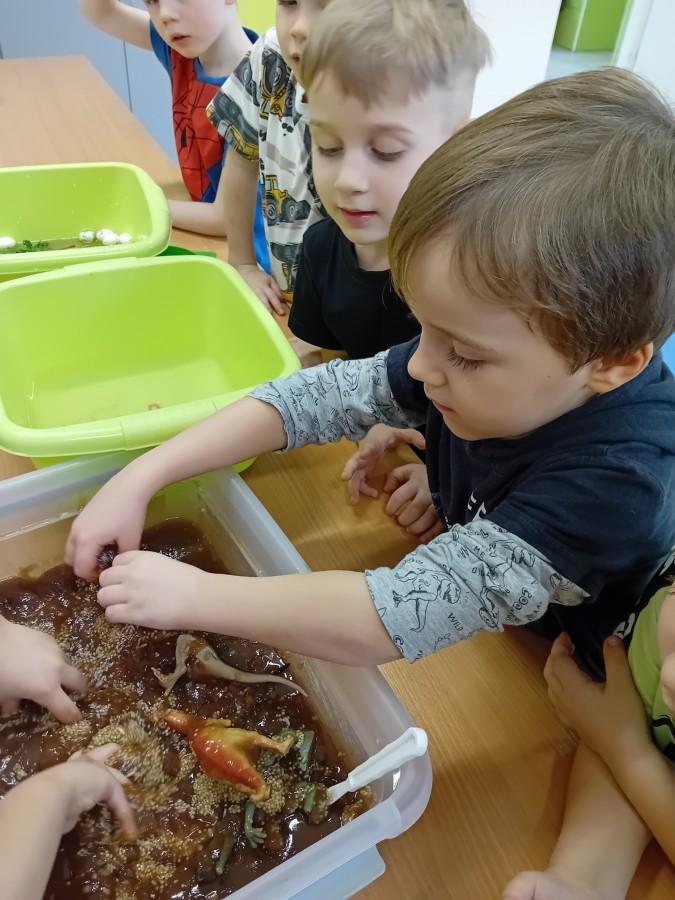 W naszej grupie odbyły się niezwykłe zajęcia sensoryczne – dzieci zamieniły się w paleontologów i szukały dinozaurów ukrytych w rozmaitych masach!