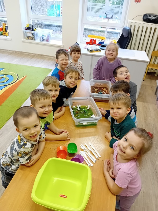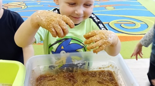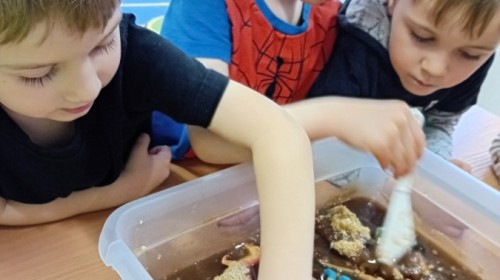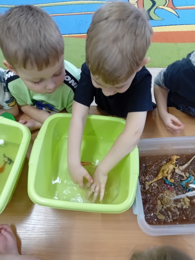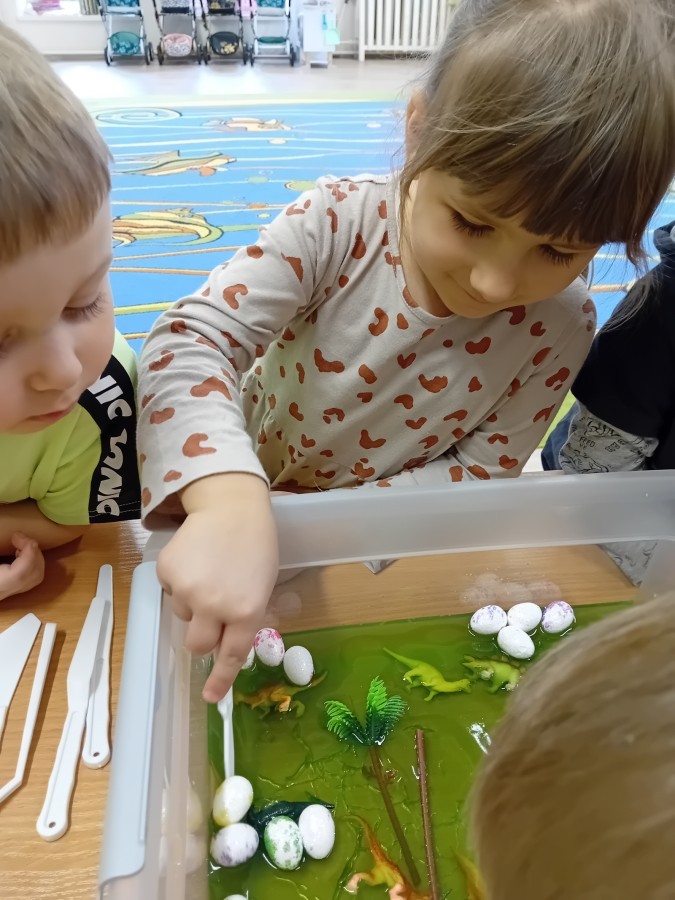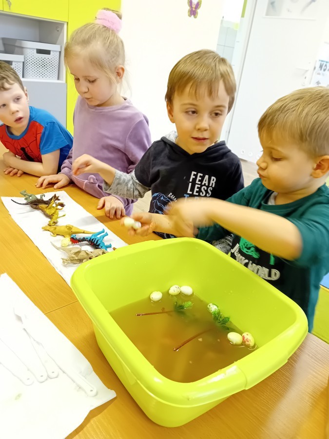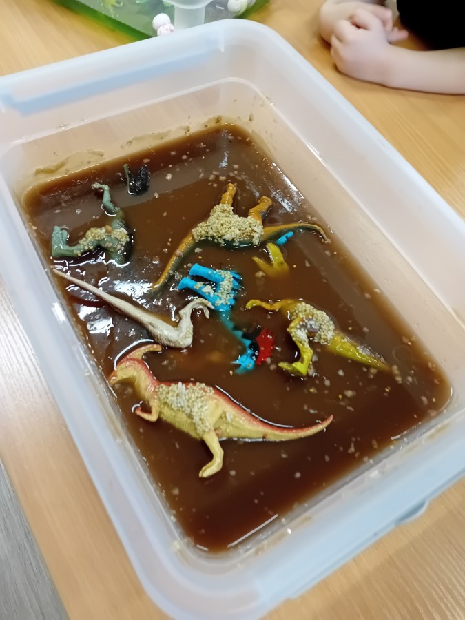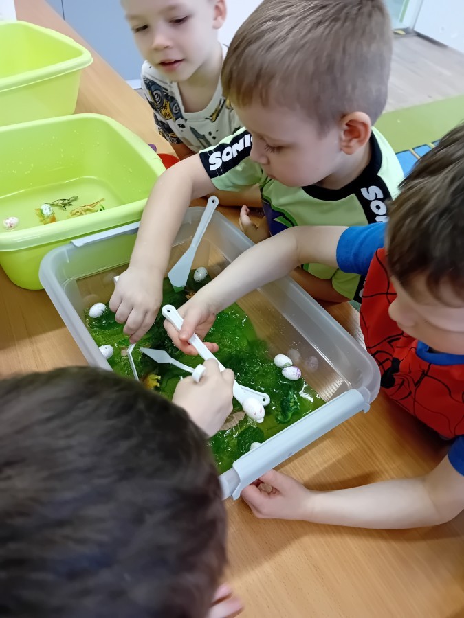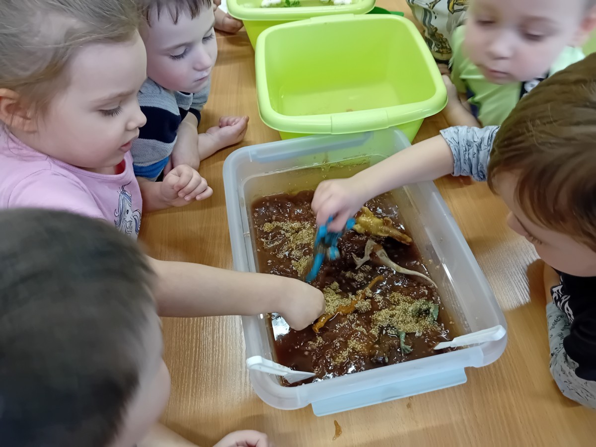 W naszej grupie odbyły się niezwykłe zajęcia sensoryczne – dzieci zamieniły się w paleontologów i szukały dinozaurów ukrytych w rozmaitych masach!
