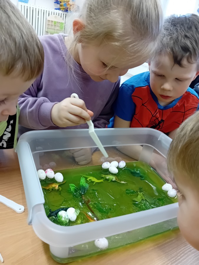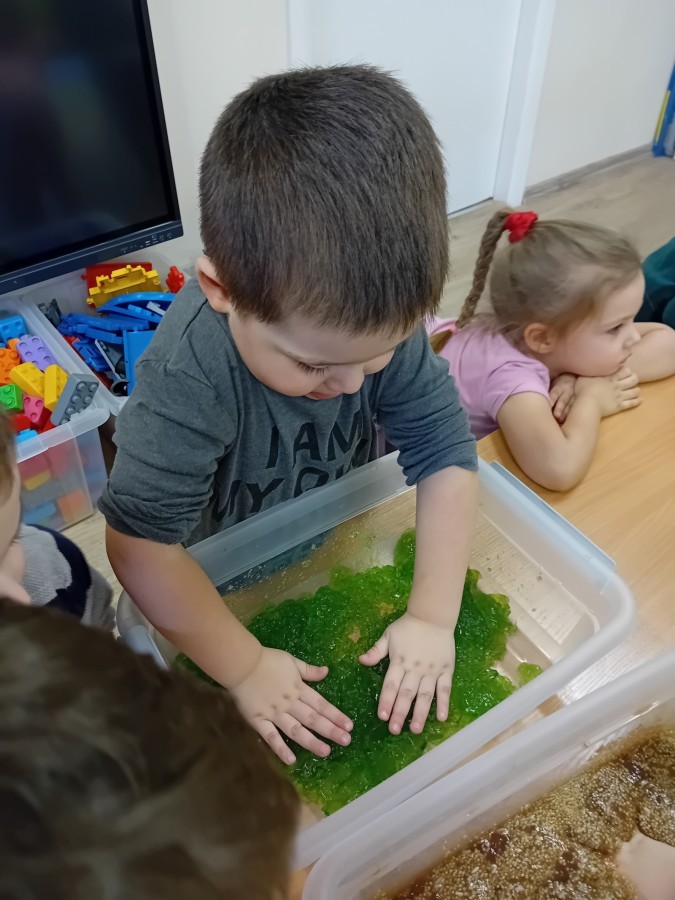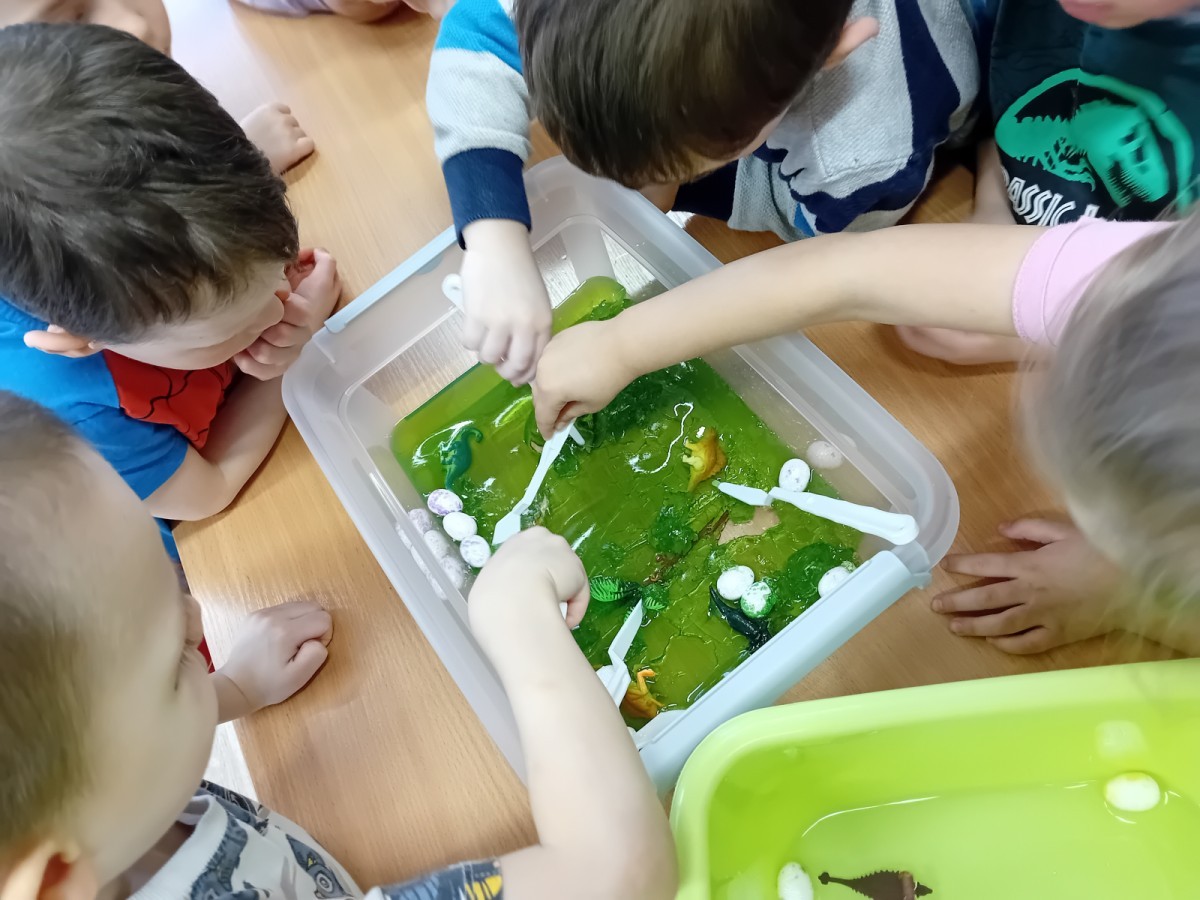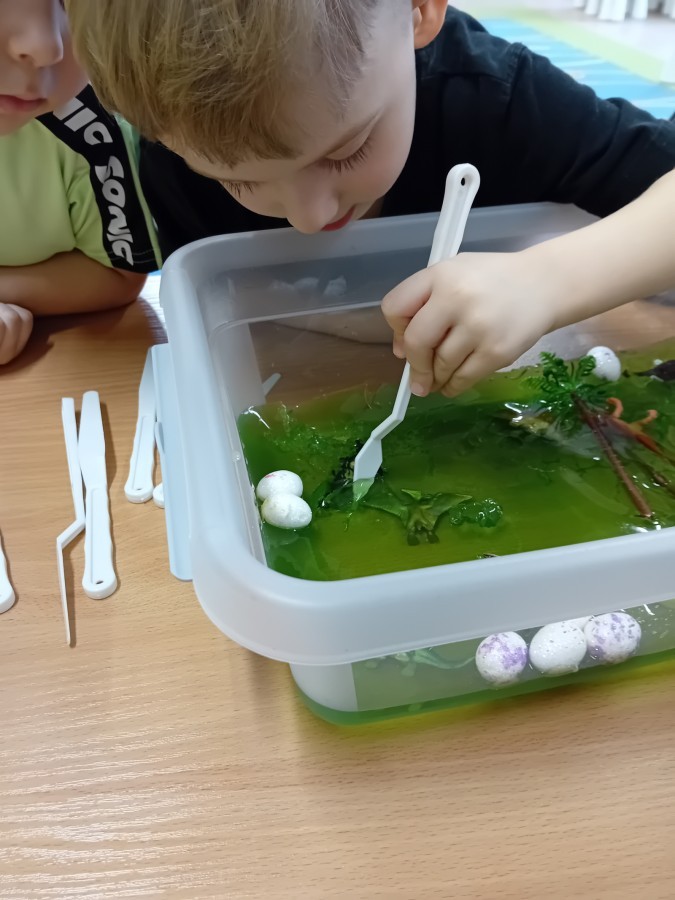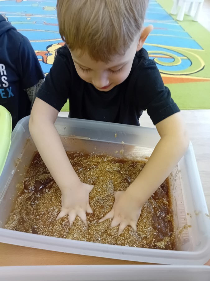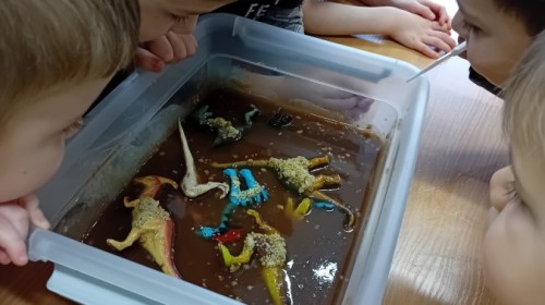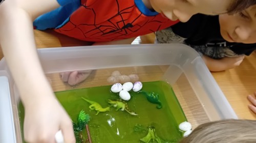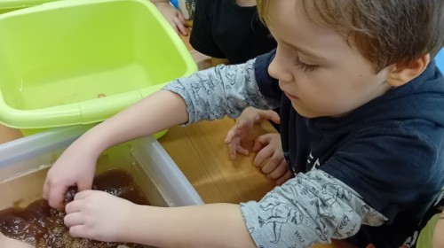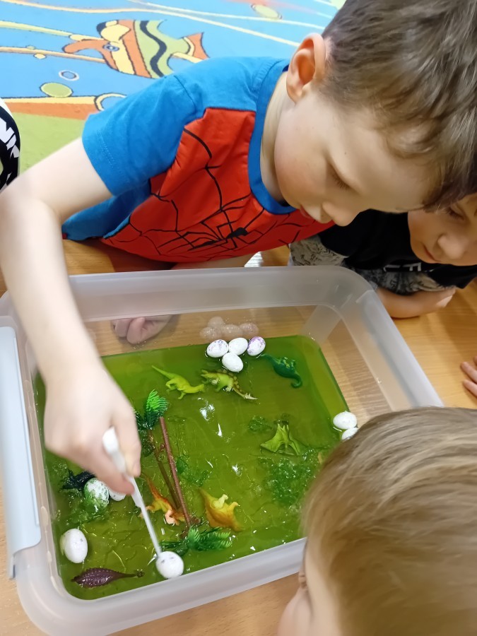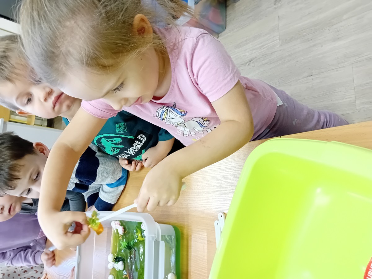 W naszej grupie odbyły się niezwykłe zajęcia sensoryczne – dzieci zamieniły się w paleontologów i szukały dinozaurów ukrytych w rozmaitych masach!