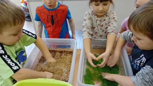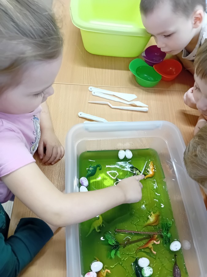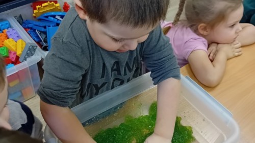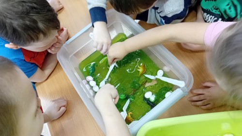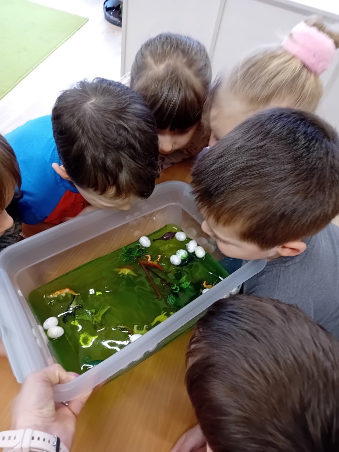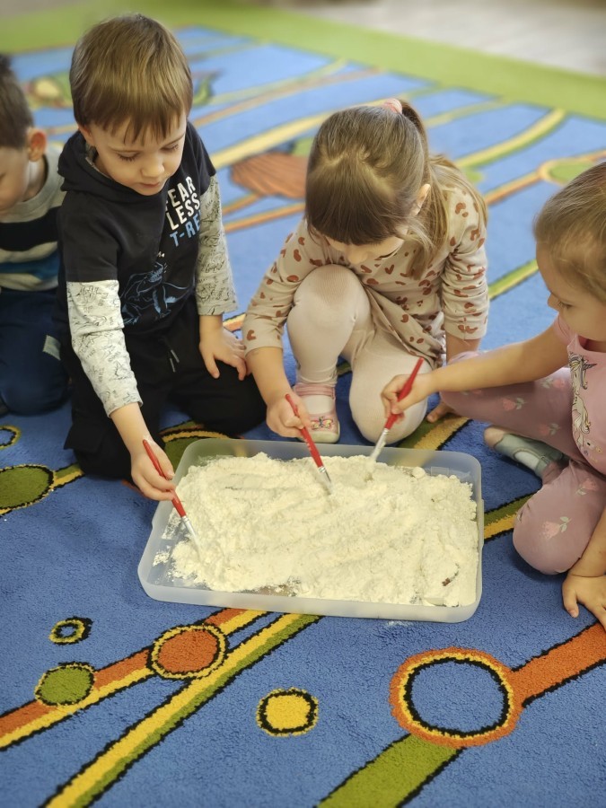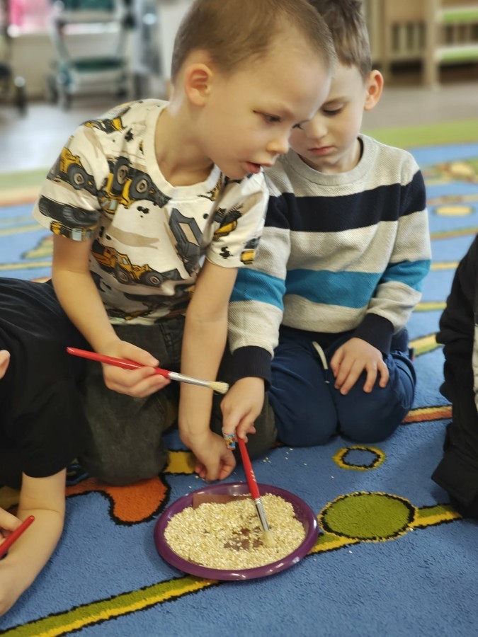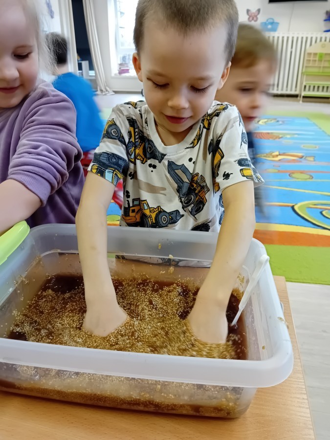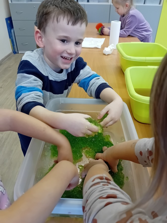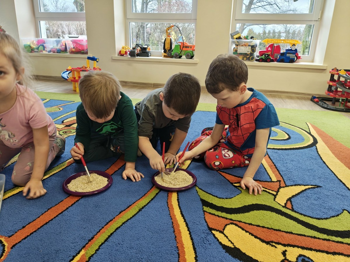 W naszej grupie odbyły się niezwykłe zajęcia sensoryczne – dzieci zamieniły się w paleontologów i szukały dinozaurów ukrytych w rozmaitych masach!