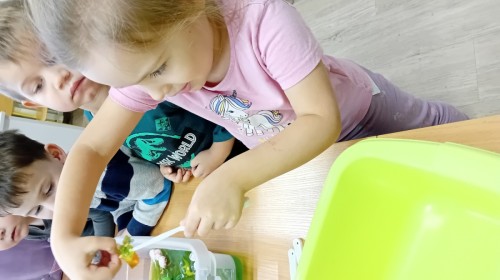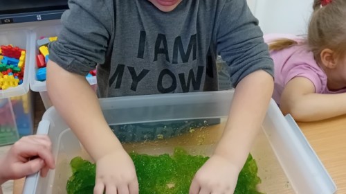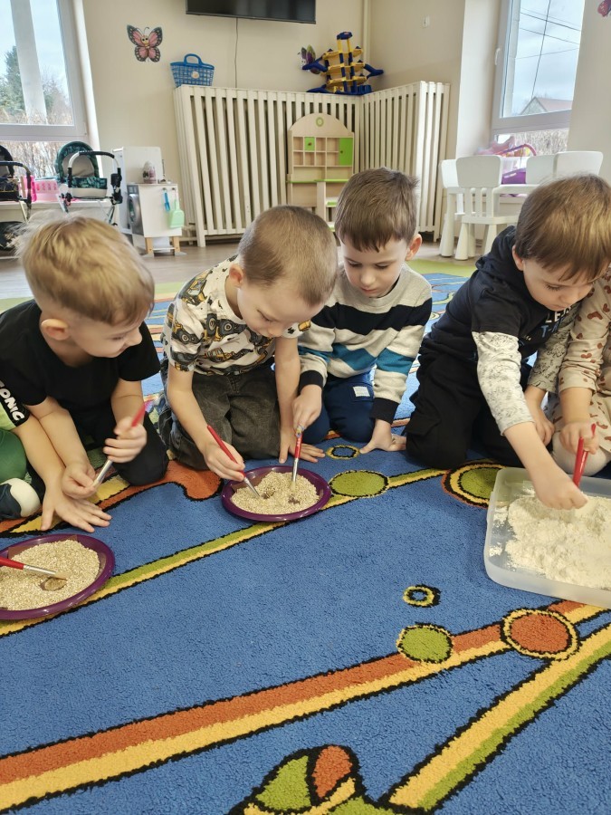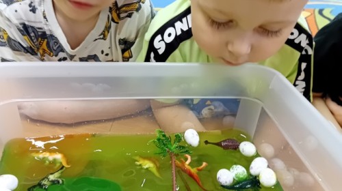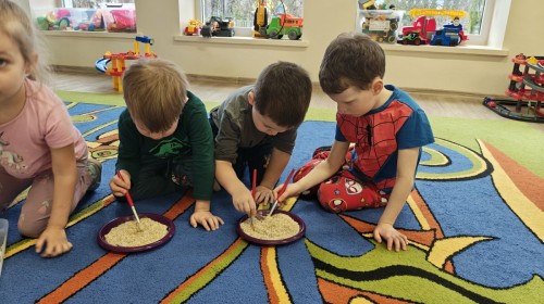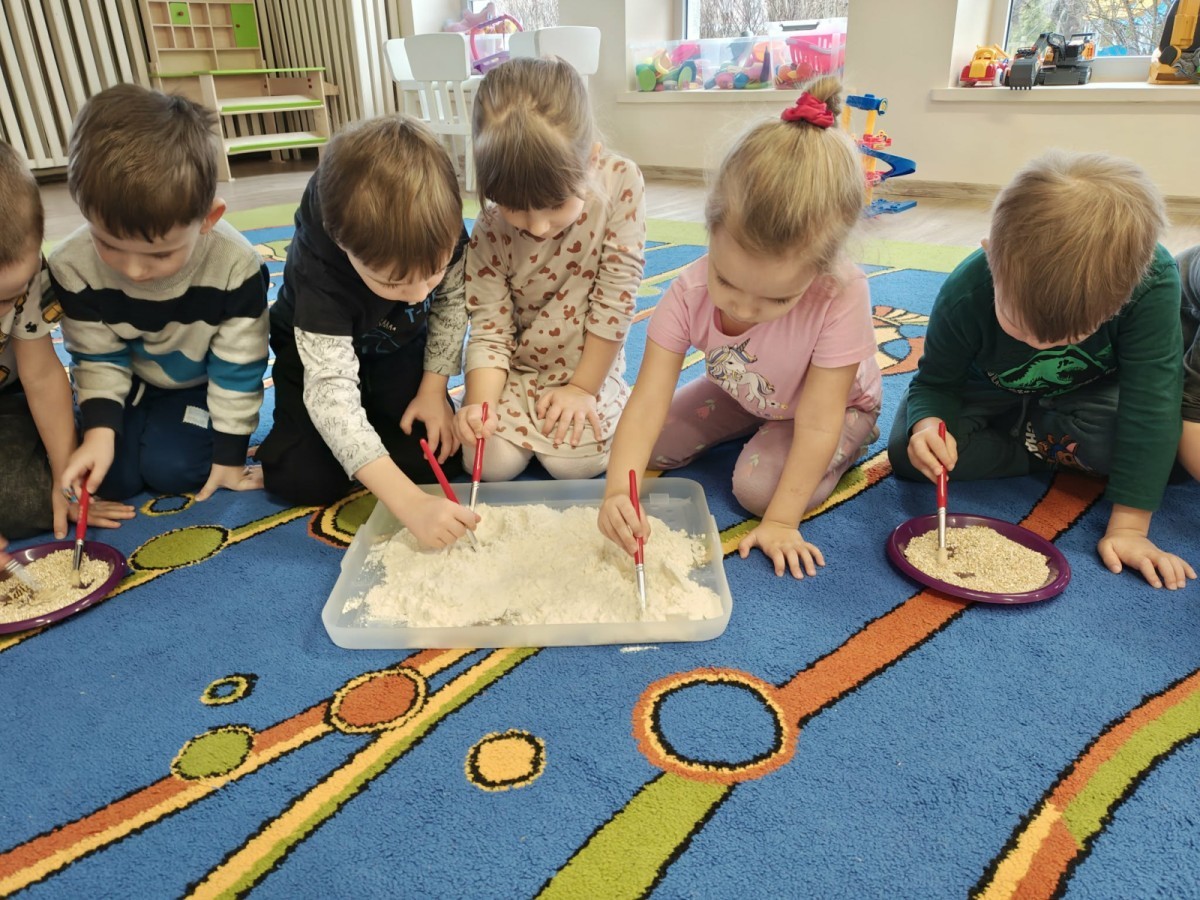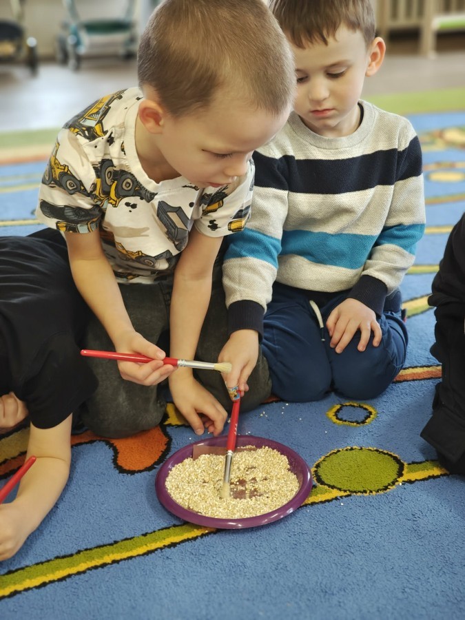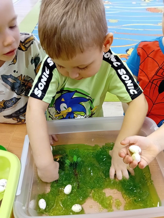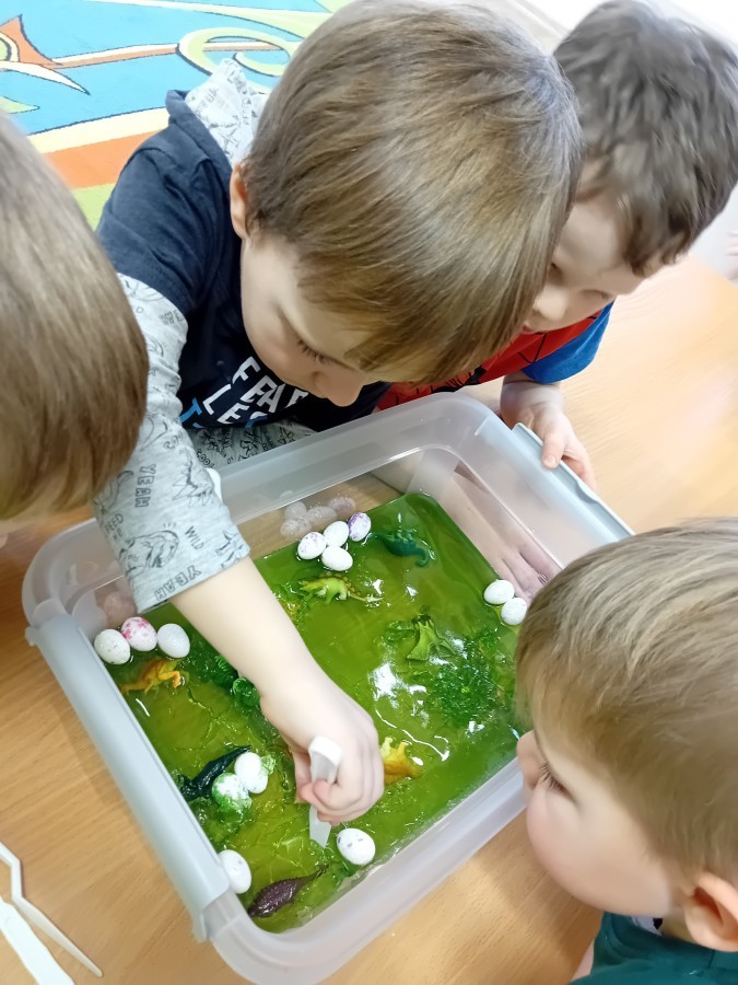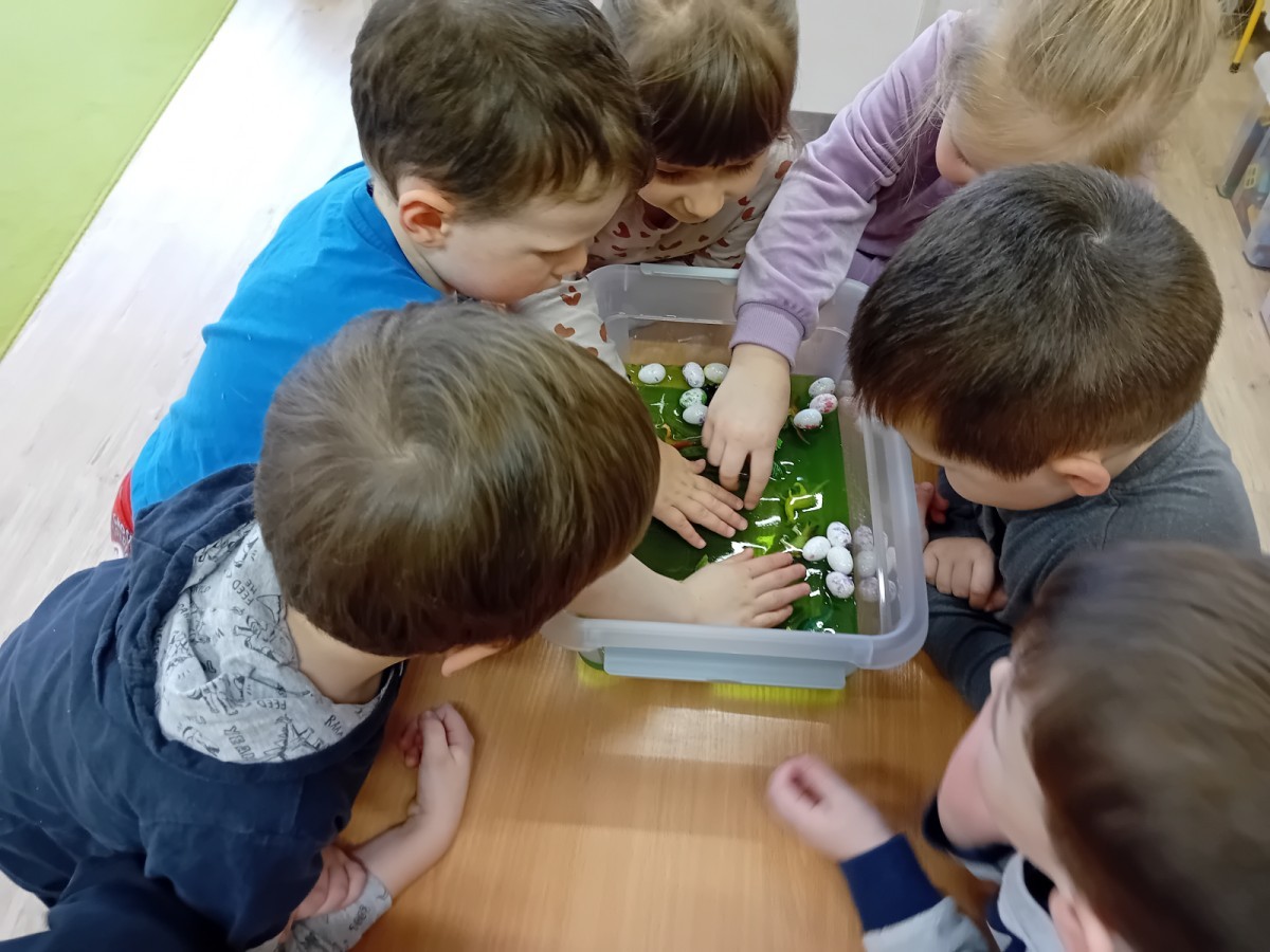 W naszej grupie odbyły się niezwykłe zajęcia sensoryczne – dzieci zamieniły się w paleontologów i szukały dinozaurów ukrytych w rozmaitych masach!