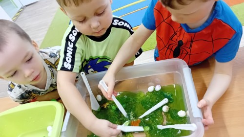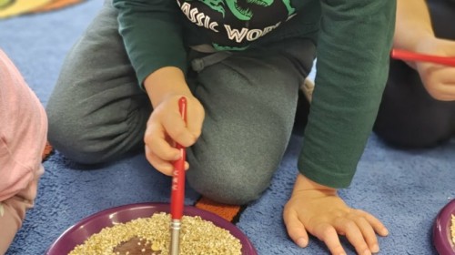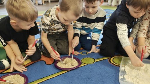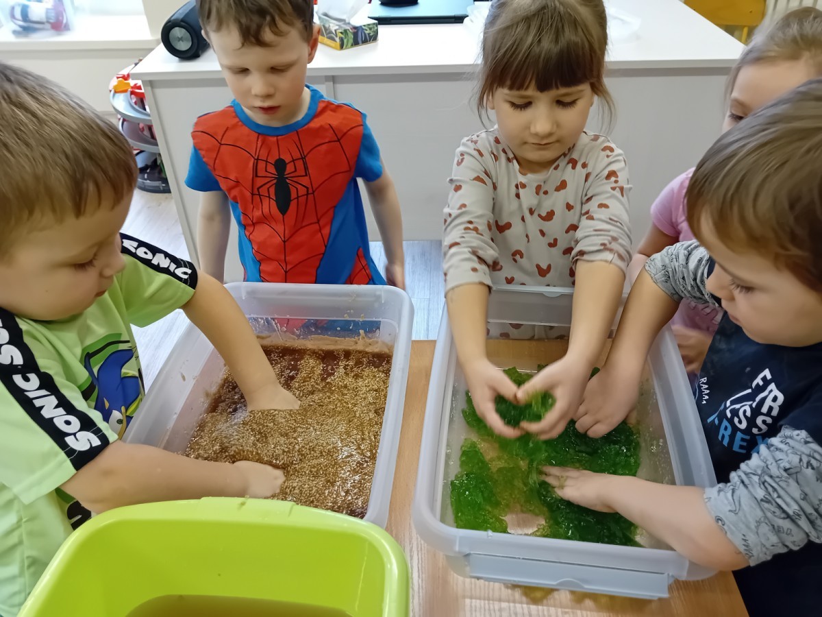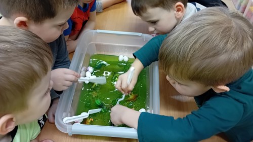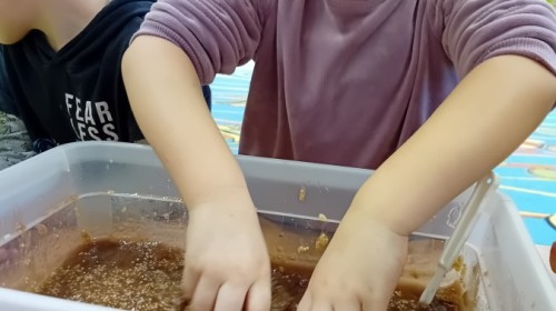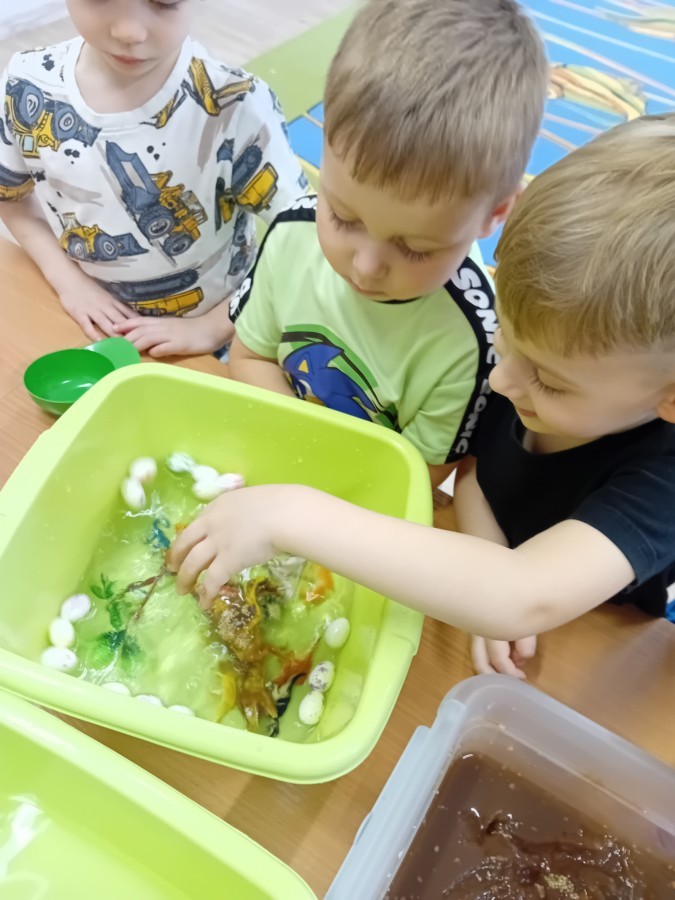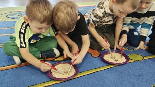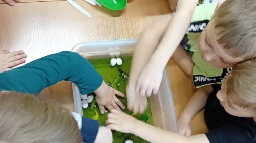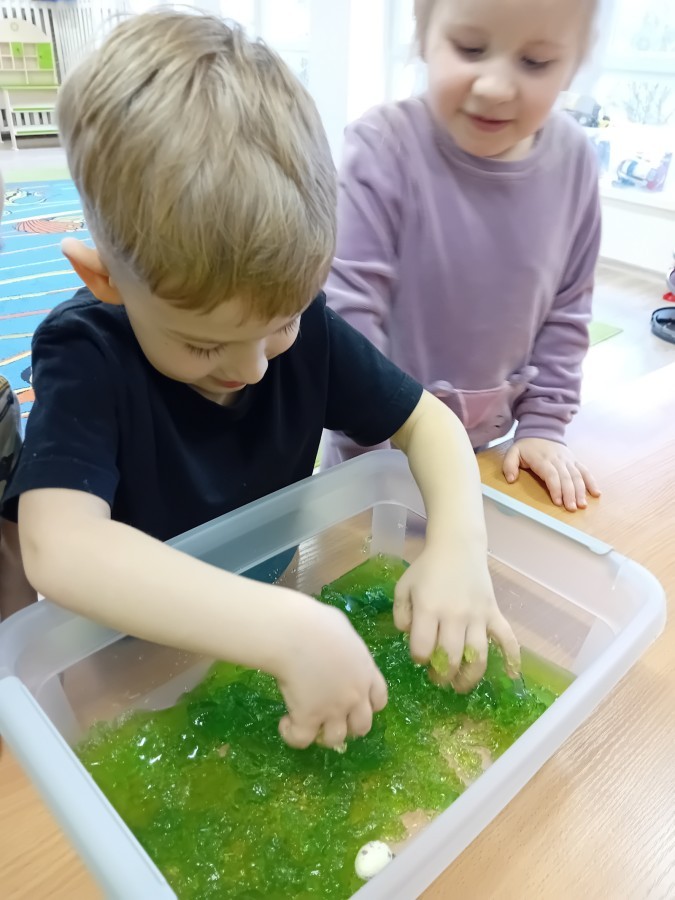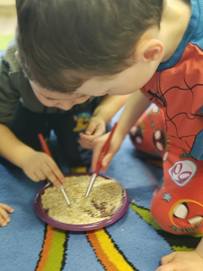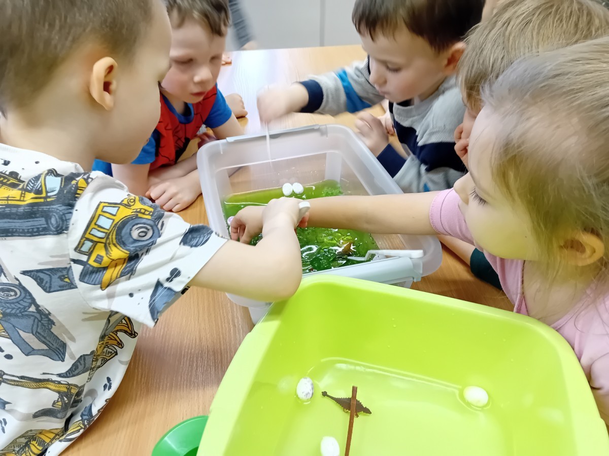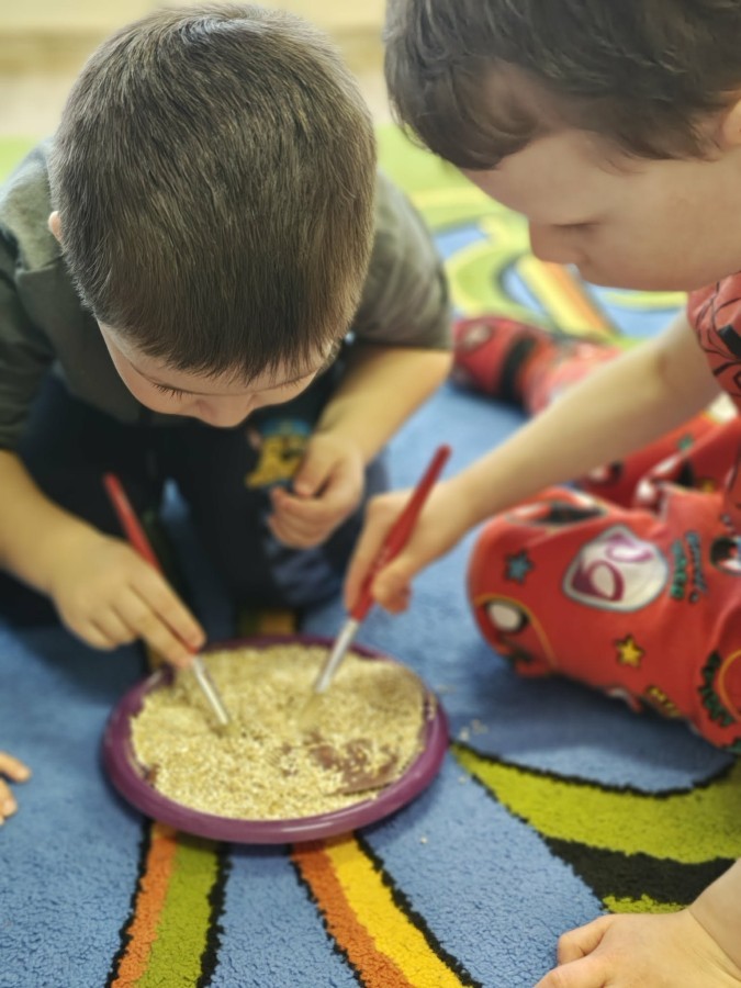 W naszej grupie odbyły się niezwykłe zajęcia sensoryczne – dzieci zamieniły się w paleontologów i szukały dinozaurów ukrytych w rozmaitych masach!