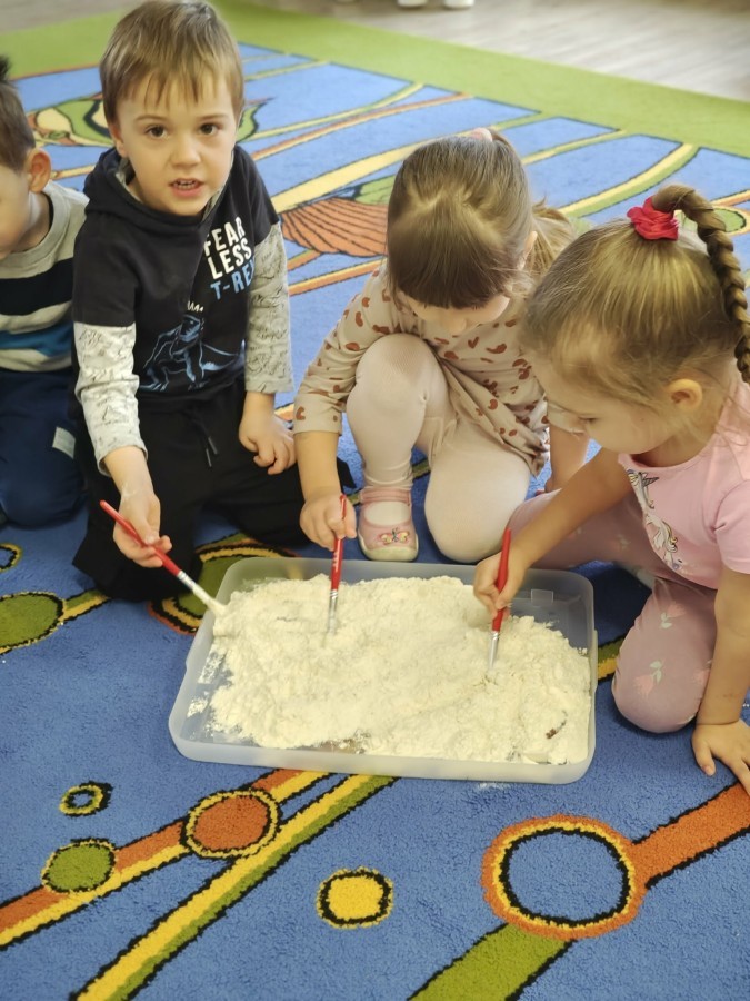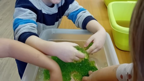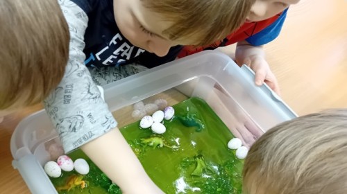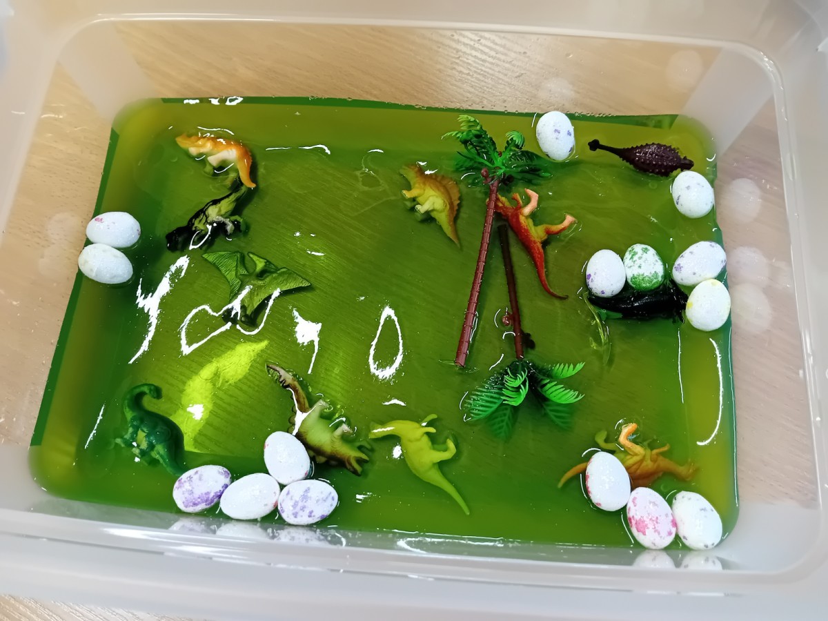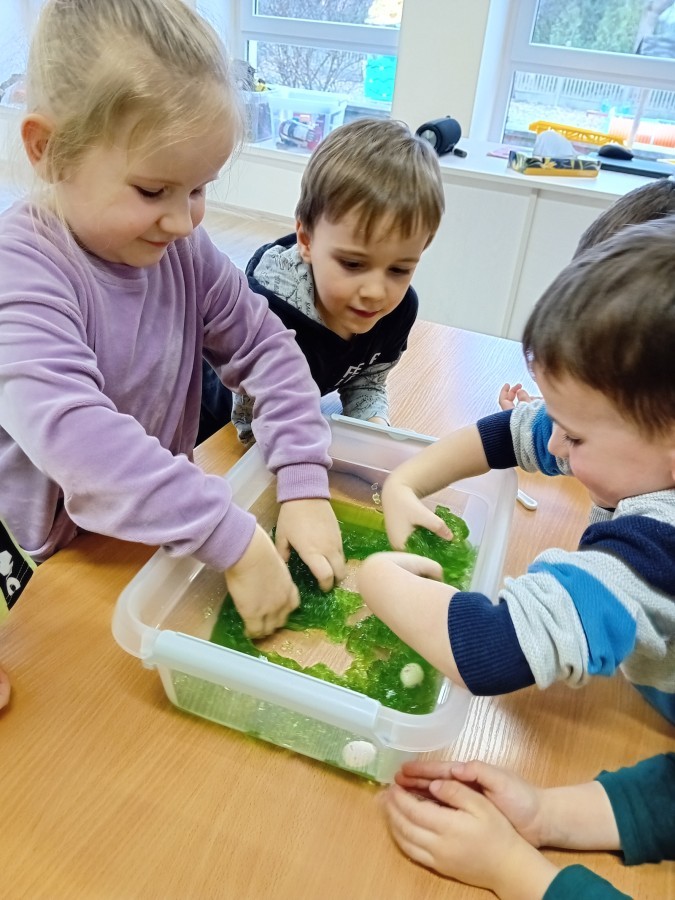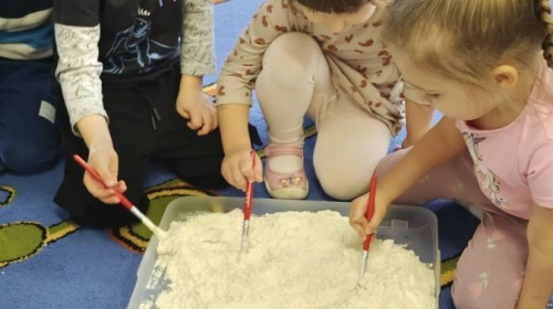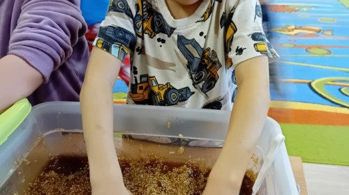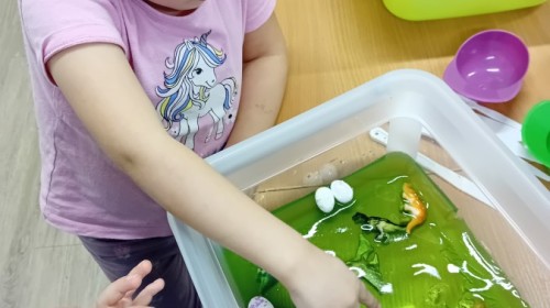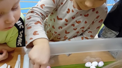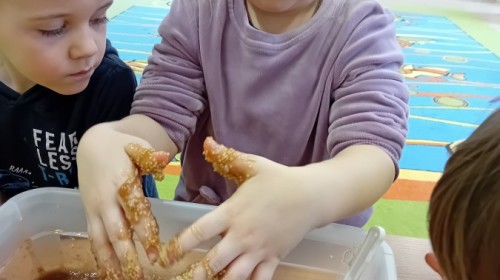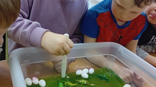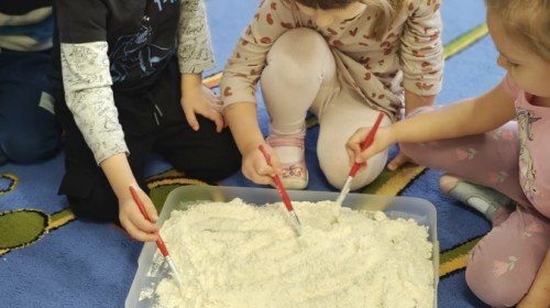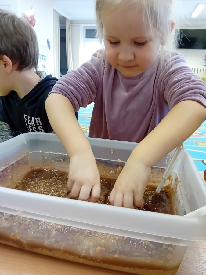 Małe rączki dzielnie szukały dinozaurów w galaretce, lepkim budyniu z kaszą oraz puszystej mące. Poprzez taką zabawę średniaki nie tylko odkrywały prehistoryczny świat, ale przede wszystkim stymulowały zmysł dotyku i ćwiczyła sprawność dłoni.