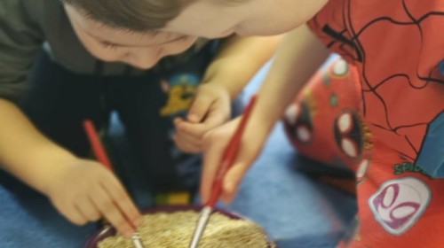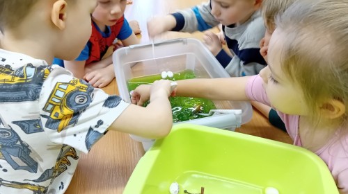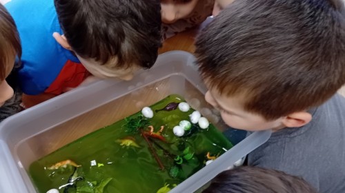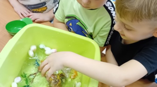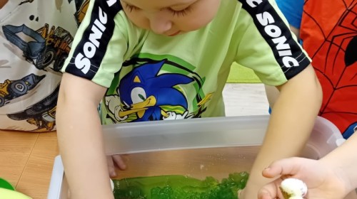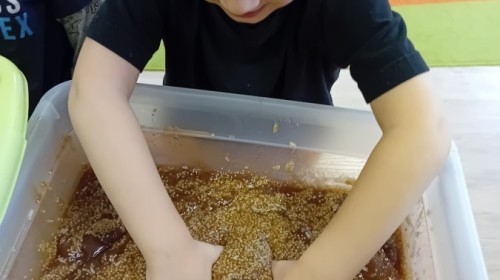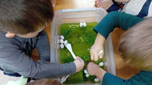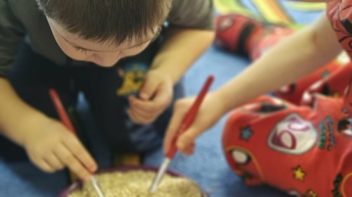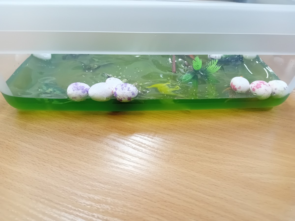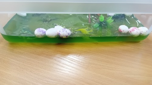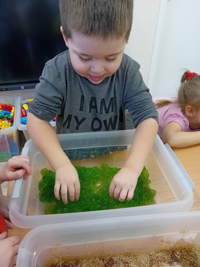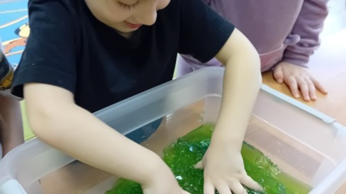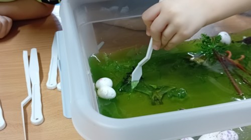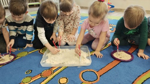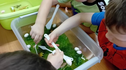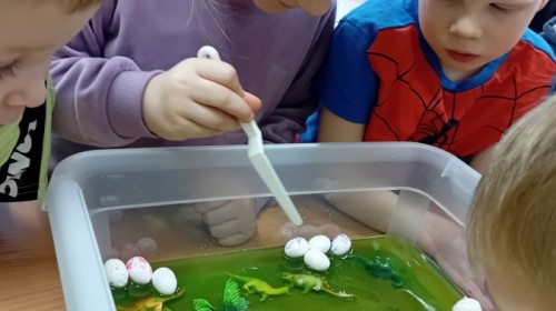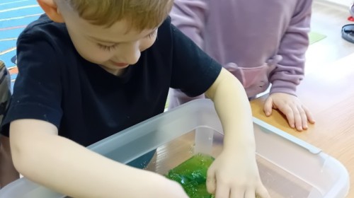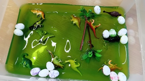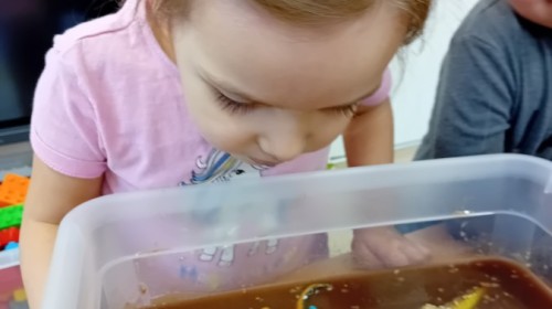 Małe rączki dzielnie szukały dinozaurów w galaretce, lepkim budyniu z kaszą oraz puszystej mące. Poprzez taką zabawę średniaki nie tylko odkrywały prehistoryczny świat, ale przede wszystkim stymulowały zmysł dotyku i ćwiczyła sprawność dłoni.