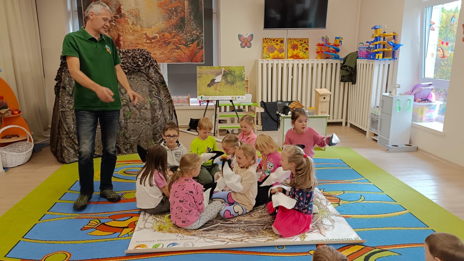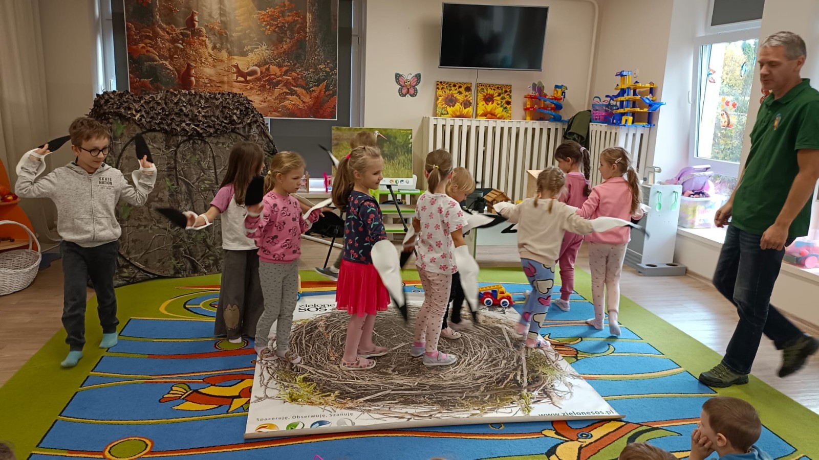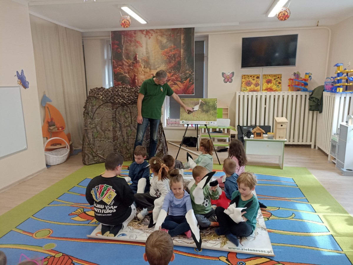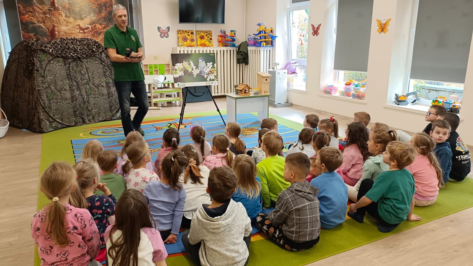 28 października przedszkole gościło ornitologa, prawdziwego znawcę ptaków. To wyjątkowe spotkanie było doskonałą okazją, by pogłębić wiedzę o skrzydlatych mieszkańcach naszej okolicy. Spotkanie było pełne ciekawostek, dzięki którym dzieci dowiedziały się, jak wyglądają, czym się różnią i jak spędzają czas różne ptaki.Odkryły Sekret Zdrowego Dokarmiania - kluczowym elementem edukacji były zasady pomocy ptakom zimą. Pan ornitolog stanowczo podkreślił, że chleb i pieczywo są dla ludzi, natomiast ptasią dietę powinny stanowić ziarna (np. słonecznik) lub owoce (np. jabłka). Była to cenna lekcja odpowiedzialności za przyrodę.