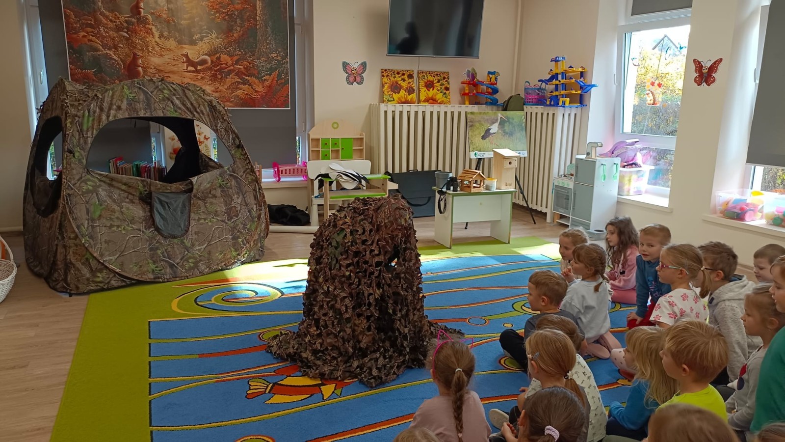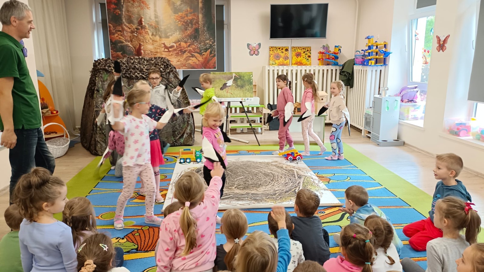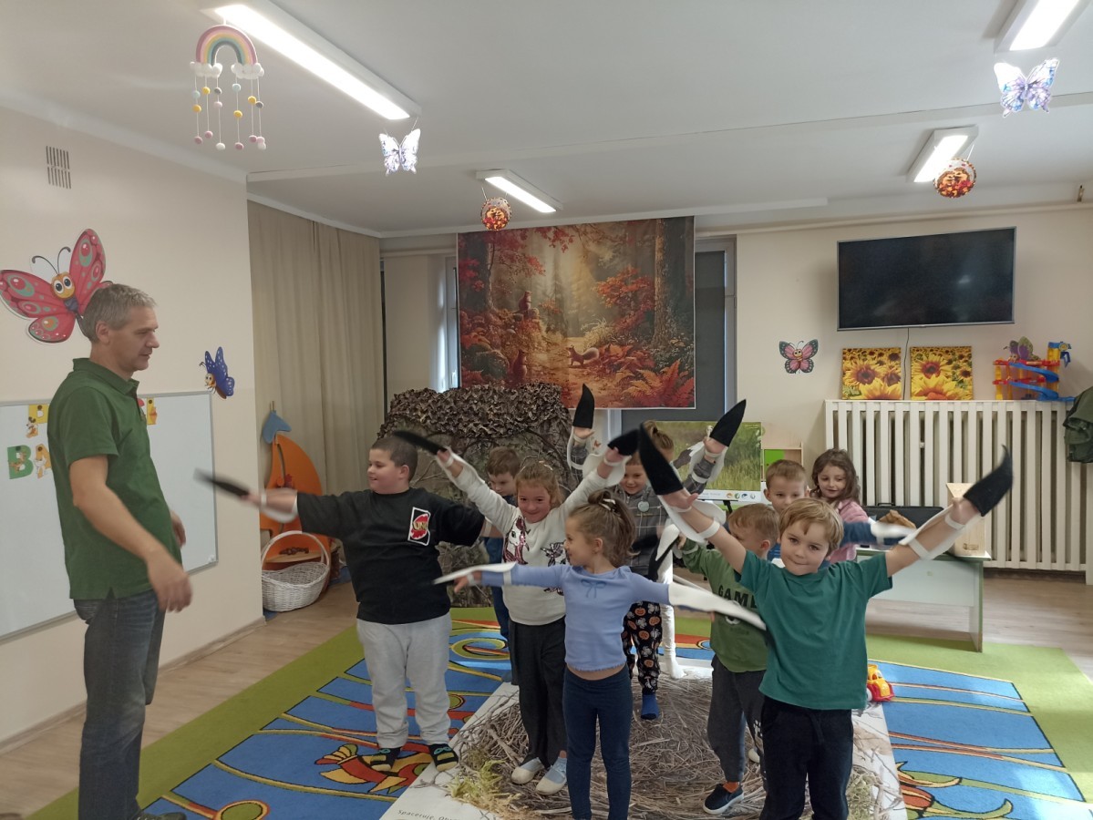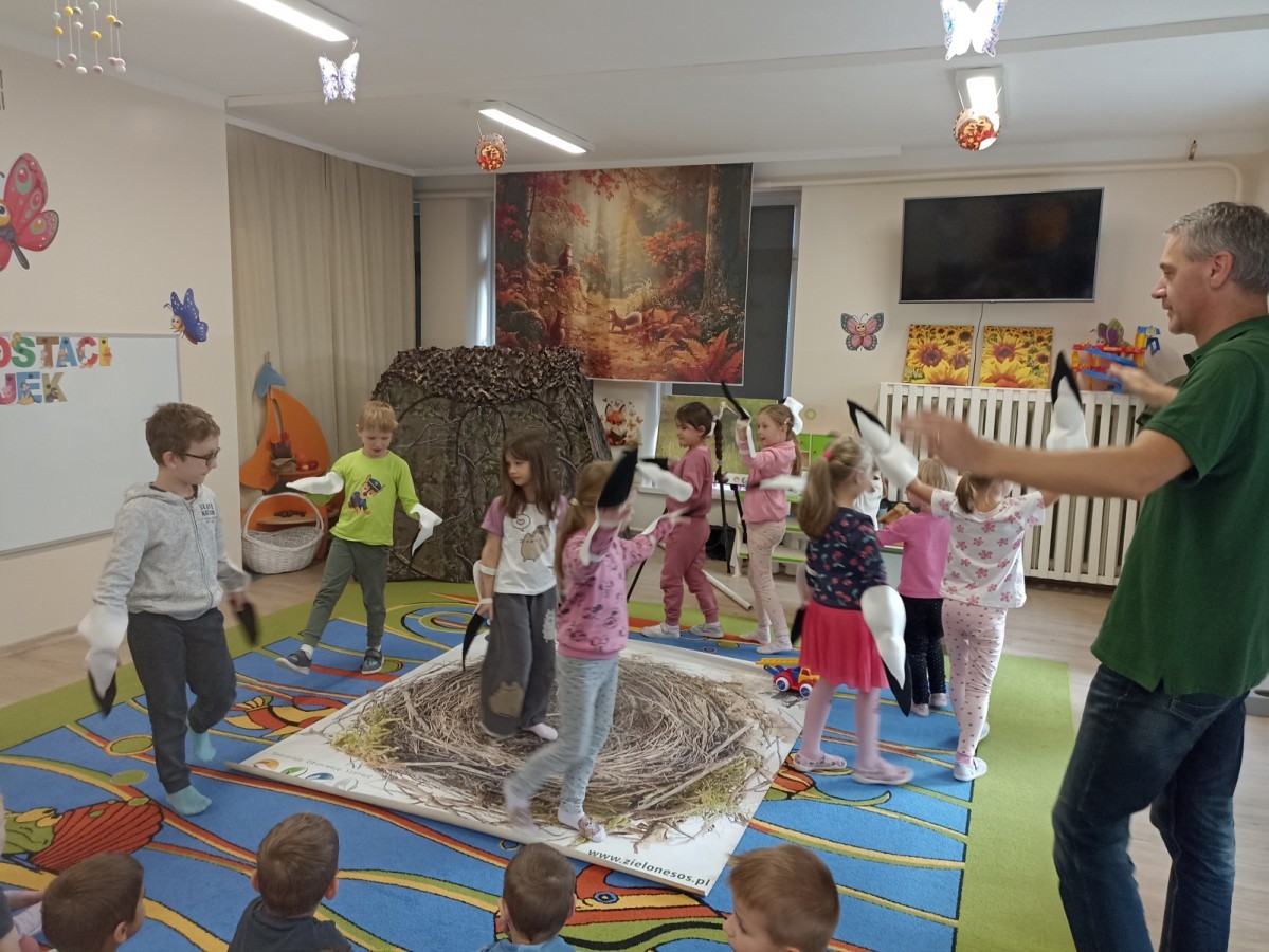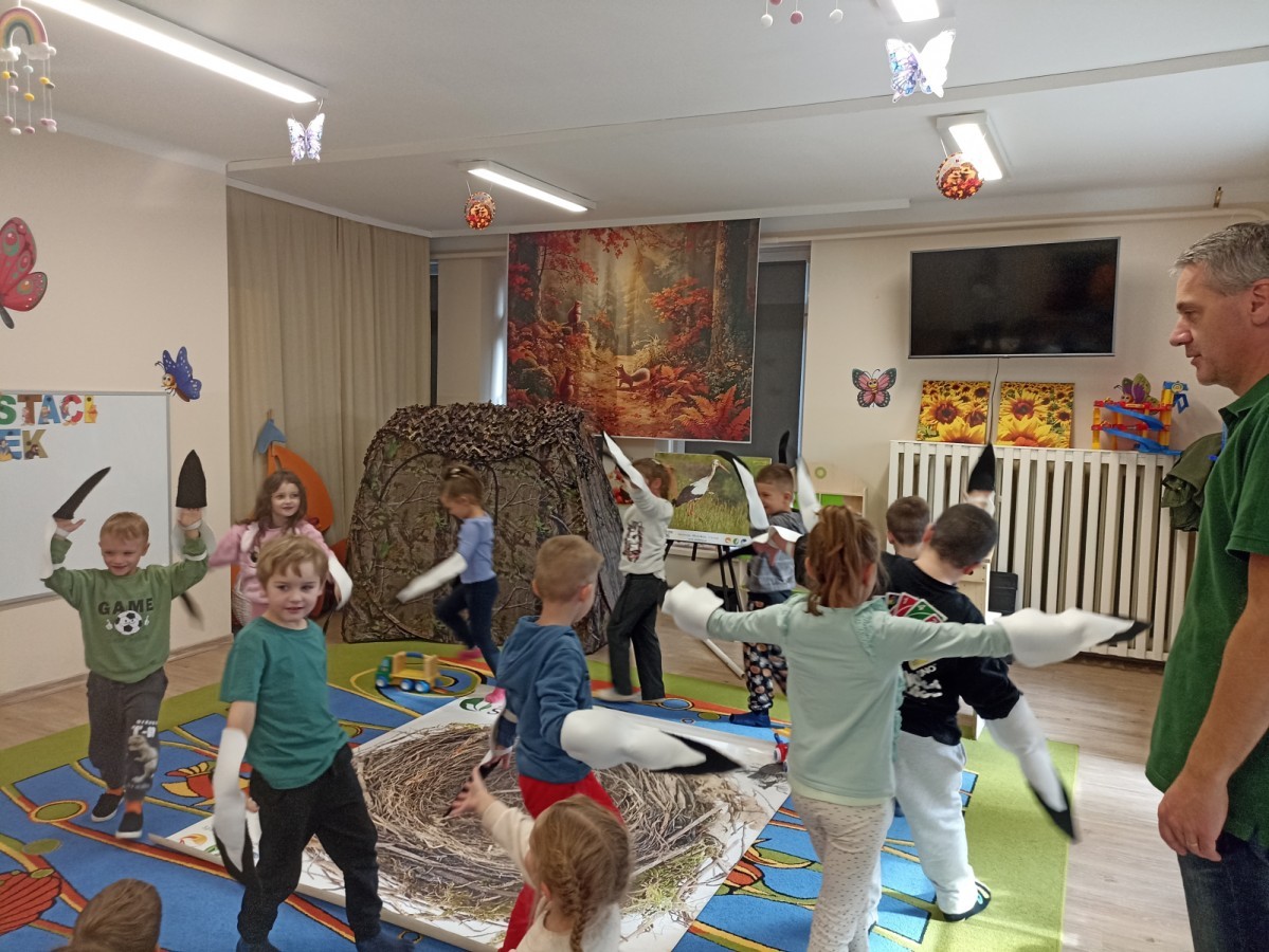 28 października przedszkole gościło ornitologa, prawdziwego znawcę ptaków. To wyjątkowe spotkanie było doskonałą okazją, by pogłębić wiedzę o skrzydlatych mieszkańcach naszej okolicy. Spotkanie było pełne ciekawostek, dzięki którym dzieci dowiedziały się, jak wyglądają, czym się różnią i jak spędzają czas różne ptaki.Odkryły Sekret Zdrowego Dokarmiania - kluczowym elementem edukacji były zasady pomocy ptakom zimą. Pan ornitolog stanowczo podkreślił, że chleb i pieczywo są dla ludzi, natomiast ptasią dietę powinny stanowić ziarna (np. słonecznik) lub owoce (np. jabłka). Była to cenna lekcja odpowiedzialności za przyrodę.