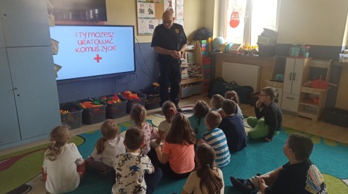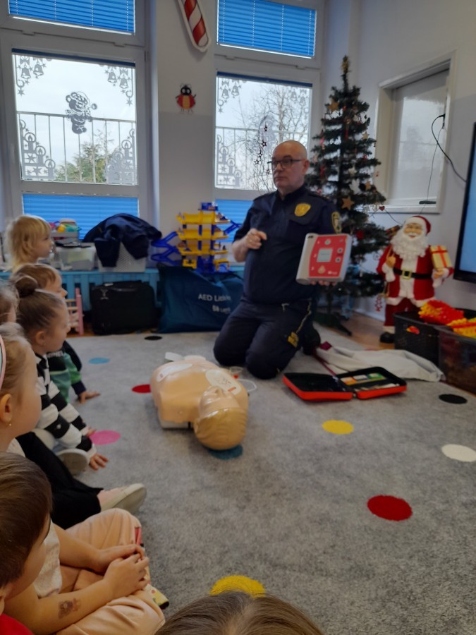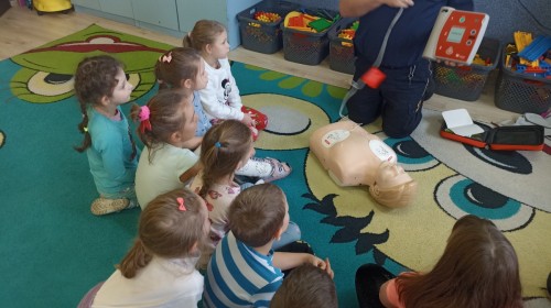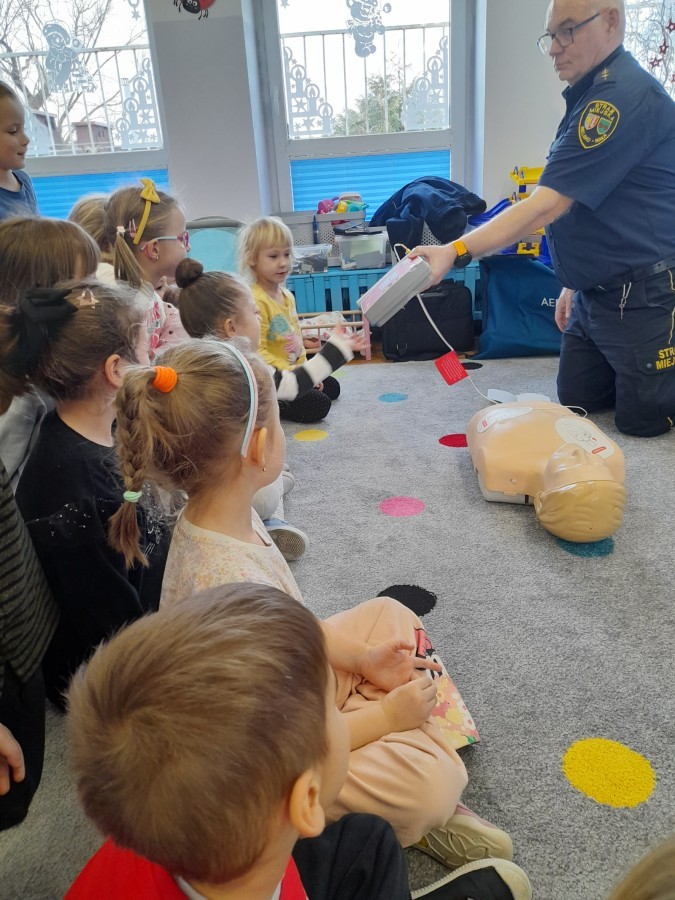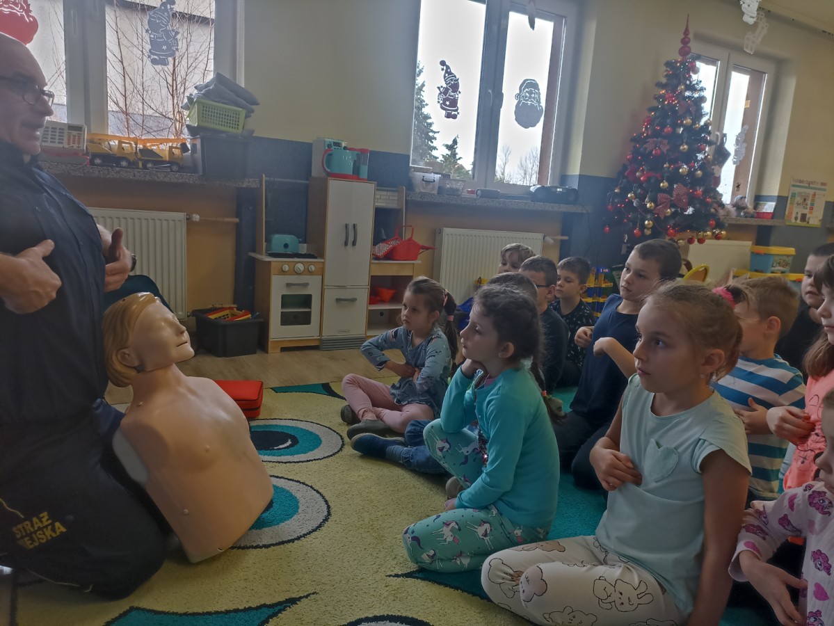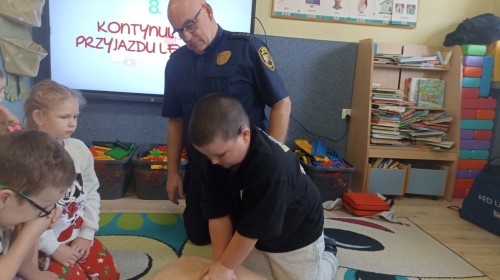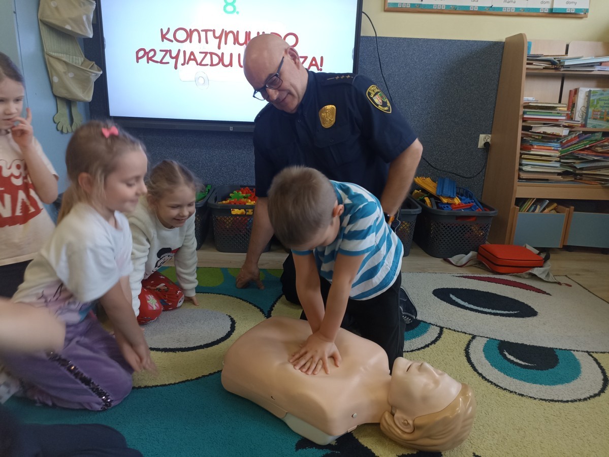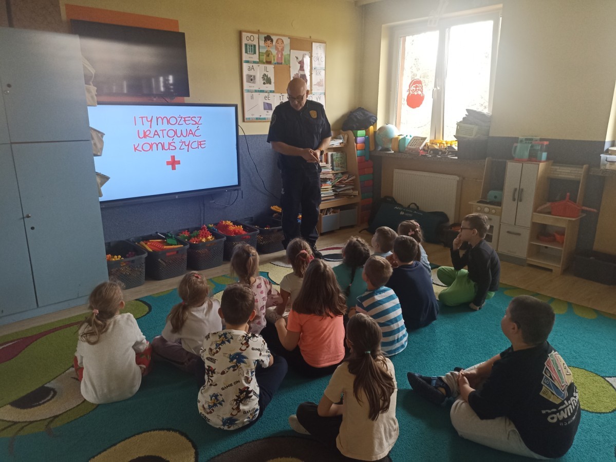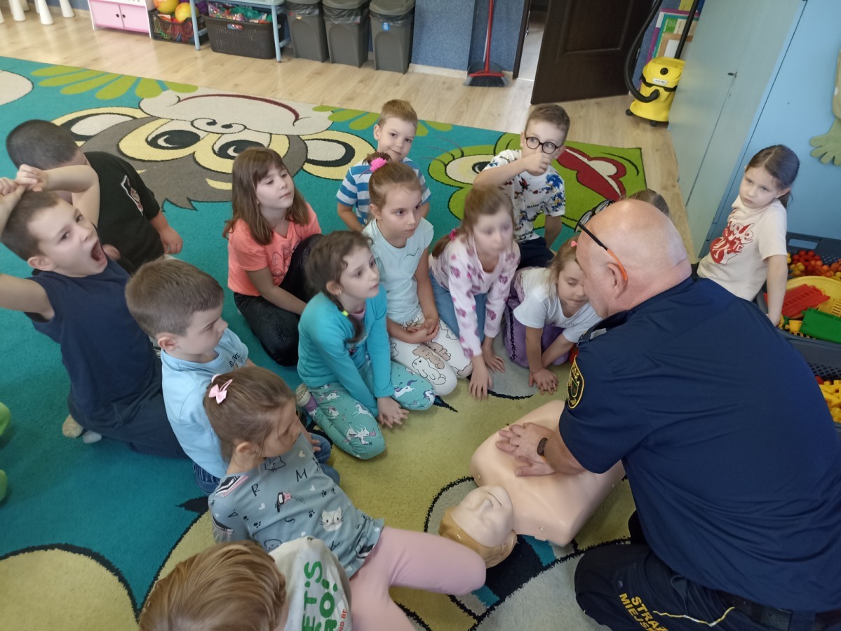 Dzisiaj Pan Mirosław ze Straży Miejskiej przeprowadził z nami zajęcia na temat udzielania pierwszej pomocy przedmedycznej. Obejrzeliśmy film edukacyjny, mieliśmy okazję poćwiczyć masaż serca, a także zobaczyliśmy, jak działa automatyczny defibrylator (AED) i dowiedzieliśmy się do czego służy. Bardzo dziękujemy za cenne i pouczające zajęcia.