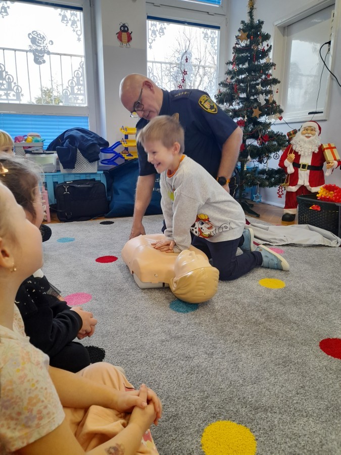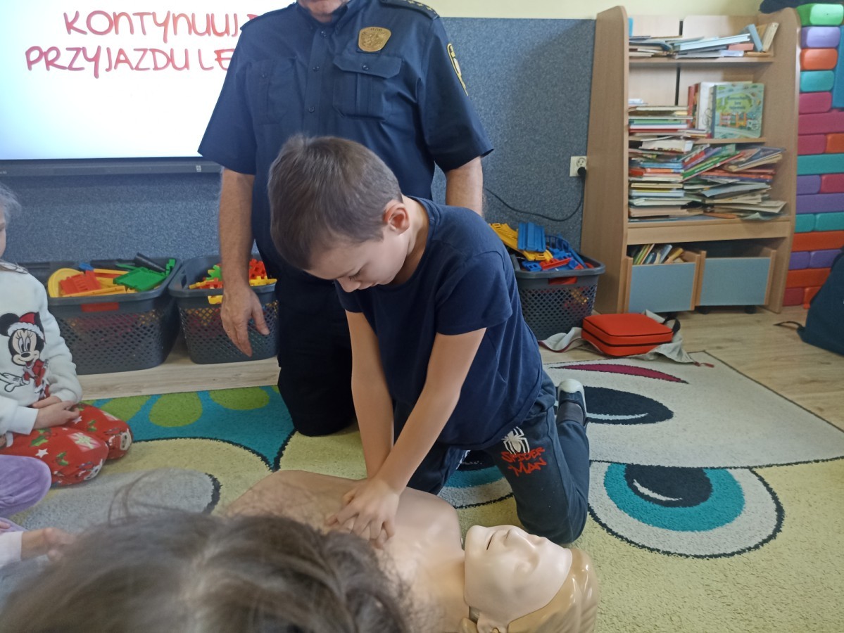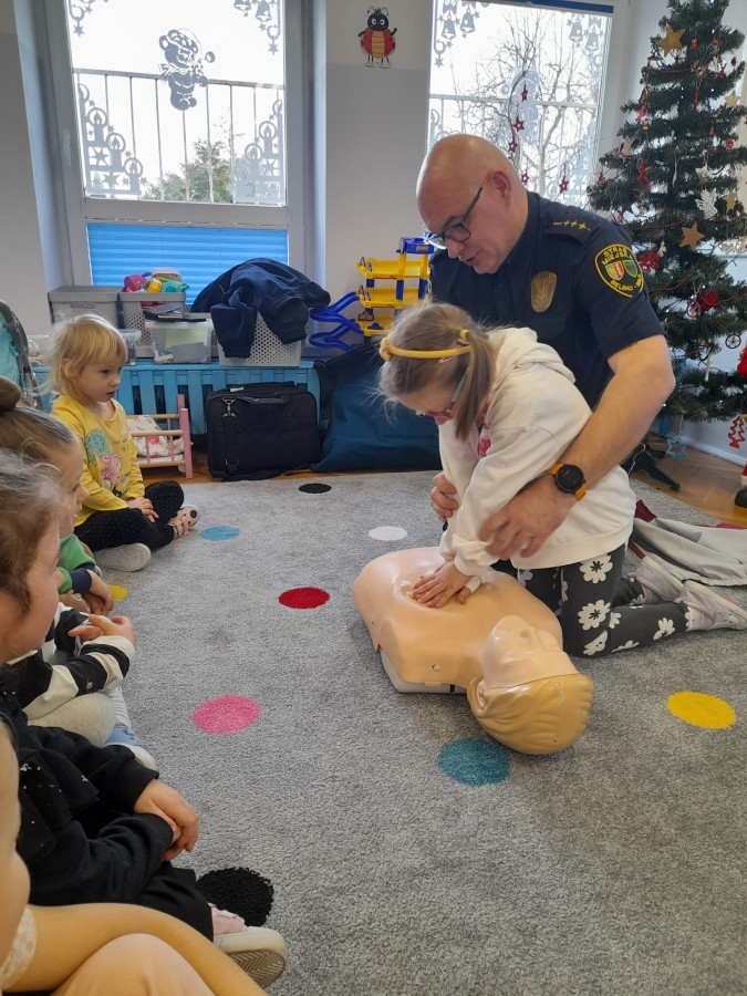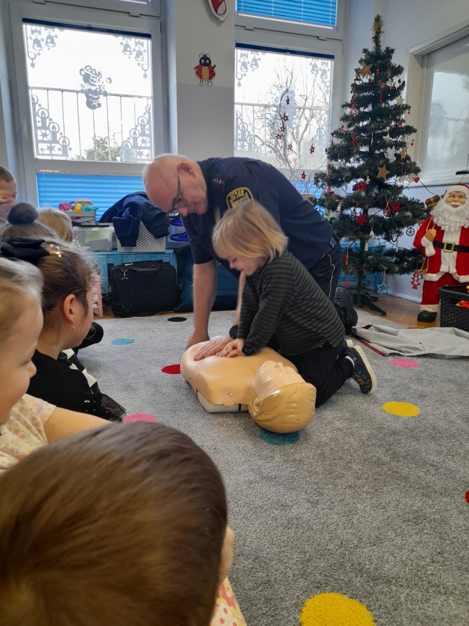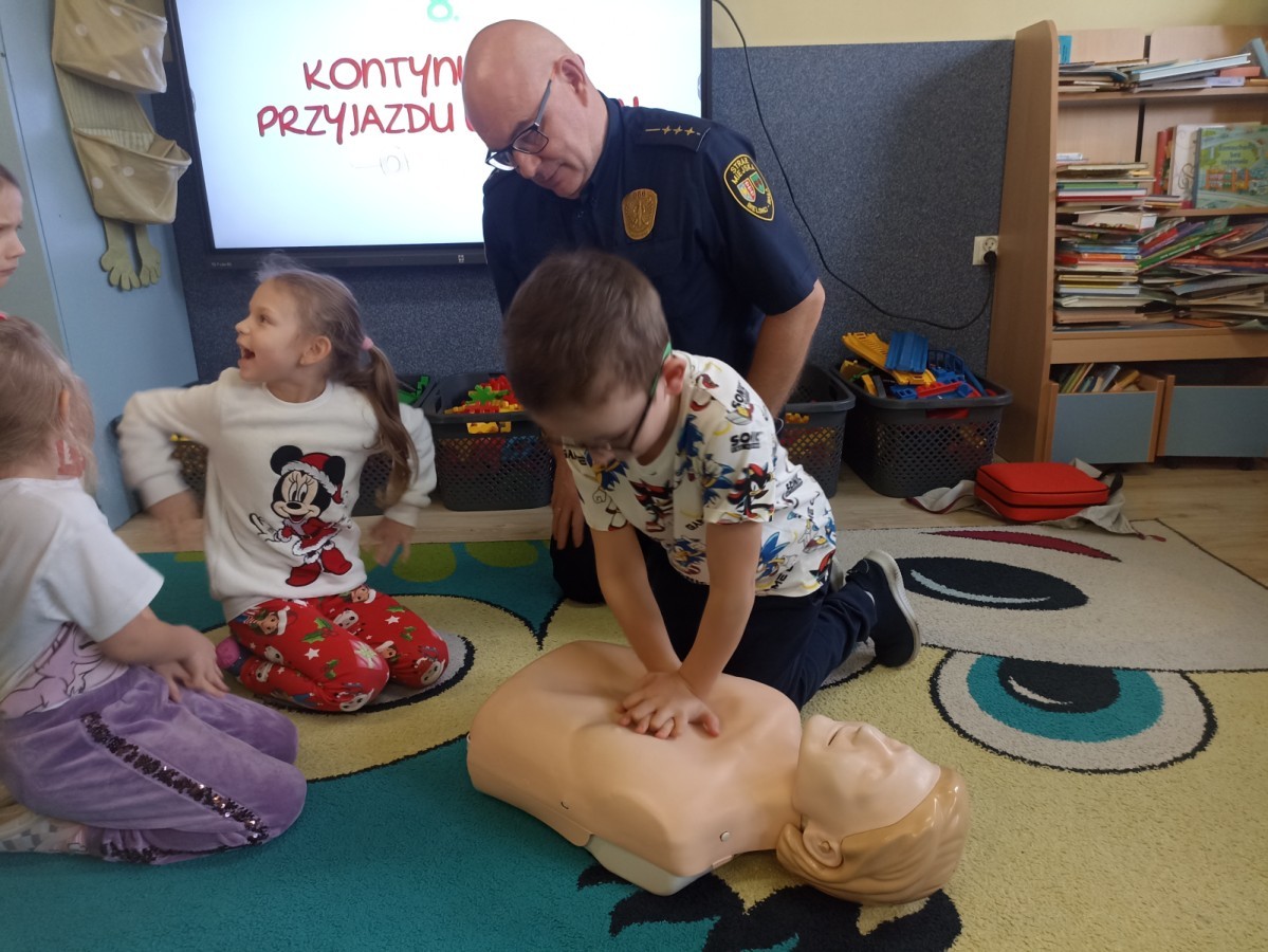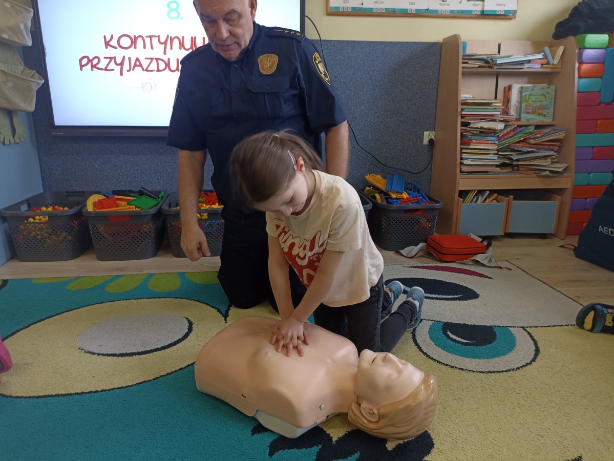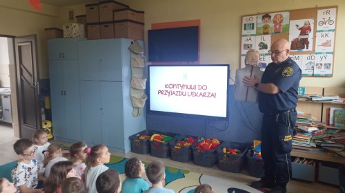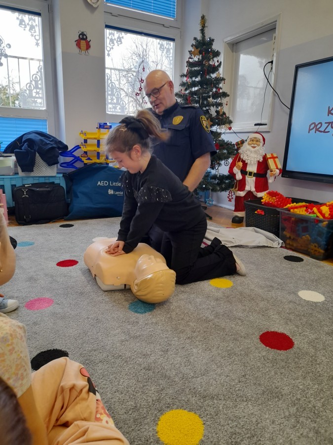 Dzisiaj Pan Mirosław ze Straży Miejskiej przeprowadził z nami zajęcia na temat udzielania pierwszej pomocy przedmedycznej. Obejrzeliśmy film edukacyjny, mieliśmy okazję poćwiczyć masaż serca, a także zobaczyliśmy, jak działa automatyczny defibrylator (AED) i dowiedzieliśmy się do czego służy. Bardzo dziękujemy za cenne i pouczające zajęcia.