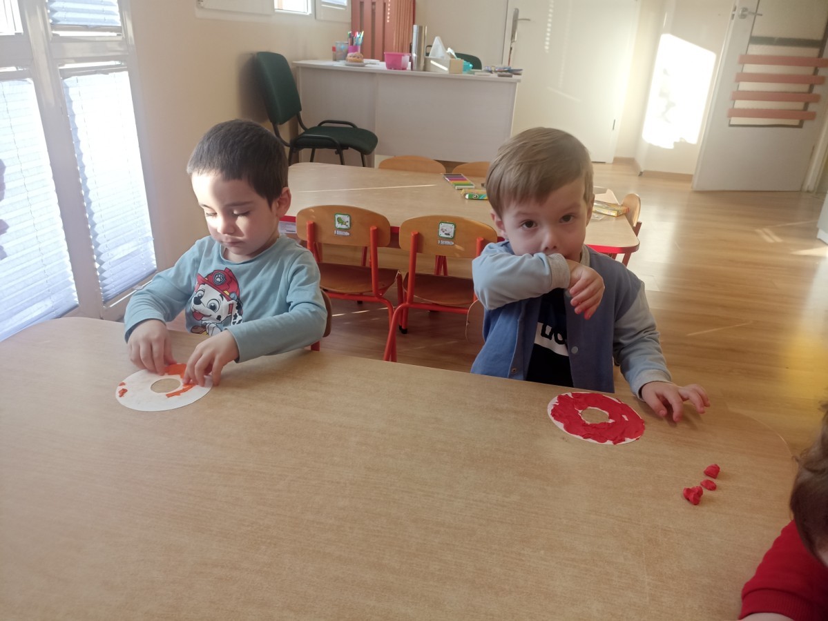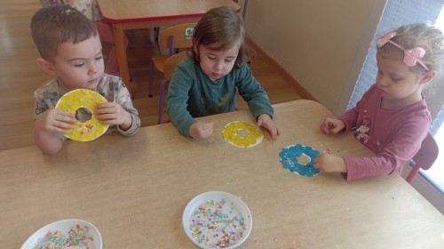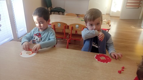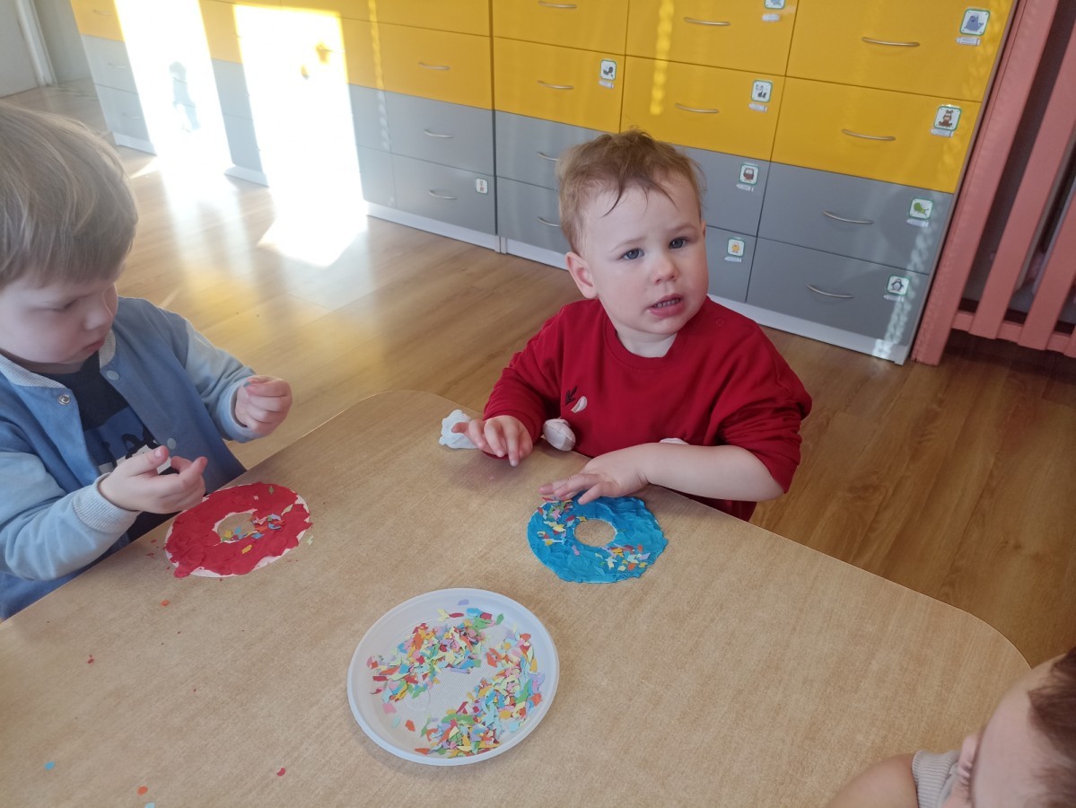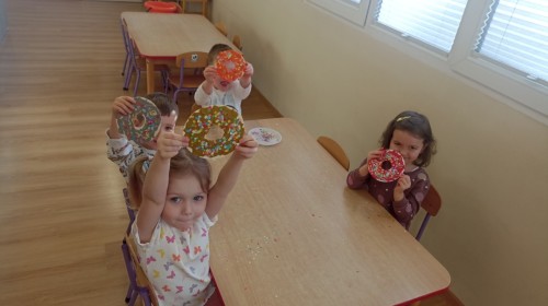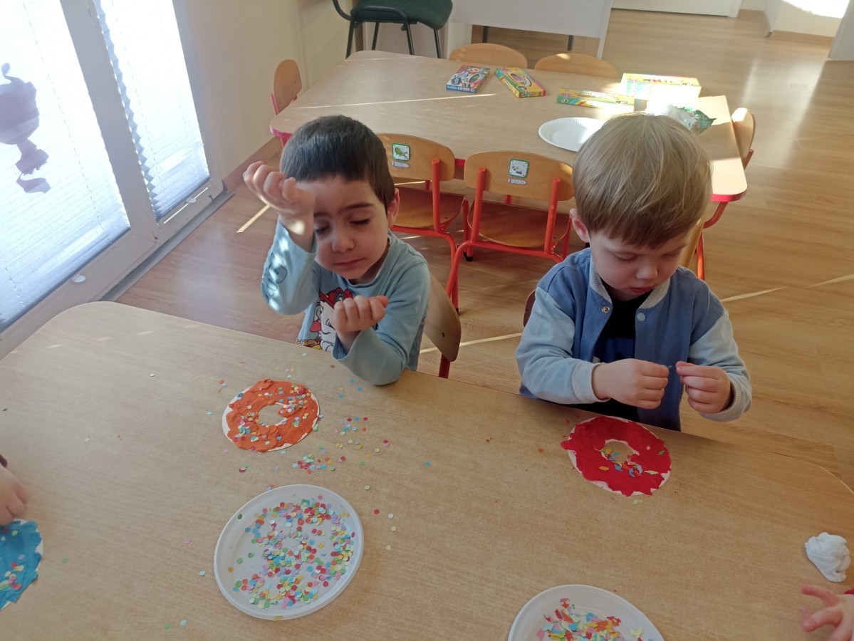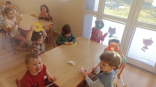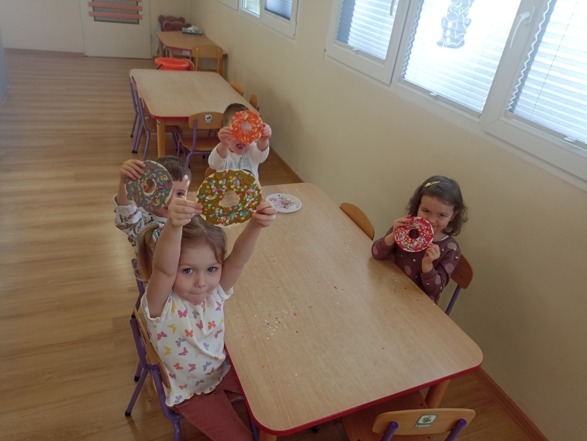 W Tłusty Czwartek w naszych maluszkach królem był oczywiście pączek. Poznaliśmy rodzaje pączków oraz składniki potrzebne do ich przygotowania. Wykonaliśmy również pracę plastyczno - techniczną, a na podwieczorek zjedliśmy pyszne pączki !