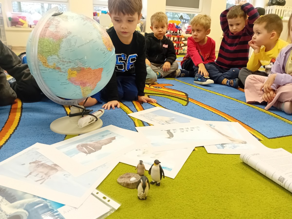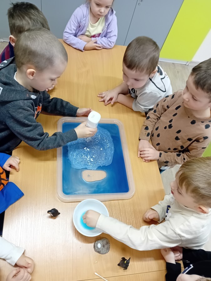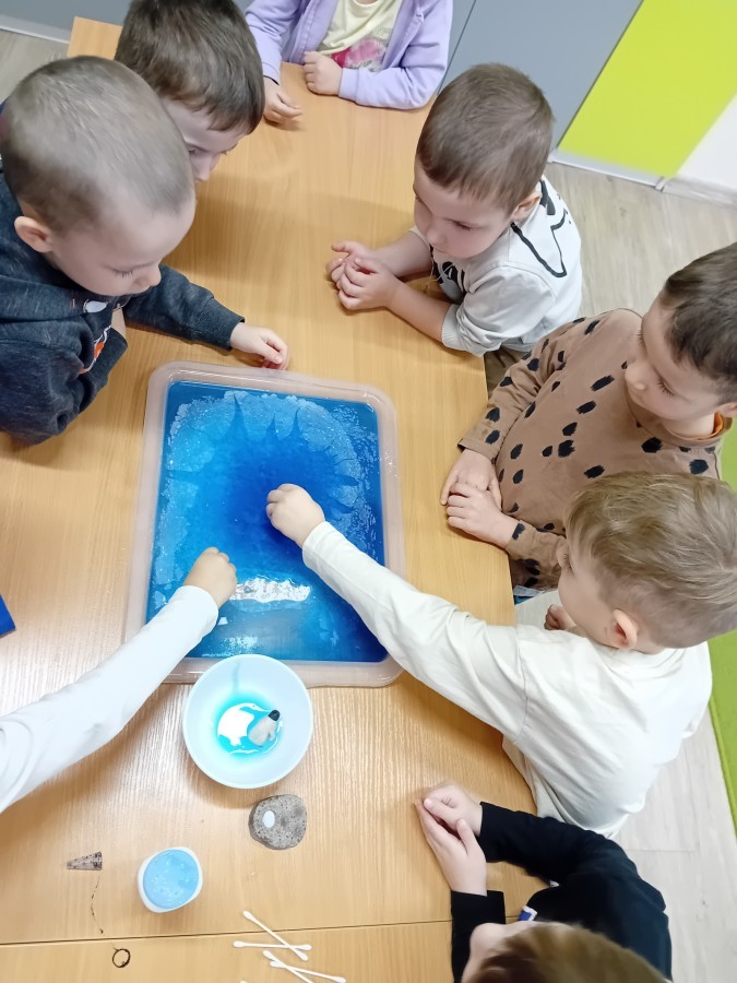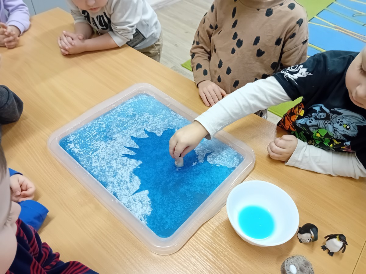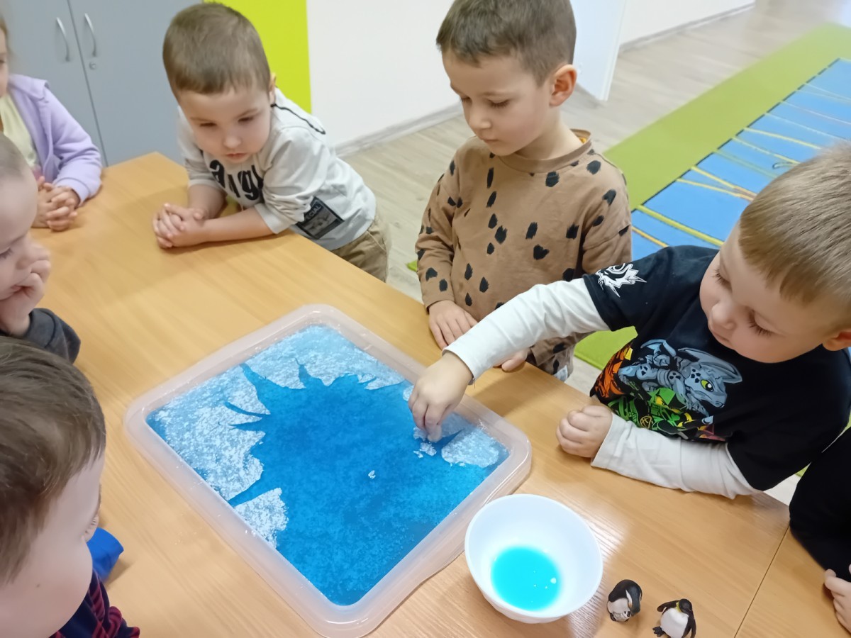 Dziś Nasze przedszkole zamieniło się w mroźną, ale pełną przygód Lodową Krainę. Naszą przygodę rozpoczęliśmy od ważnych badań geograficznych. Dzieci miały okazję dokładnie przyjrzeć się globusowi i dowiedzieć się, że nasza planeta ma dwa bardzo zimne „czubki”. Największą atrakcją były jednak nasze eksperymenty sensoryczne. Zamiast tylko opowiadać o lodzie, postanowiliśmy stworzyć go sami w bardzo nietypowy sposób- zbudowaliśmy własną krę! Na twarzach przedszkolaków było mnóstwo uśmiechu i zdziwienia!