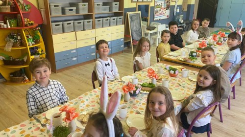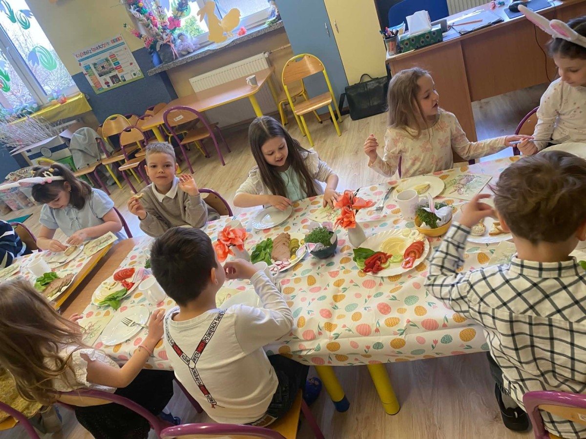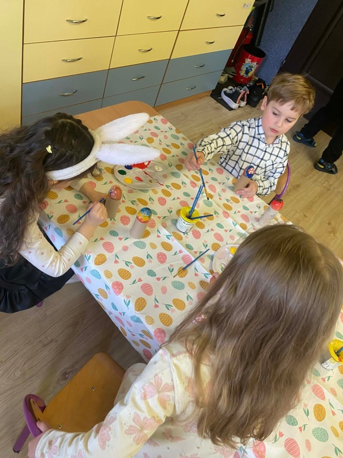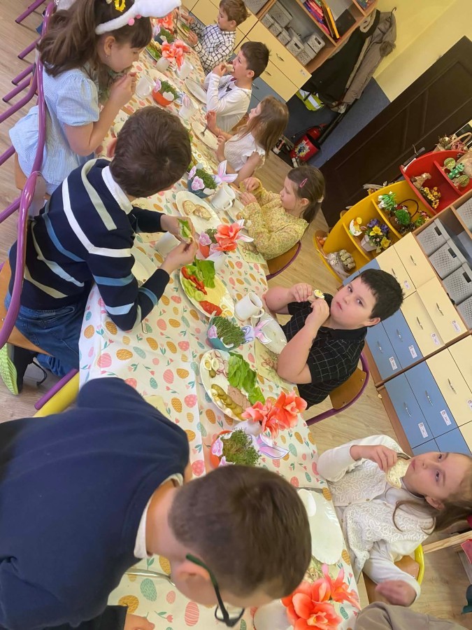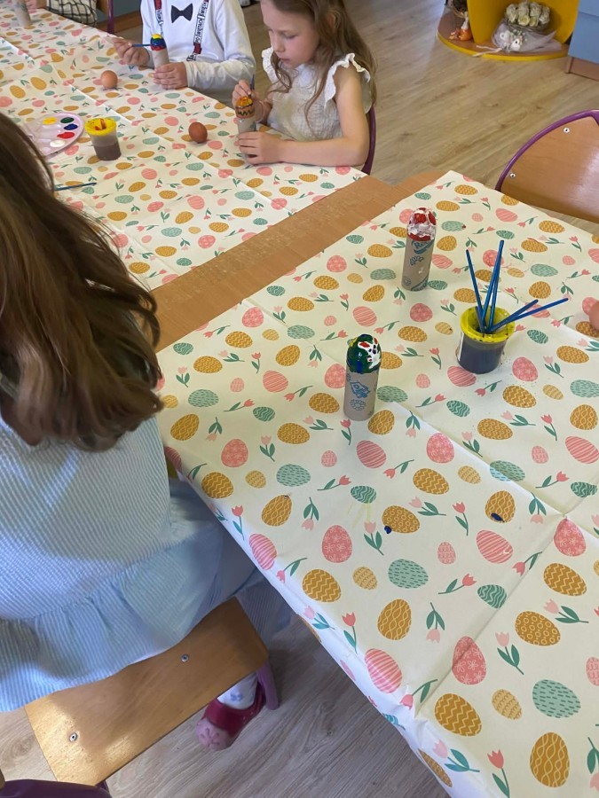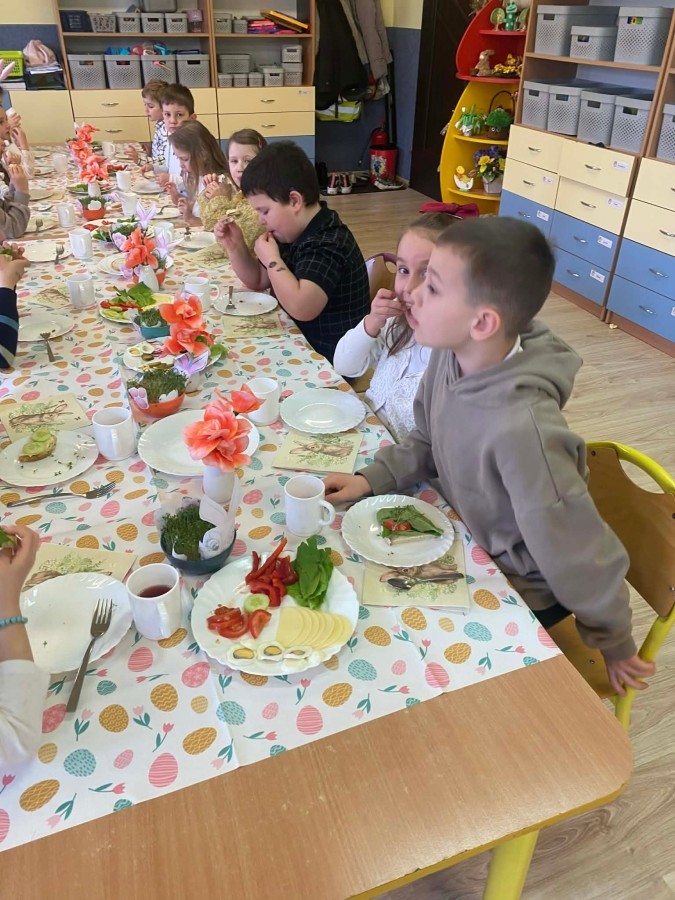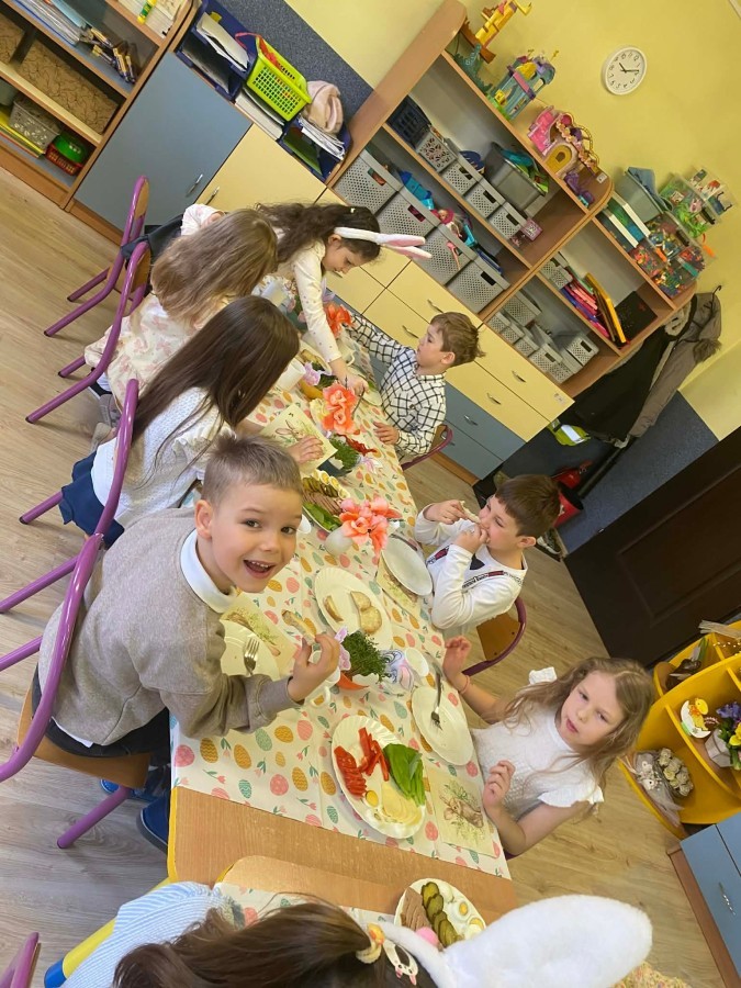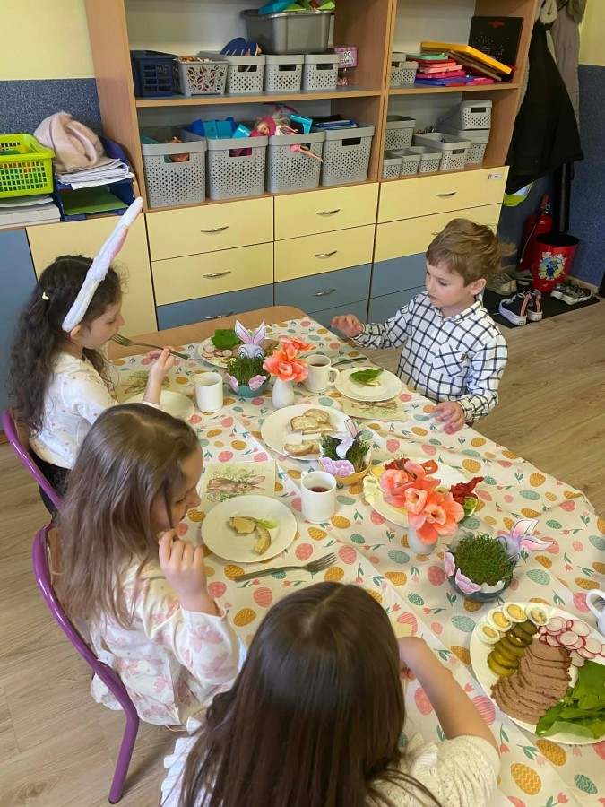 Śniadanie wielkanocne w przedszkolu to był radosny czas pełen tradycji i wspólnego świętowania. Dzieci zasiadły do przystrojonego do stołu, na którym znajdywały się świąteczne potrawy takie jak jajka czy rzeżucha. Po posiłku starszaki z entuzjazmem przystąpiły do malowania jajek, które zabrały do domu wraz z wcześniej wychodowaną rzeżuchą :)