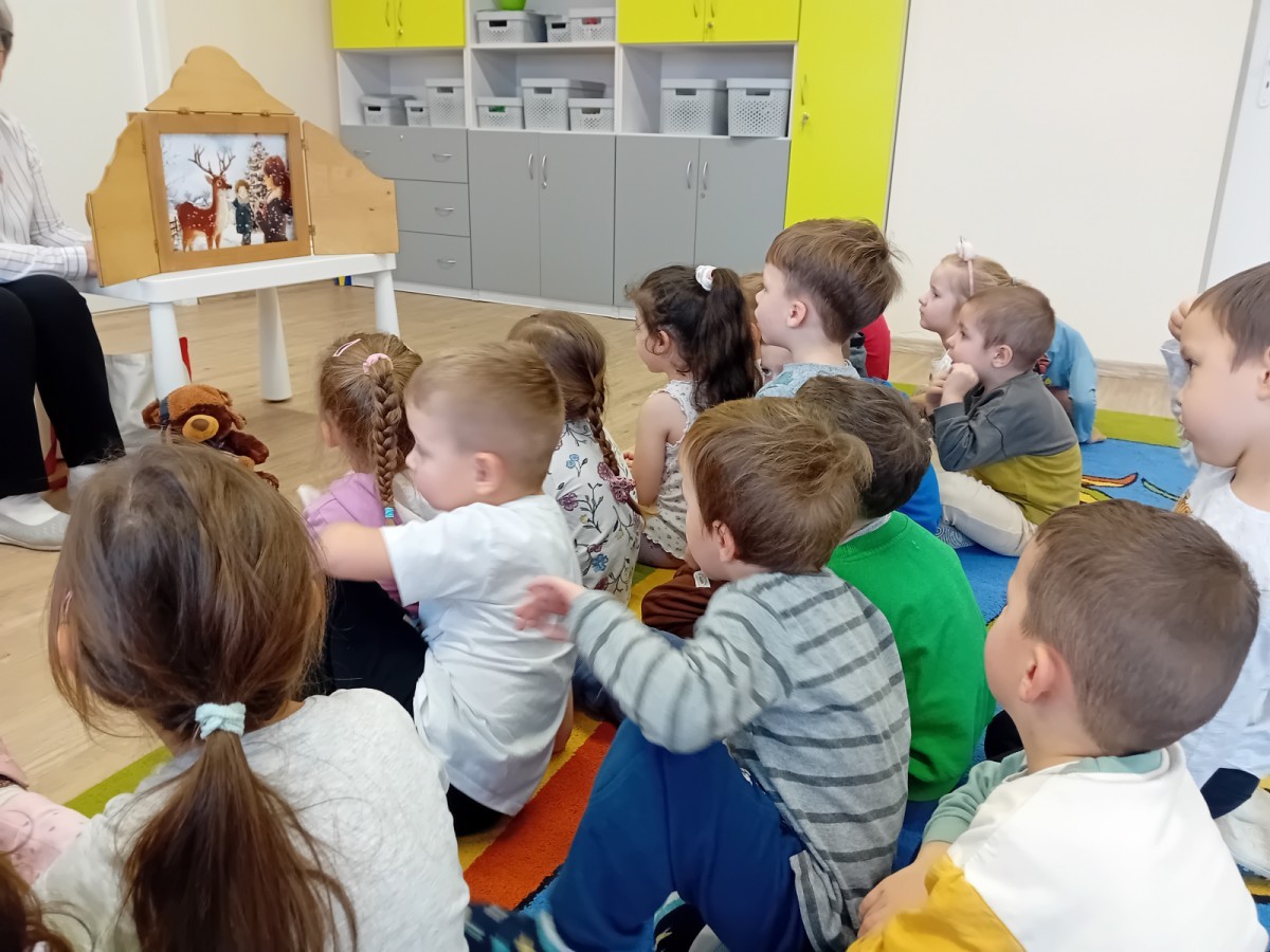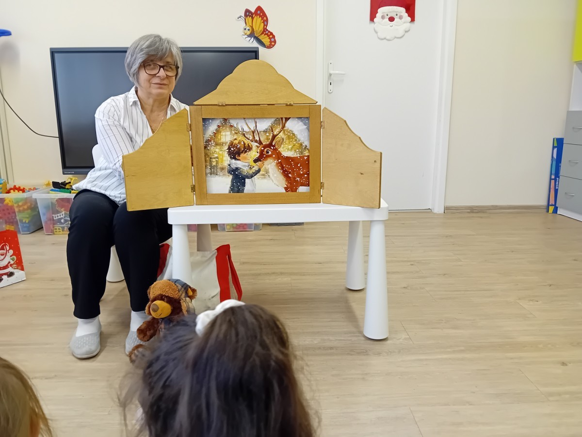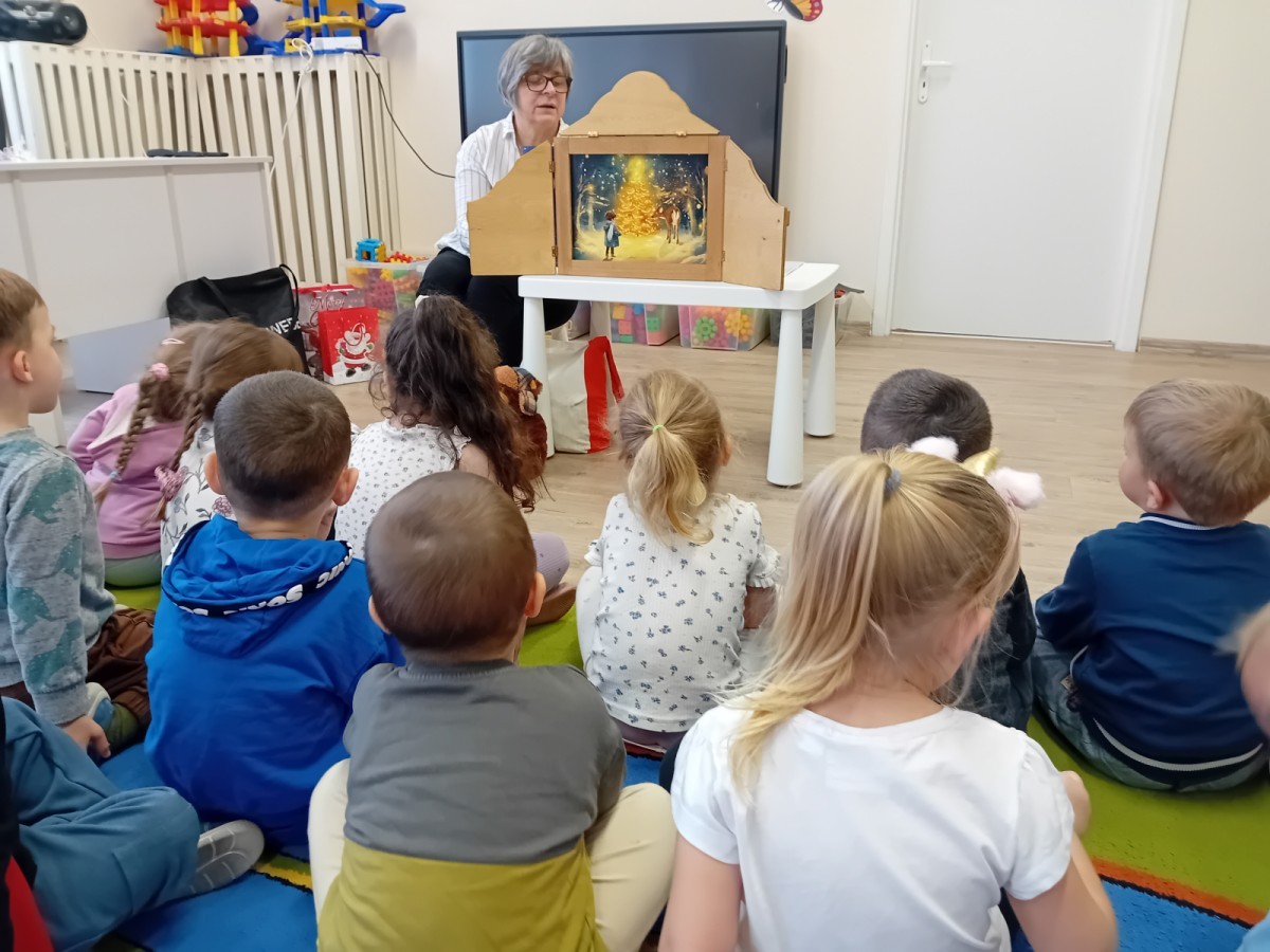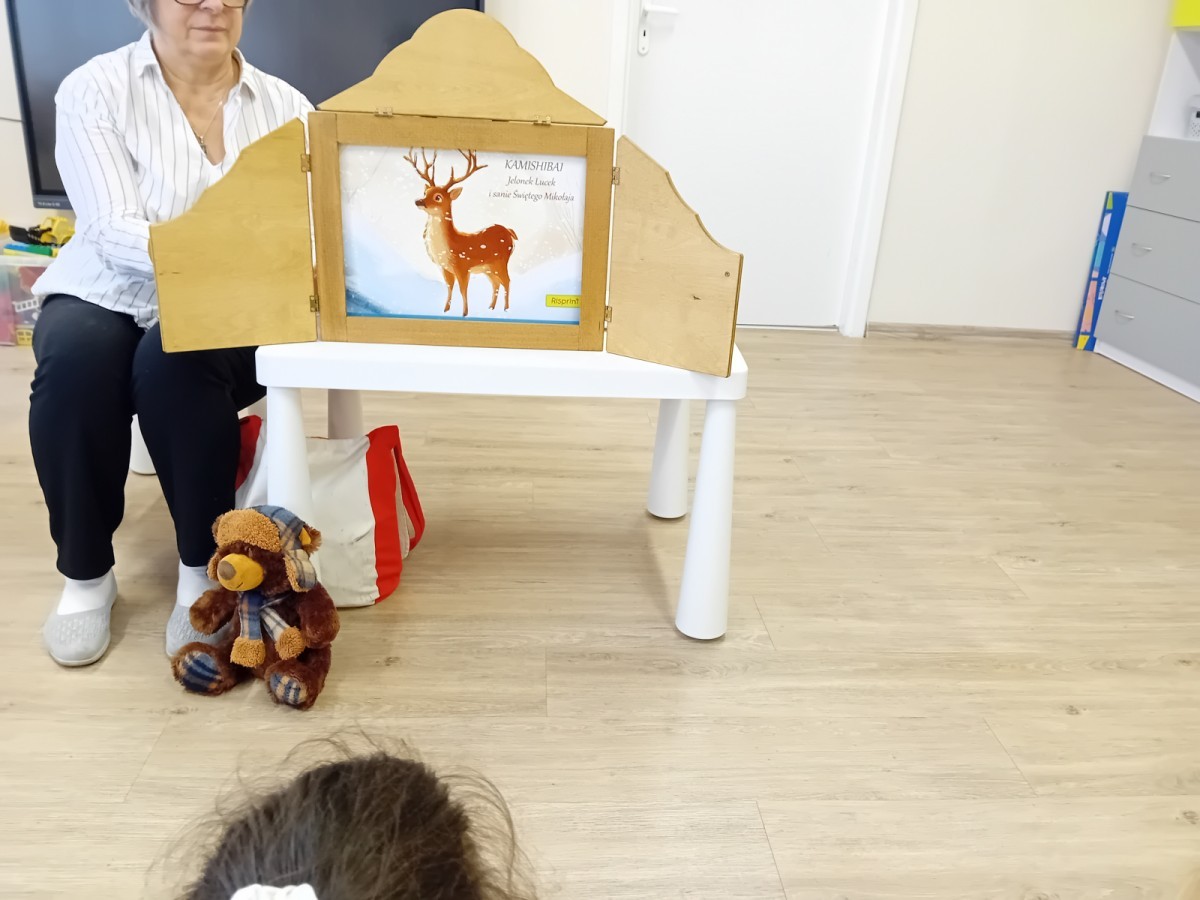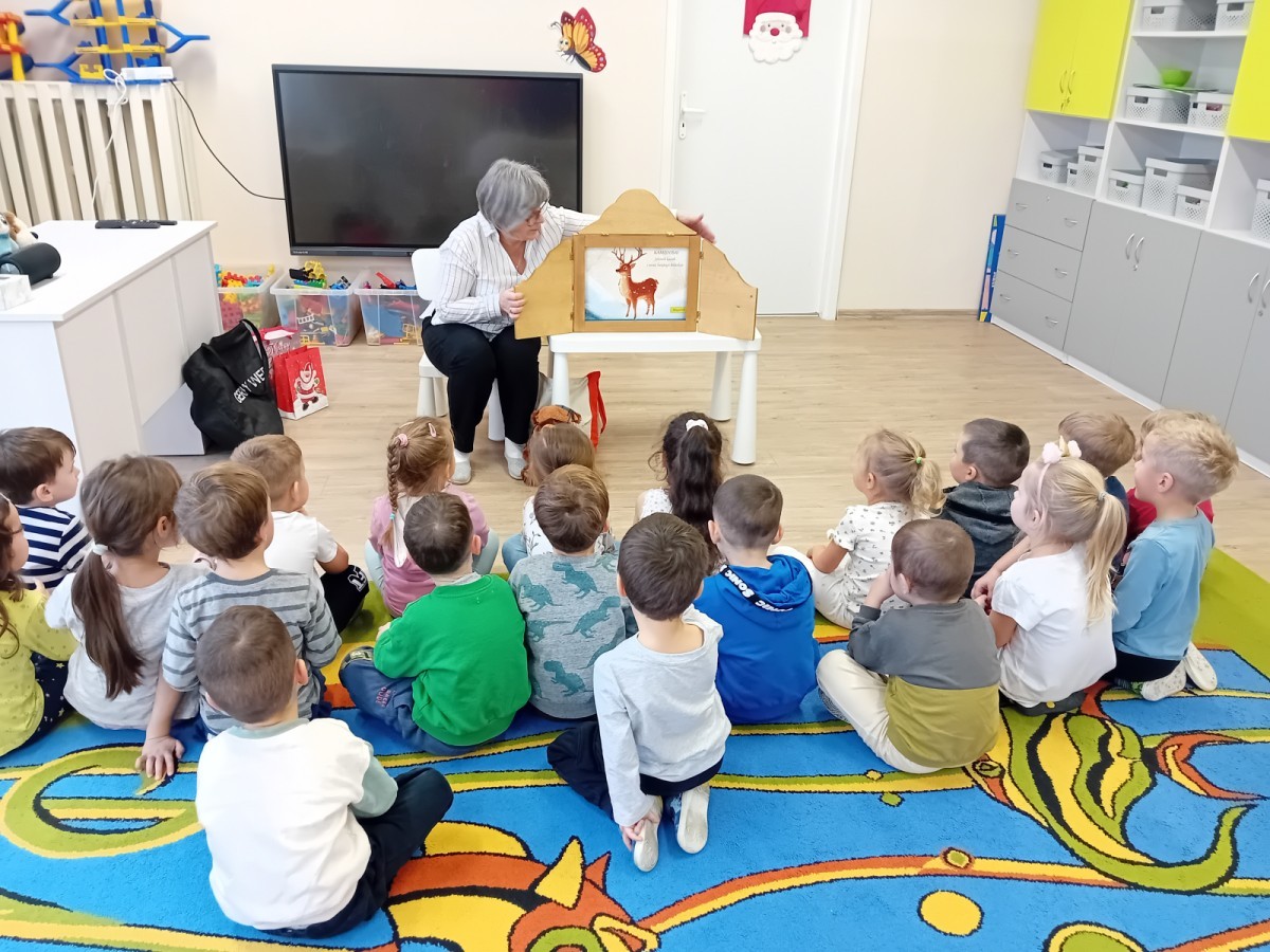 Dziś nasze przedszkole odwiedził wyjątkowy i znany już Przedszkolakom gość- Pani z Biblioteki, która przywiozła ze sobą prawdziwy teatrzyk kamishibai. Dzieci miały okazję wysłuchać pięknej, świątecznej opowieści „Jelonek Lucek i sanie Świętego Mikołaja”. Drewniana skrzynka kamishibai od razu wzbudziła ogromną ciekawość. Gdy tylko otworzyły się jej drzwiczki, wszystkie dzieci z zapartym tchem obserwowały kolejne ilustracje i słuchały historii o małym jelonku Lucku, który marzył, by pomóc Mikołajowi w dostarczaniu prezentów. Dzieci aktywnie uczestniczyły w czytaniu – odpowiadały na pytania, komentowały przygody Lucka i z zaciekawieniem śledziły, czy uda mu się spełnić swoje największe marzenie. Atmosfera była pełna ciepła, magii i świątecznego nastroju. Na zakończenie każdy przedszkolak otrzymal słodki upominek- reniferka z ukrytym lizakiem. Dziękujemy bardzo za wspaniałą wizytę.