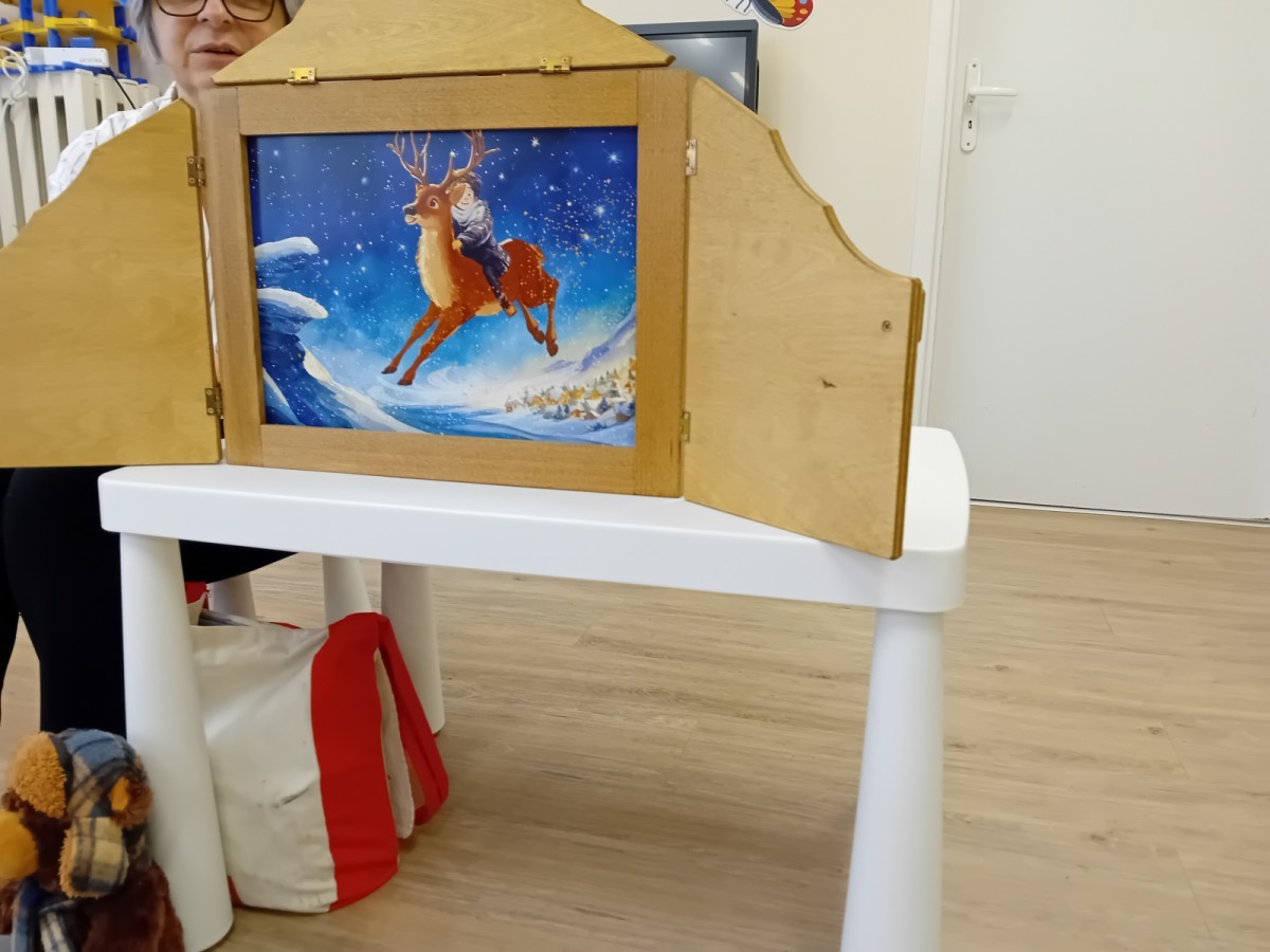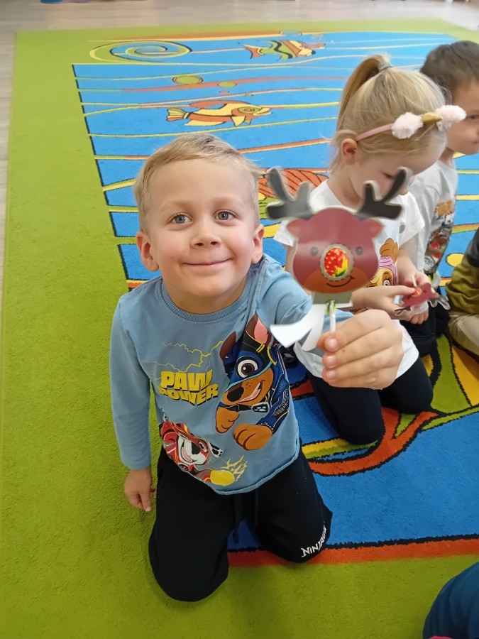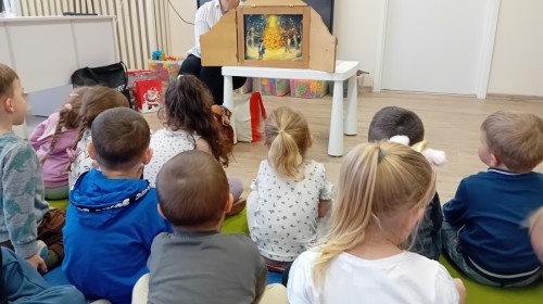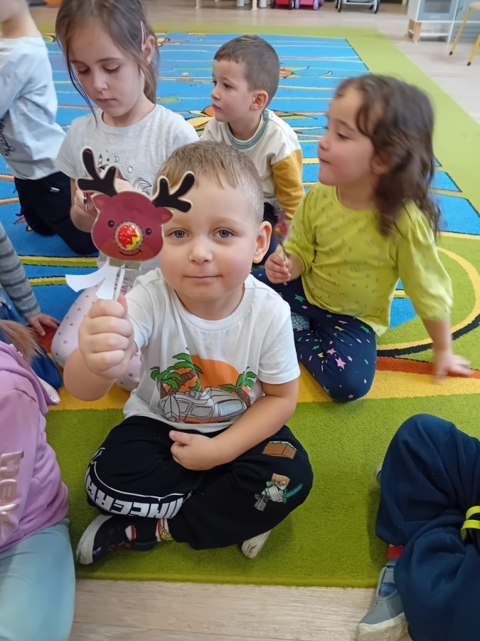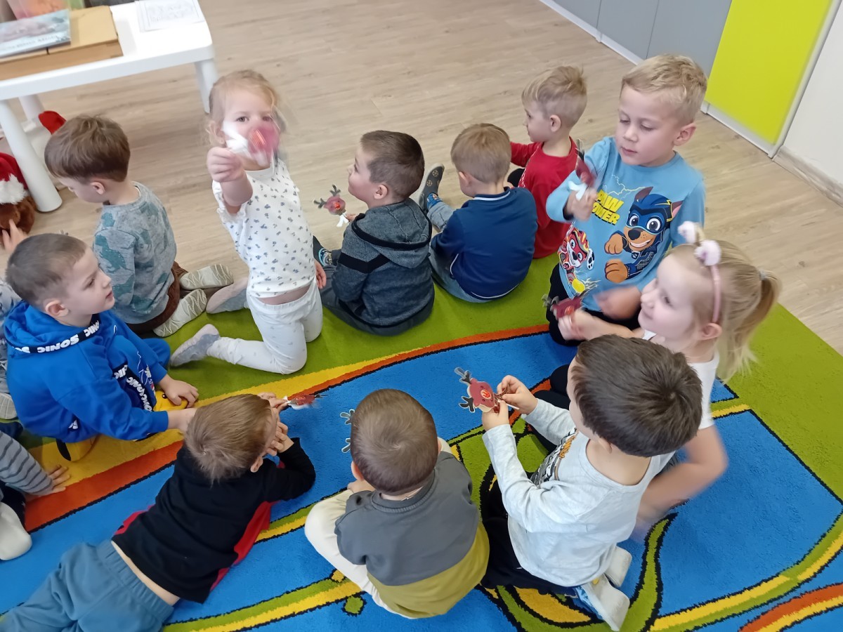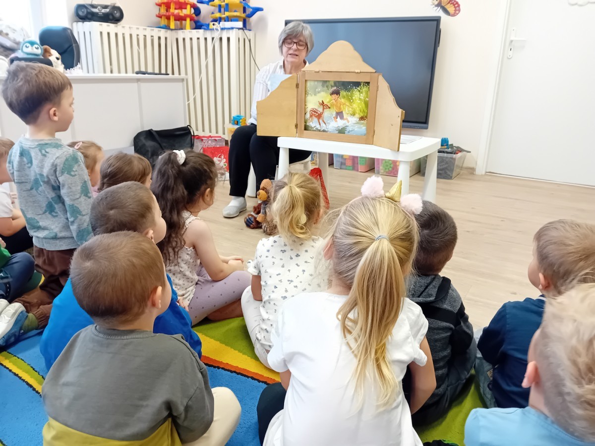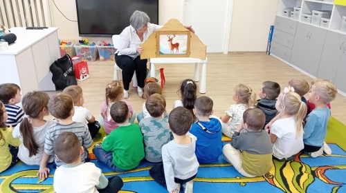 Dziś nasze przedszkole odwiedził wyjątkowy i znany już Przedszkolakom gość- Pani z Biblioteki, która przywiozła ze sobą prawdziwy teatrzyk kamishibai. Dzieci miały okazję wysłuchać pięknej, świątecznej opowieści „Jelonek Lucek i sanie Świętego Mikołaja”. Drewniana skrzynka kamishibai od razu wzbudziła ogromną ciekawość. Gdy tylko otworzyły się jej drzwiczki, wszystkie dzieci z zapartym tchem obserwowały kolejne ilustracje i słuchały historii o małym jelonku Lucku, który marzył, by pomóc Mikołajowi w dostarczaniu prezentów. Dzieci aktywnie uczestniczyły w czytaniu – odpowiadały na pytania, komentowały przygody Lucka i z zaciekawieniem śledziły, czy uda mu się spełnić swoje największe marzenie. Atmosfera była pełna ciepła, magii i świątecznego nastroju. Na zakończenie każdy przedszkolak otrzymal słodki upominek- reniferka z ukrytym lizakiem. Dziękujemy bardzo za wspaniałą wizytę.