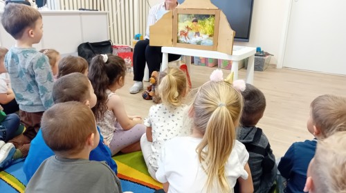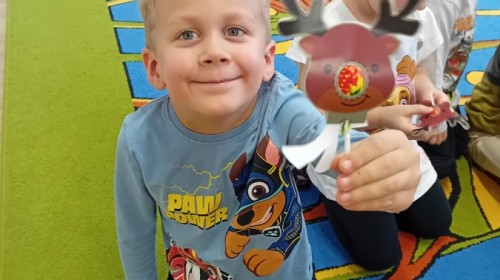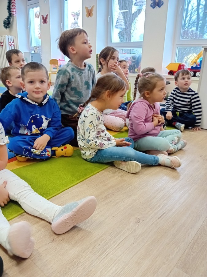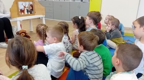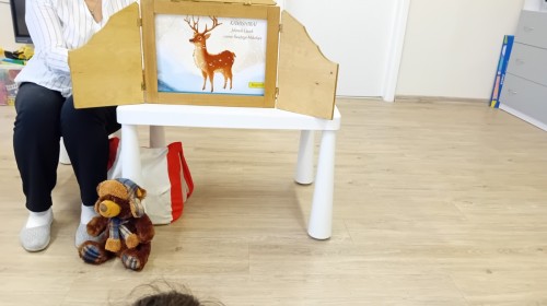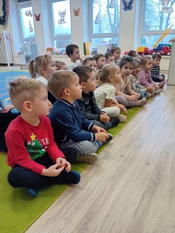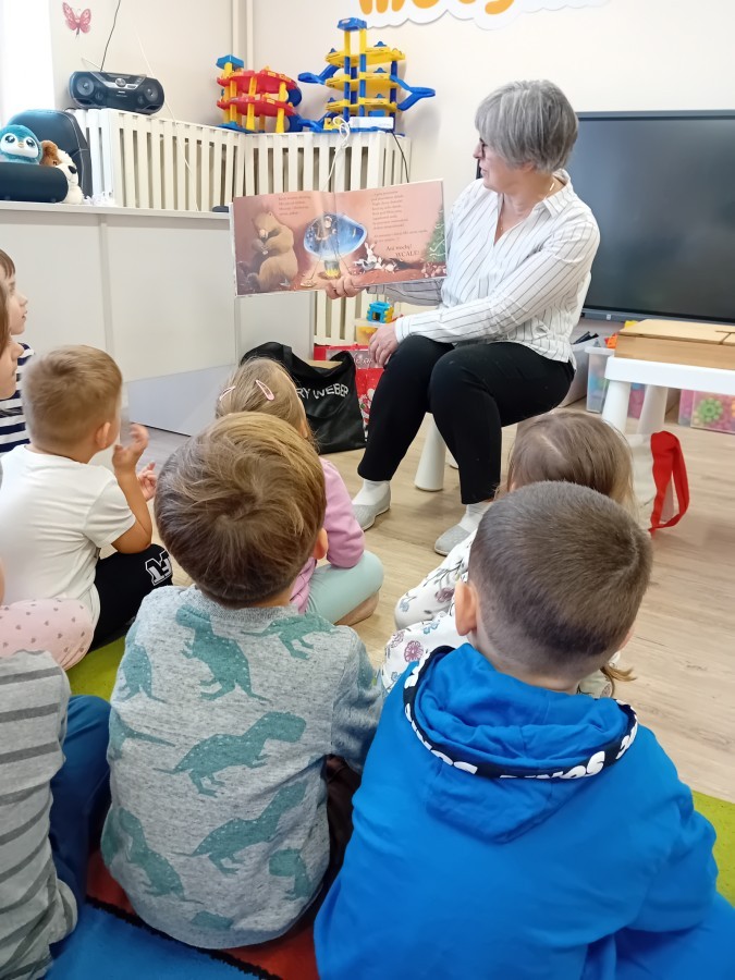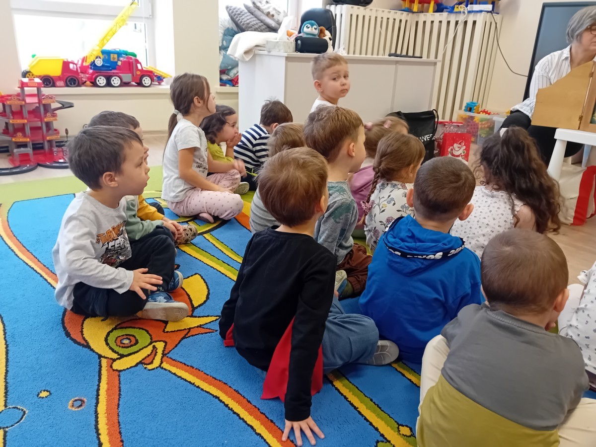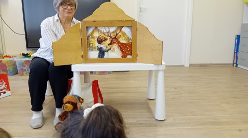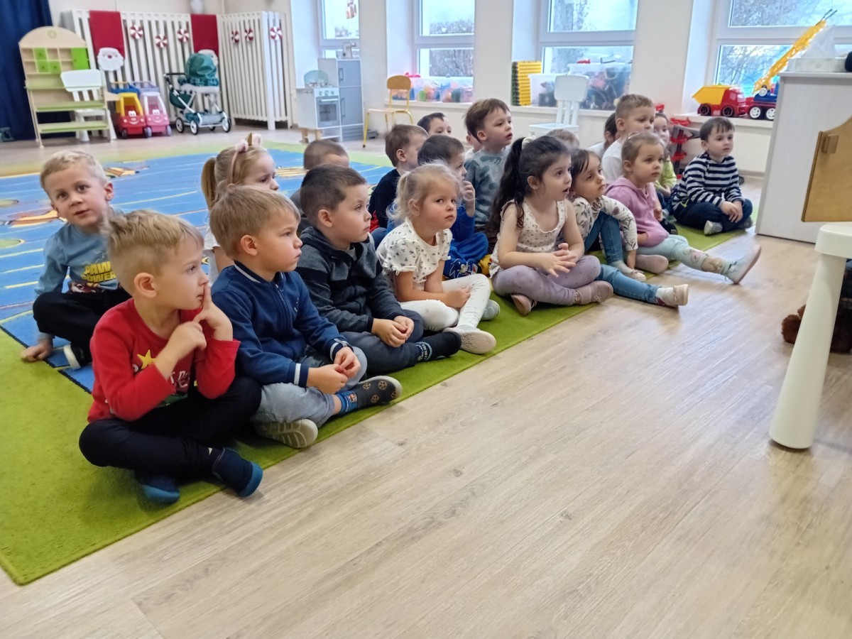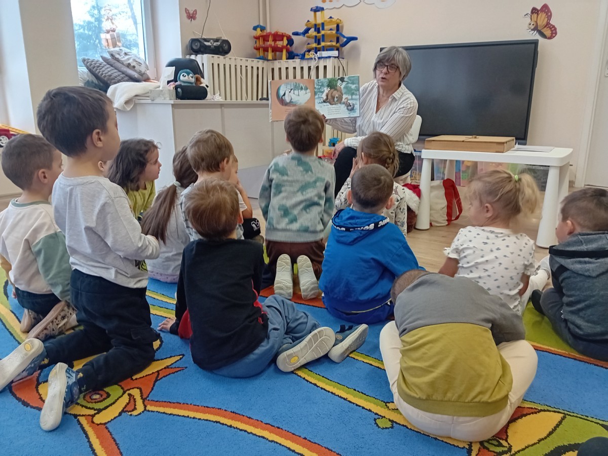 Dziś nasze przedszkole odwiedził wyjątkowy i znany już Przedszkolakom gość- Pani z Biblioteki, która przywiozła ze sobą prawdziwy teatrzyk kamishibai. Dzieci miały okazję wysłuchać pięknej, świątecznej opowieści „Jelonek Lucek i sanie Świętego Mikołaja”. Drewniana skrzynka kamishibai od razu wzbudziła ogromną ciekawość. Gdy tylko otworzyły się jej drzwiczki, wszystkie dzieci z zapartym tchem obserwowały kolejne ilustracje i słuchały historii o małym jelonku Lucku, który marzył, by pomóc Mikołajowi w dostarczaniu prezentów. Dzieci aktywnie uczestniczyły w czytaniu – odpowiadały na pytania, komentowały przygody Lucka i z zaciekawieniem śledziły, czy uda mu się spełnić swoje największe marzenie. Atmosfera była pełna ciepła, magii i świątecznego nastroju. Na zakończenie każdy przedszkolak otrzymal słodki upominek- reniferka z ukrytym lizakiem. Dziękujemy bardzo za wspaniałą wizytę.