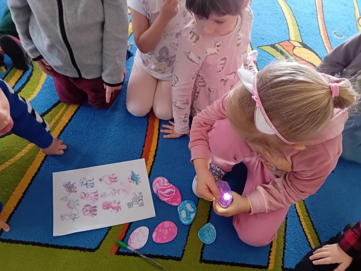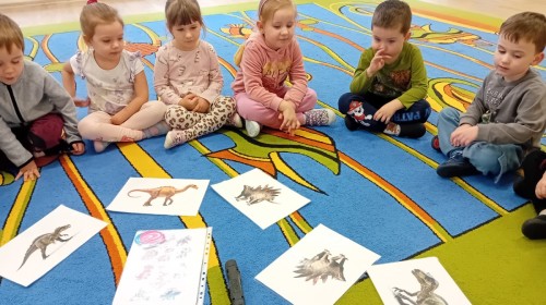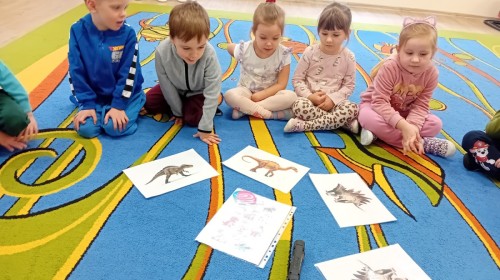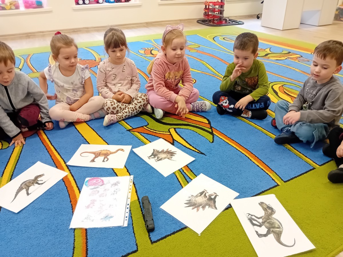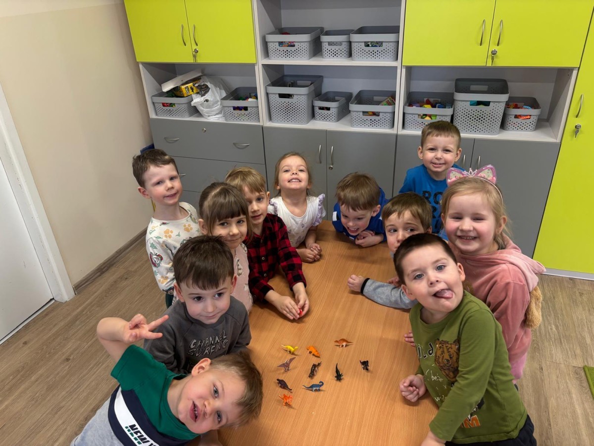 Naszą przygodę zaczęliśmy od poszukiwania odpowiedzi na pytanie: „Skąd się wzięły dinozaury?”. Wspólnie przenieśliśmy się w czasie o miliony lat, by podejrzeć, jak wyglądał świat zdominowany przez wielkie gady. Dzieci z zaciekawieniem odkrywały tajemnicę narodzin dinozaurów, śledząc ich drogę od skorupki jajka aż po jurajskie puszcze