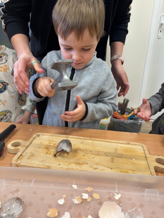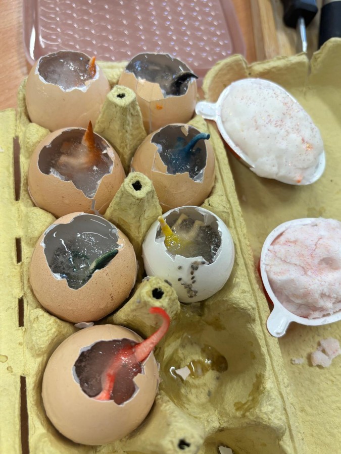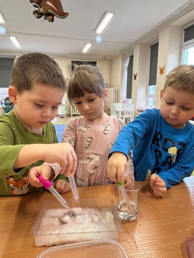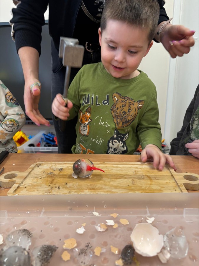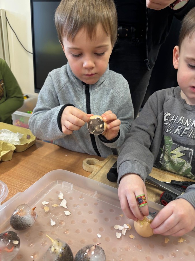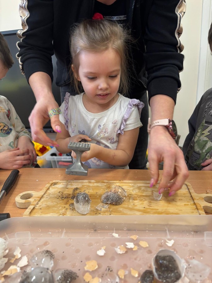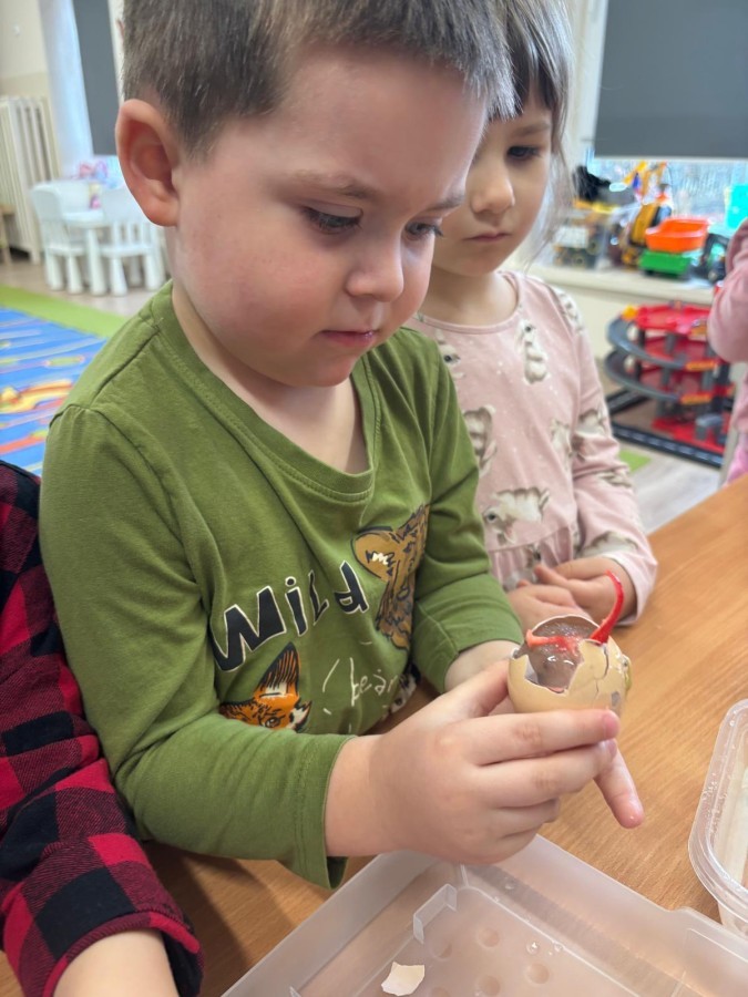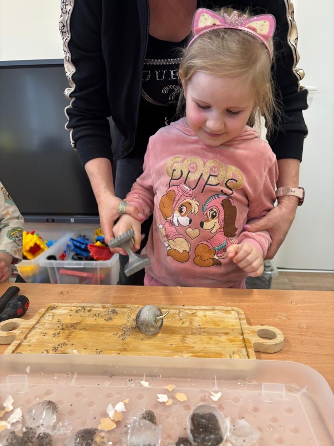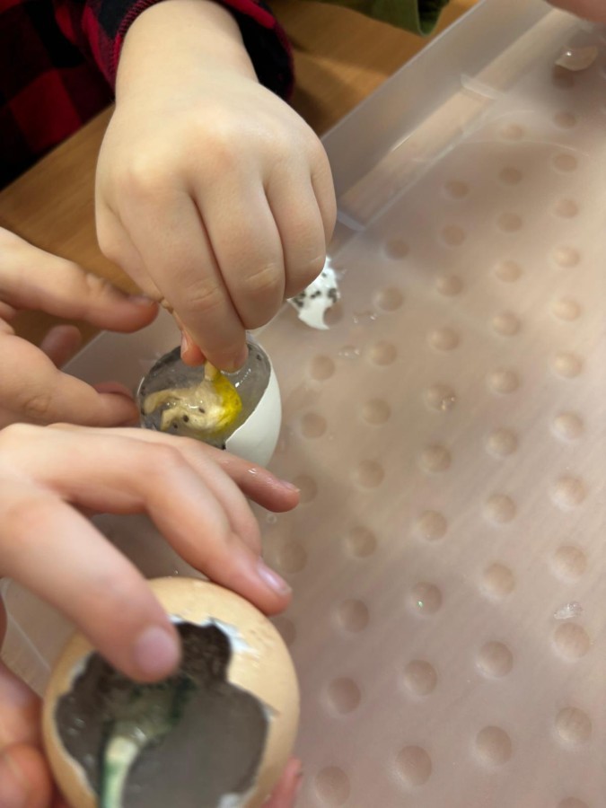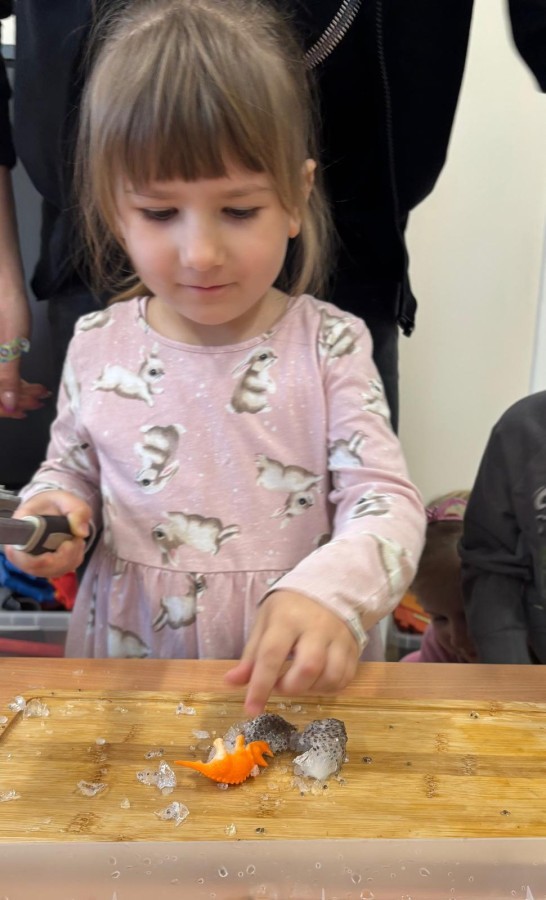 - ❄️ Lodowe jaja – cierpliwie uwalnialiśmy figurki dinozaurów zamknięte w lodzie.