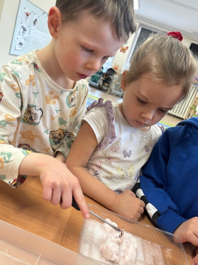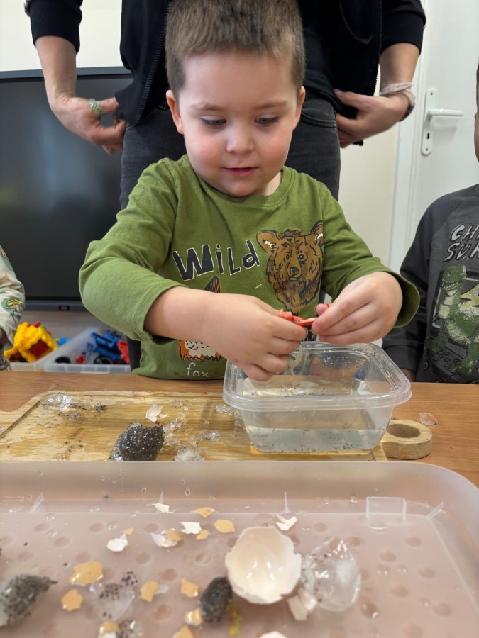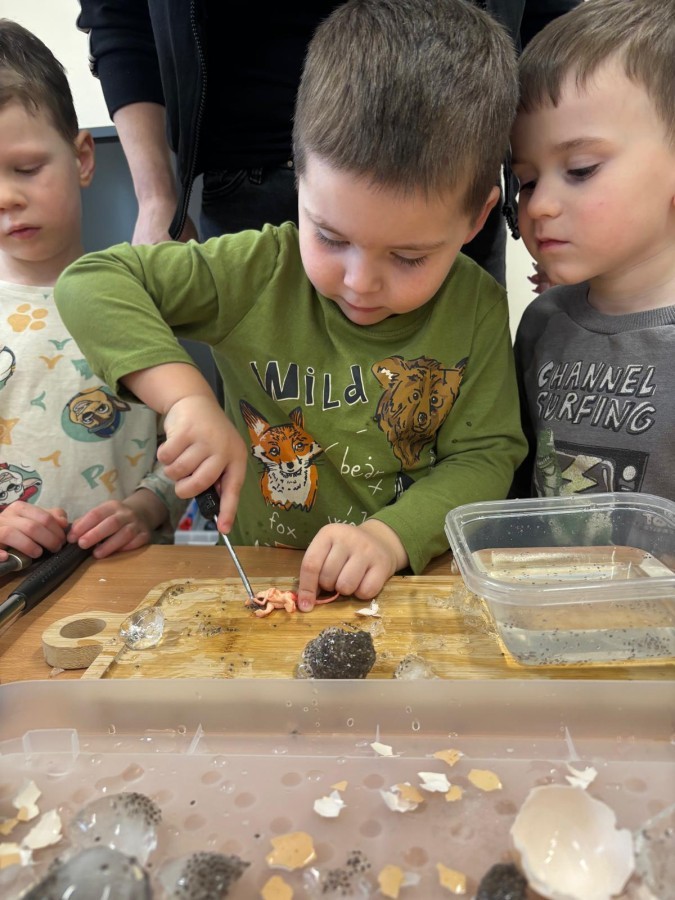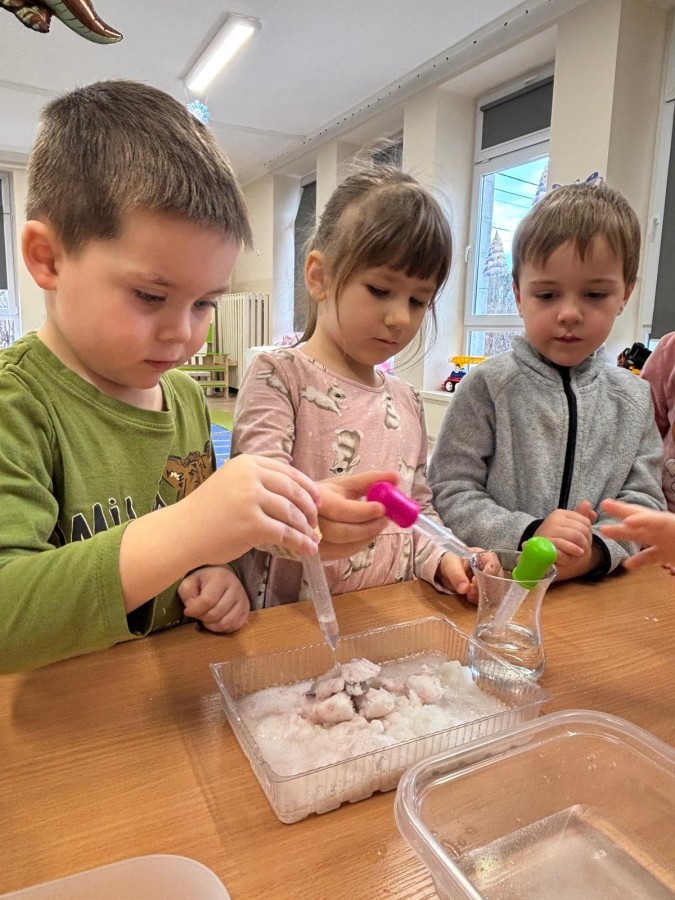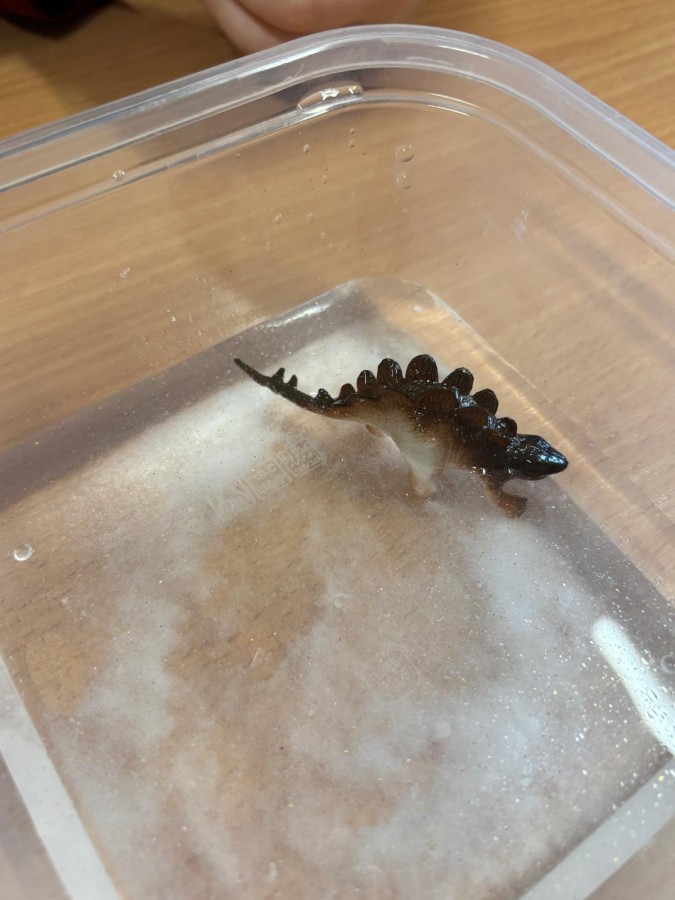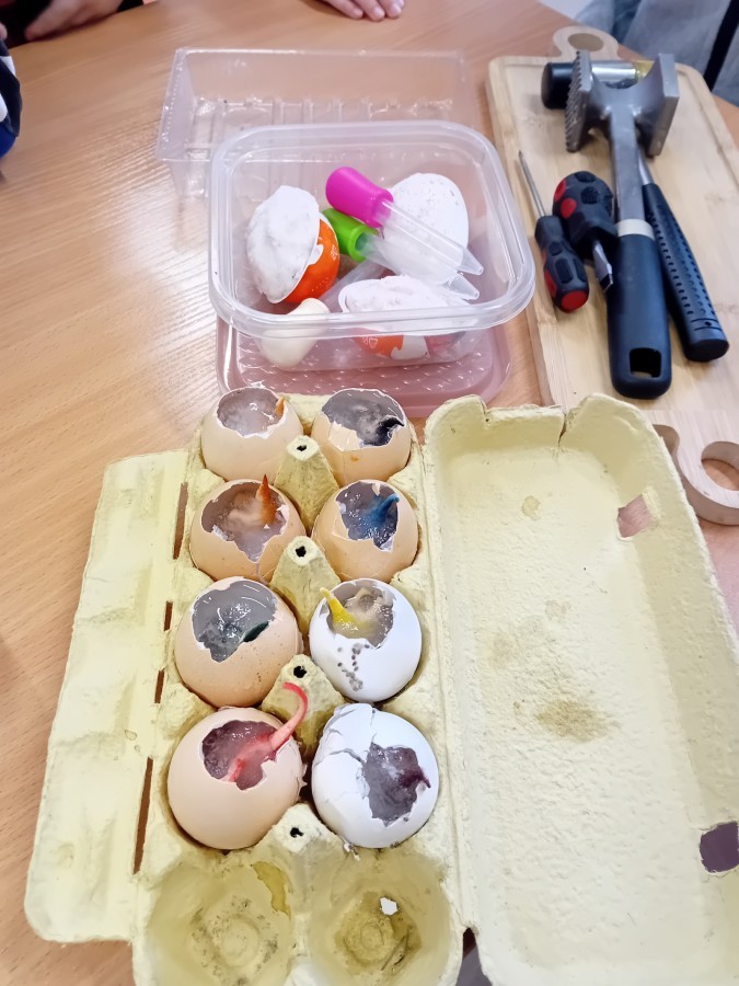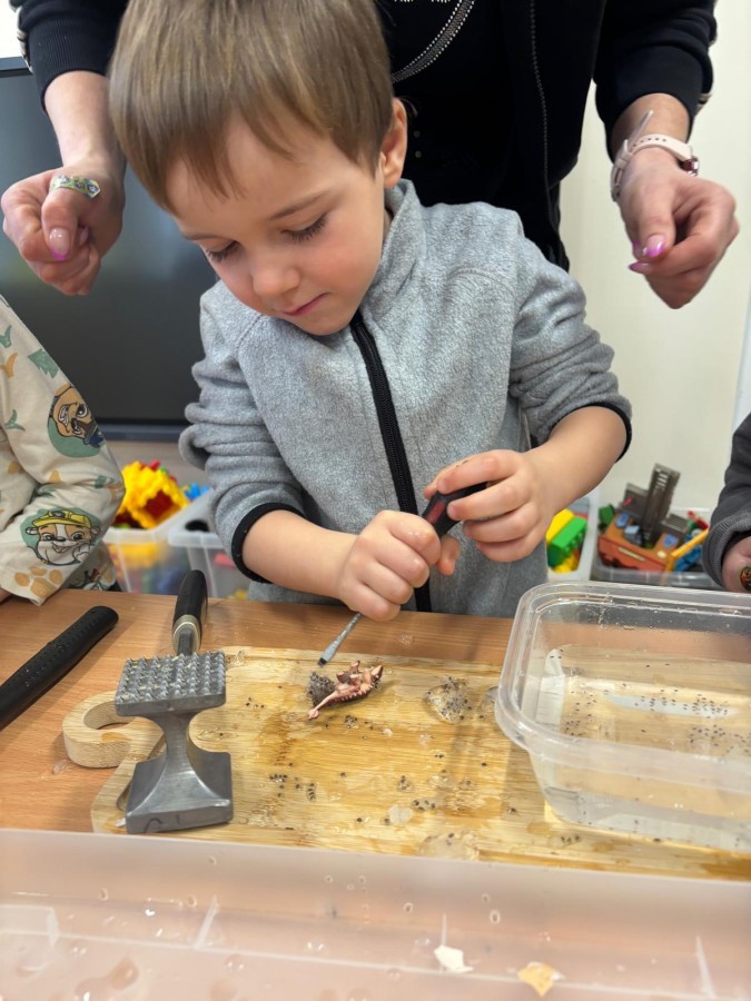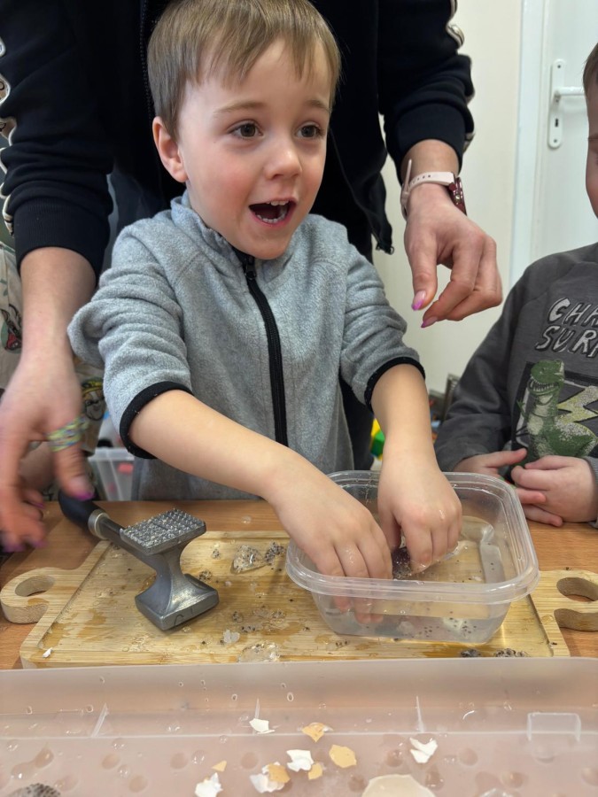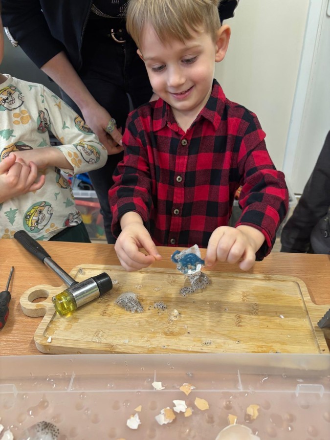 - ❄️ Lodowe jaja – cierpliwie uwalnialiśmy figurki dinozaurów zamknięte w lodzie.
