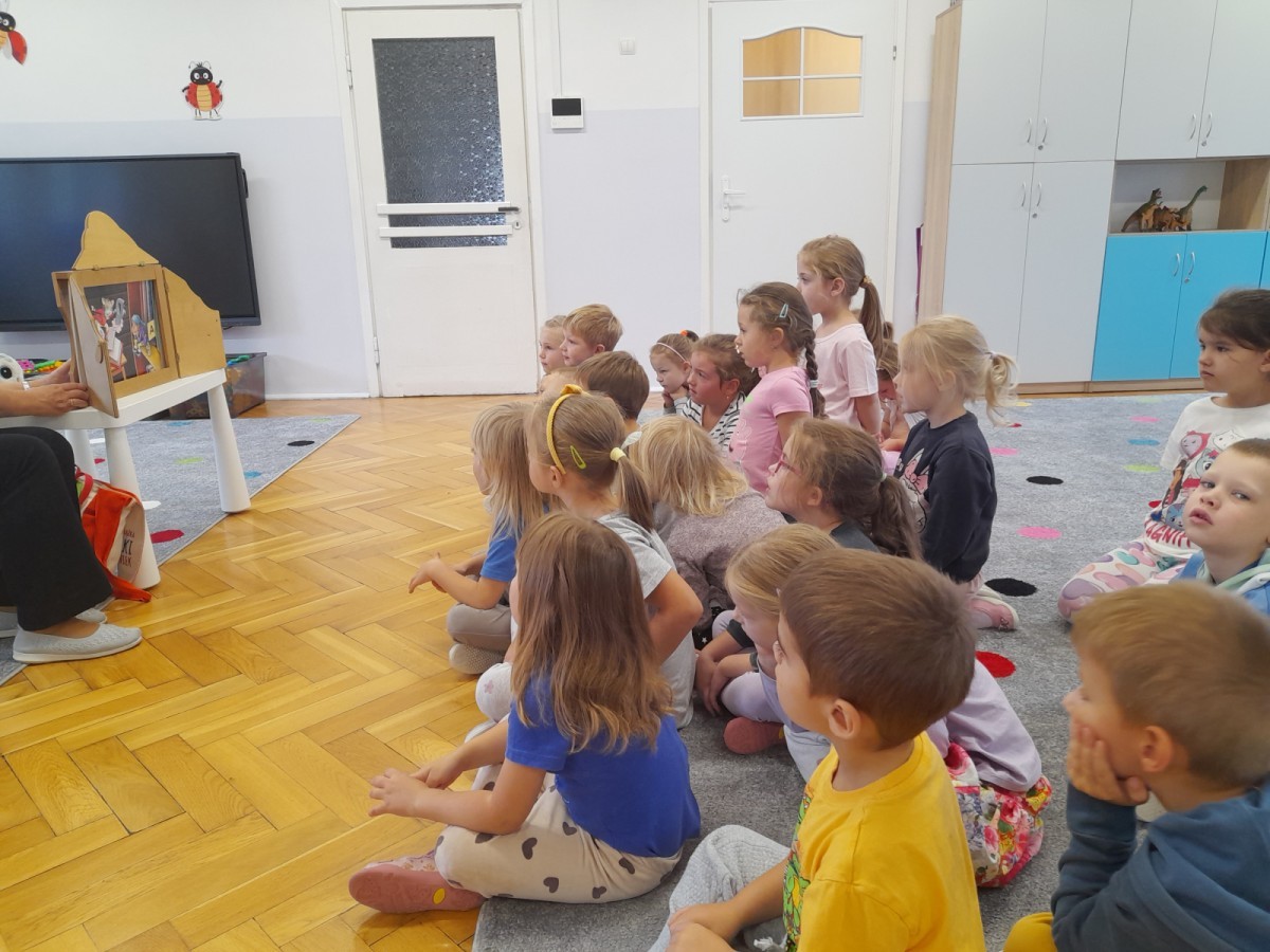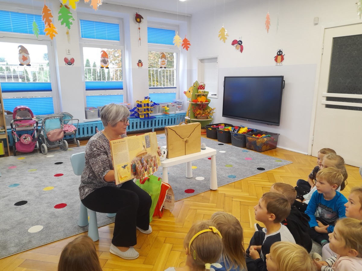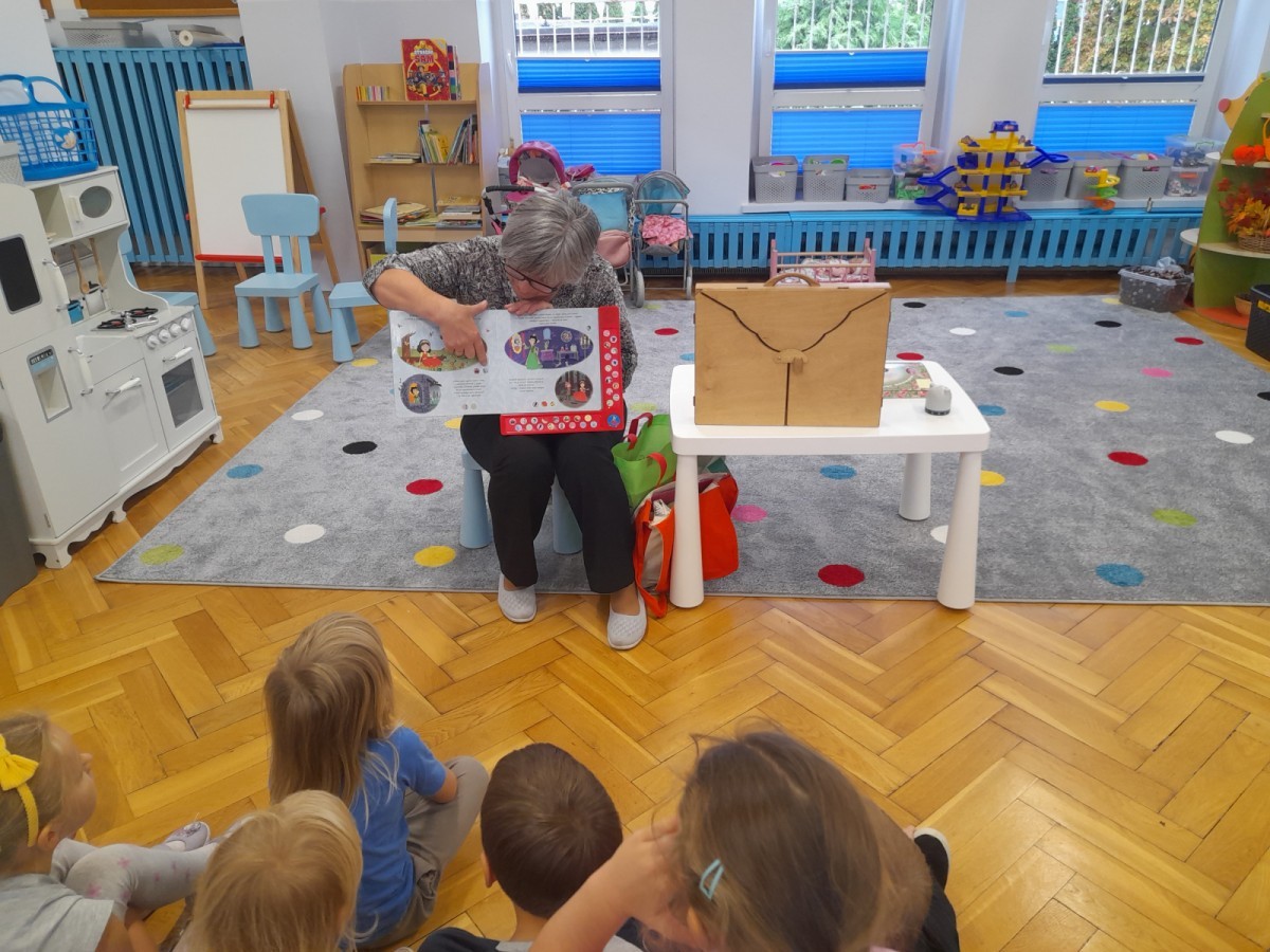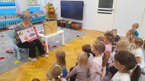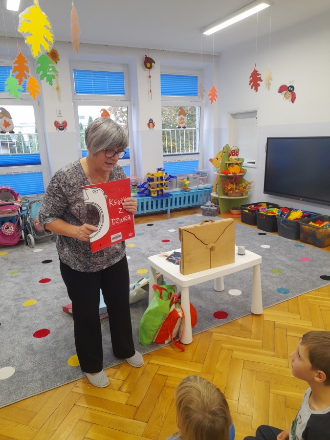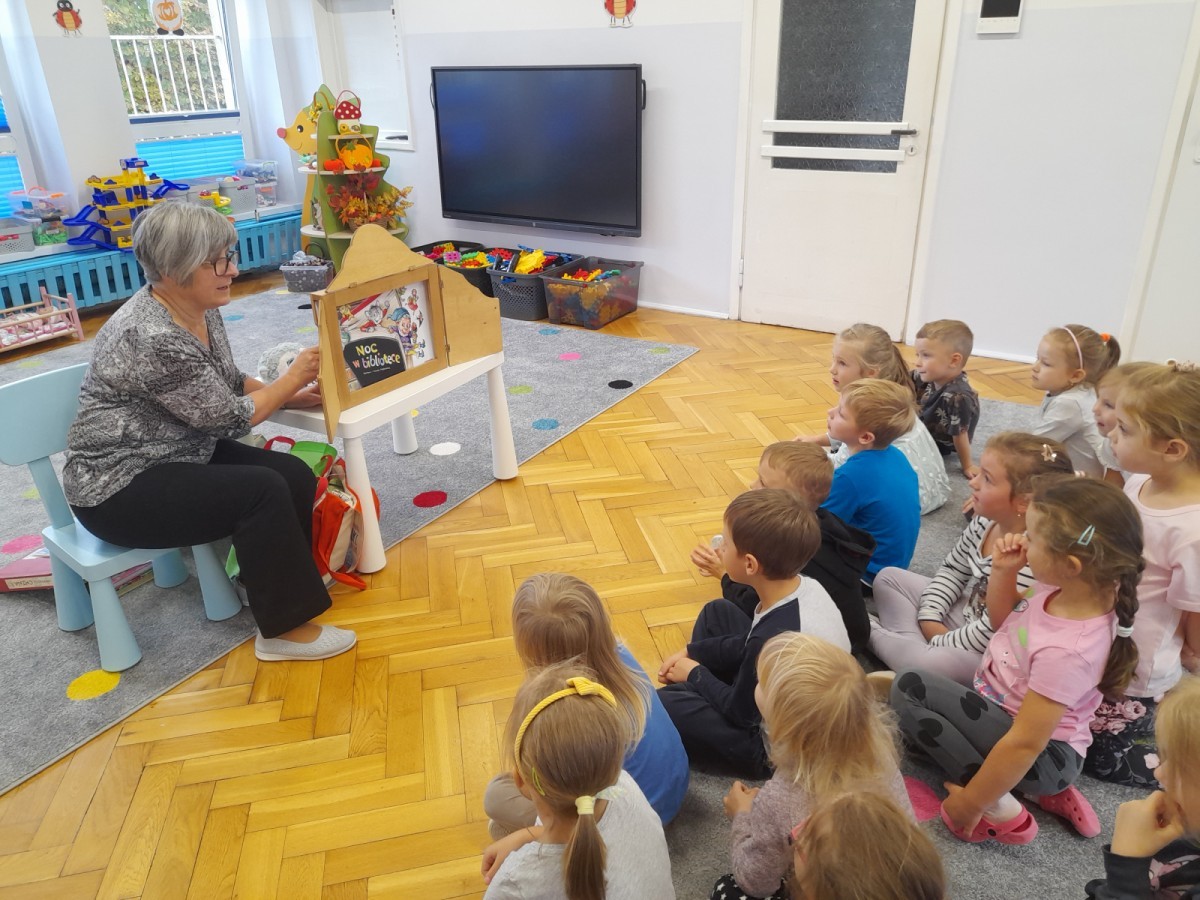 Dziś odbyły się pierwsze zajęcia biblioteczne w tym roku szkolnym. Pani Maria pokazała dzieciom różne rodzaje książek dla dzieci i opowiedziała o konieczności ich poszanowania. Następnie teatrzyk kamishibai otworzył się za sprawą zaklęcia "Hokus-pokus, czary-mary teatrzyku otwórz się" i dzieci były zachwycone królewskim klimatem prezentacji. Wysłuchaliśmy ciekawej bajki "Noc w bibliotece" i aktywnie poznawaliśmy bohaterów różnych bajek.
