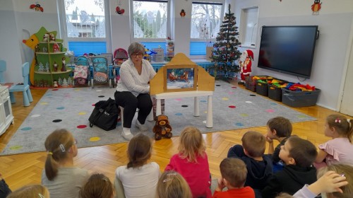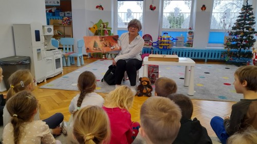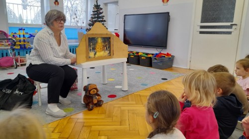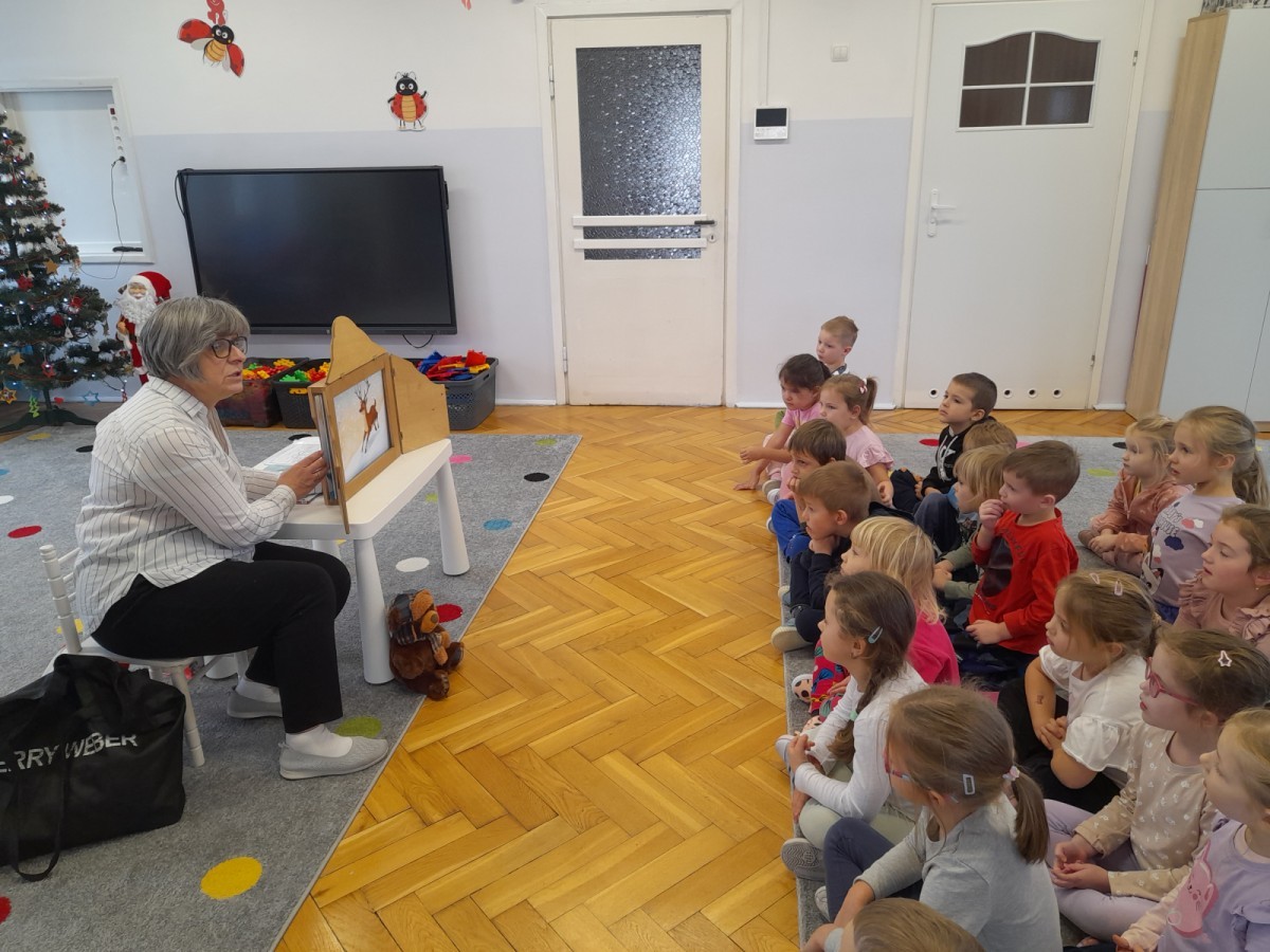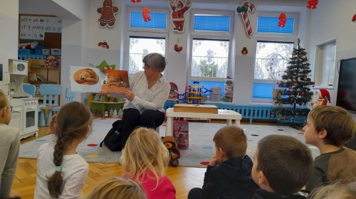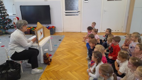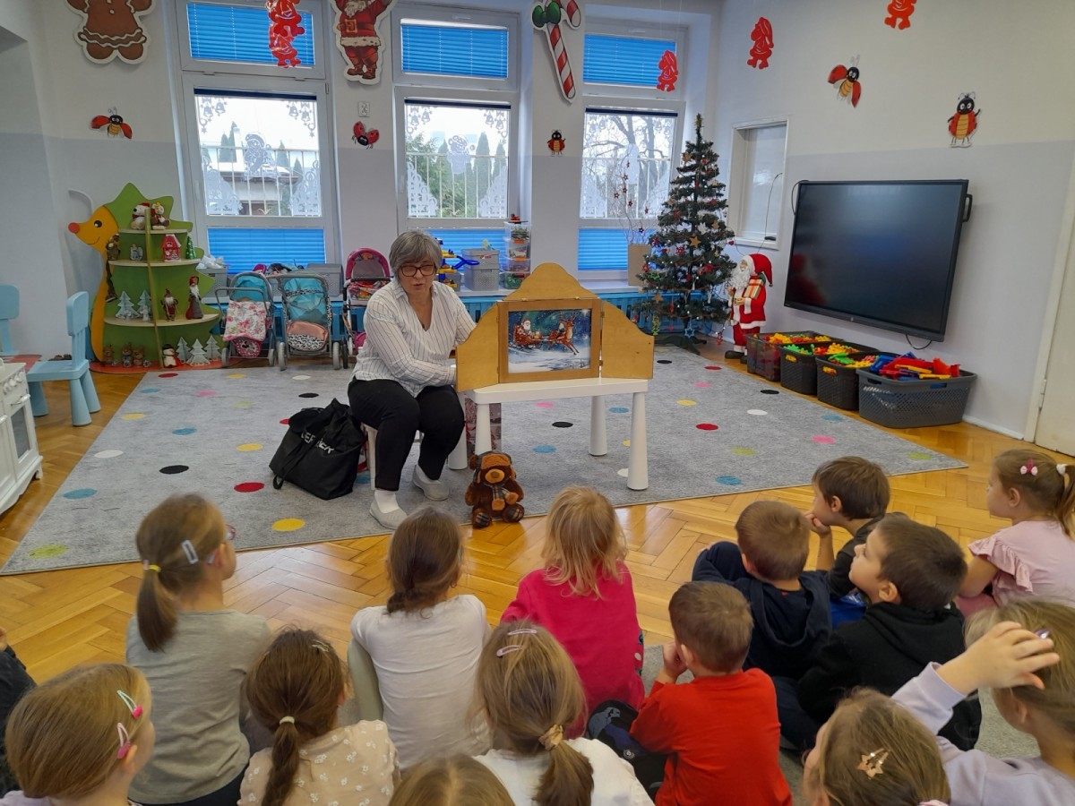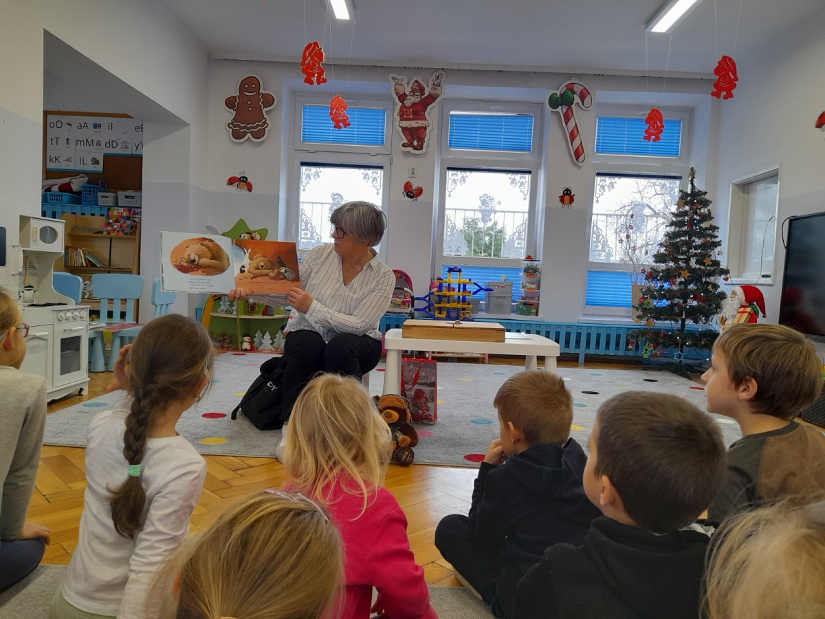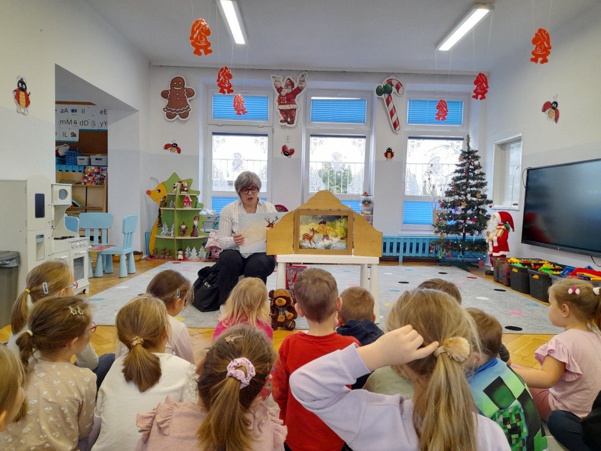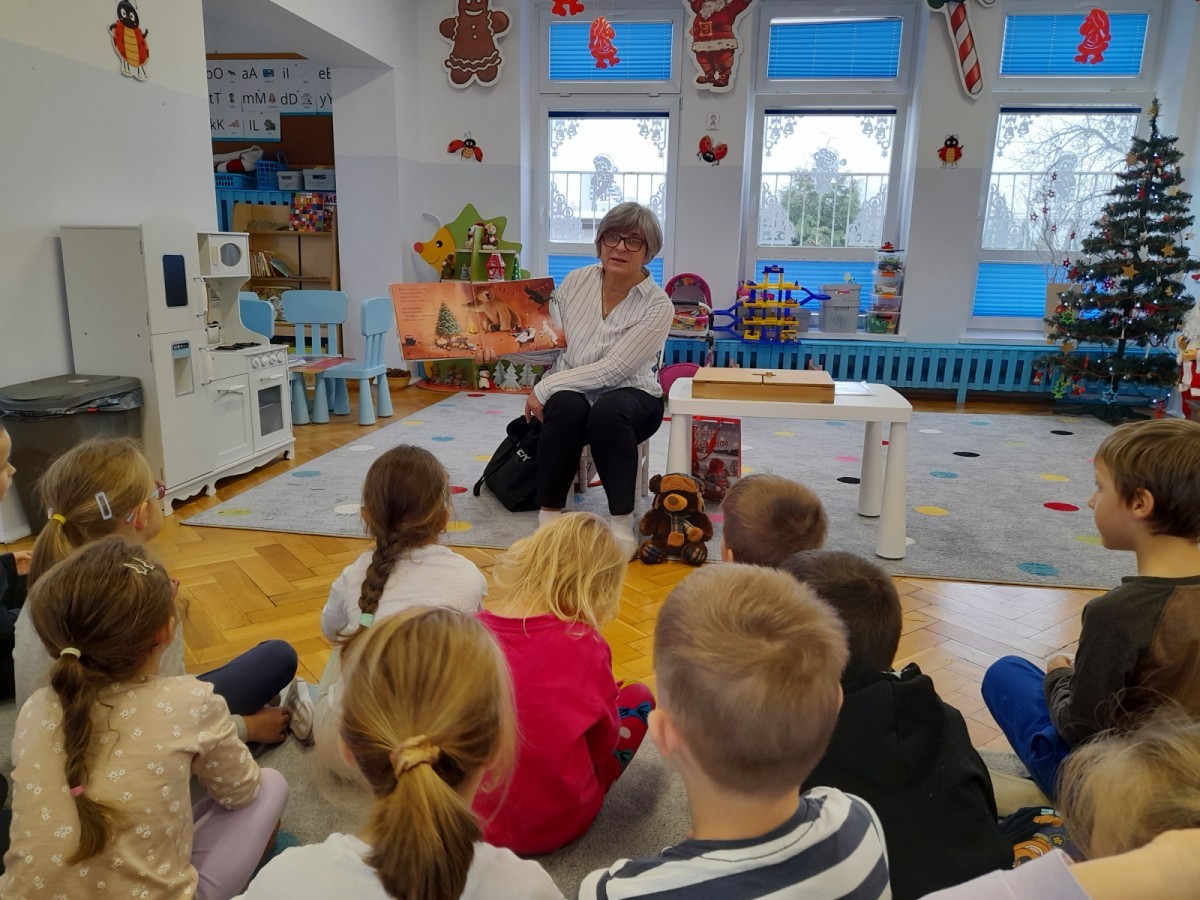 Dzisiaj odwiedziła nas Pani Maria – bibliotekarka. Biedronki miały okazję wysłuchać uroczej, świątecznej bajki pt. "Jelonek Lucek i sanie Świętego Mikołaja". Dzieci z zainteresowaniem śledziły przygody Lucka, a magiczna atmosfera opowieści sprawiła, że jeszcze bardziej nie mogą się doczekać wizyty Świętego Mikołaja. Pani Maria miała przygotowaną jeszcze jedną piękną historię świąteczną pełną ciepła, dobroci i zimowych przygód Misia i jego przyjaciół. Zajęcia zostały zakończone słodką niespodzianką.