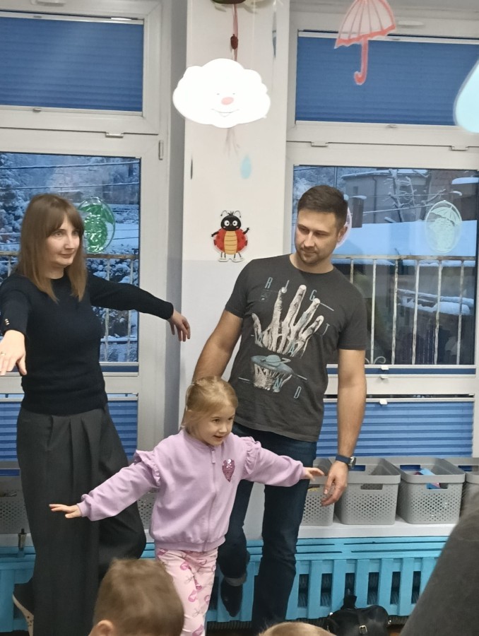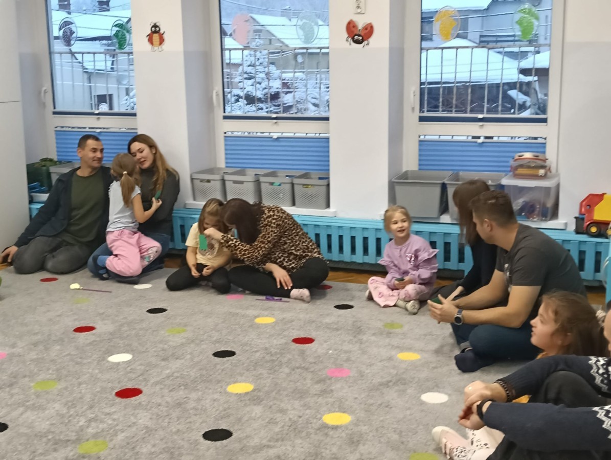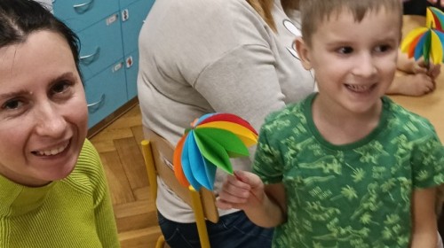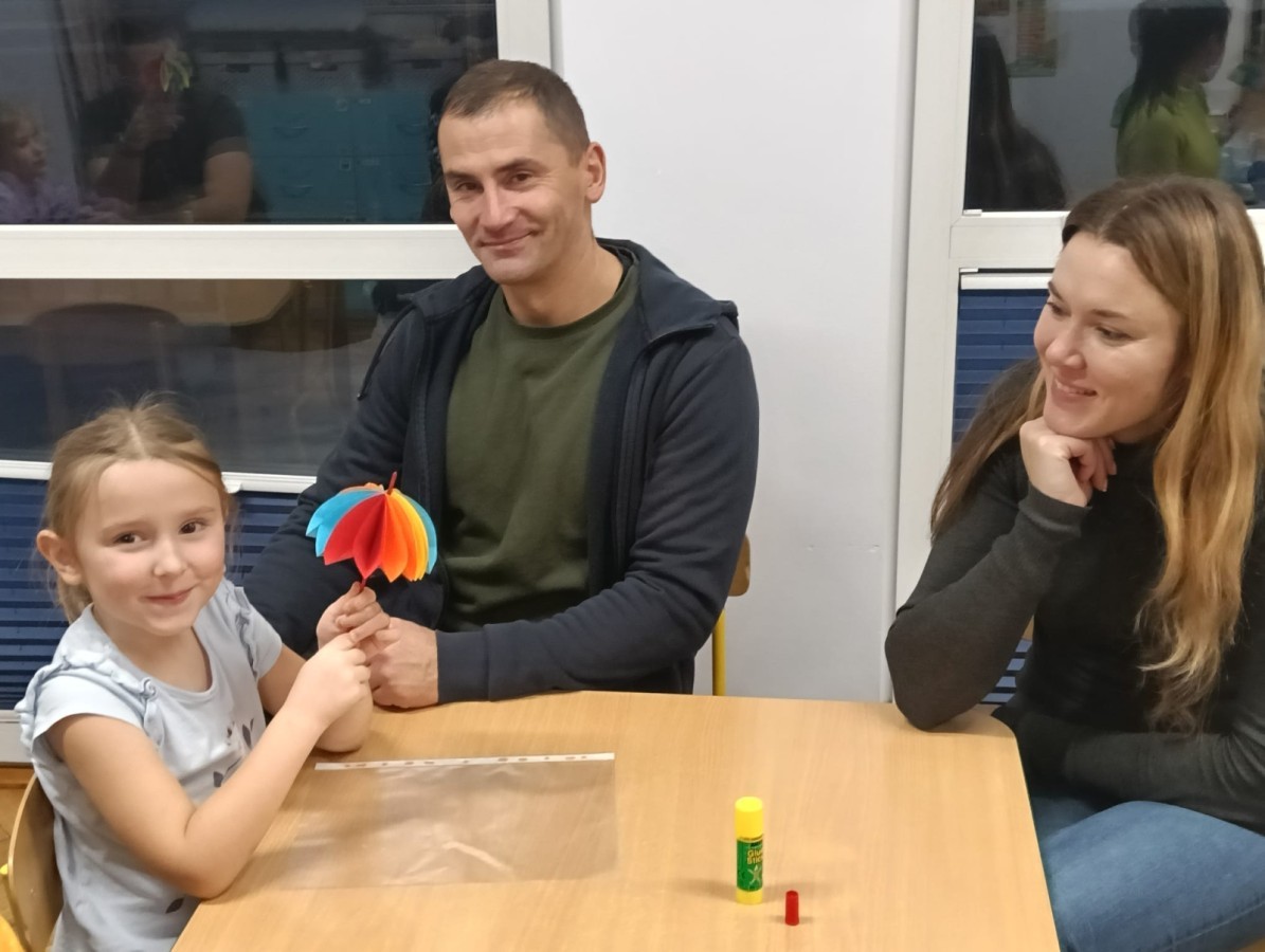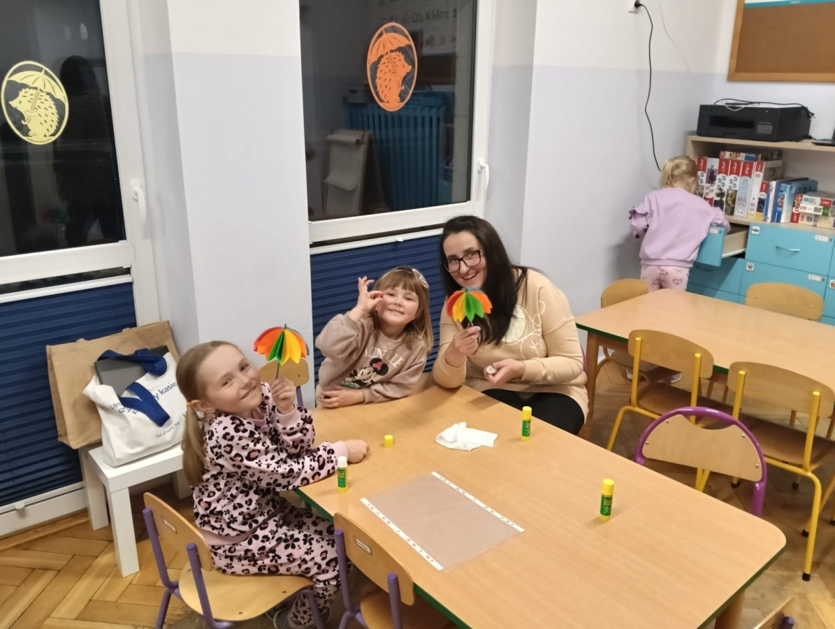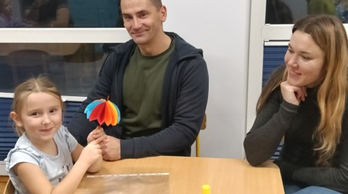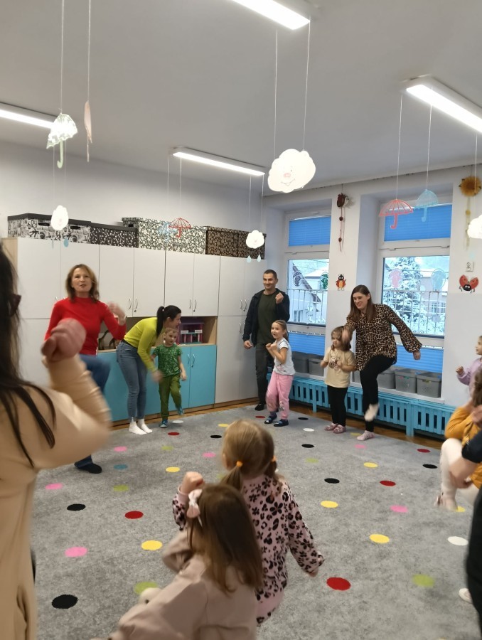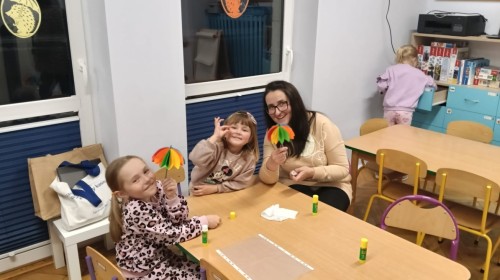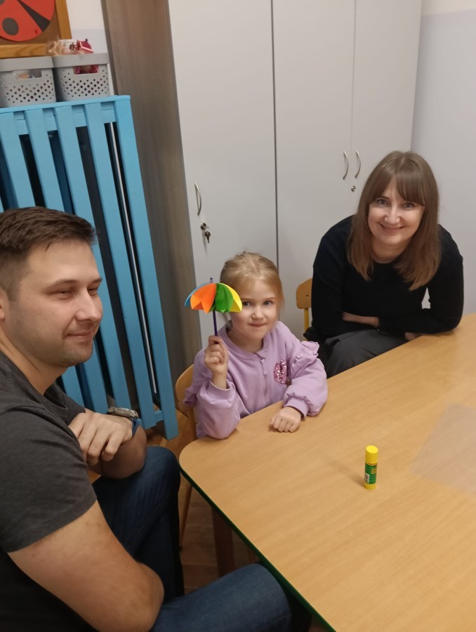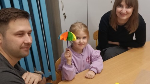 Zaprosiliśmy rodziców na zajęcie otwarte w naszym przedszkolu, podczas którego mieli okazję zobaczyć jak uczymy się i bawimy. Pani Ula - logopedka, zaprezentowała ćwiczenia do wykonywania w domu wspomagający rozwój aparatu mowy. Doskonaliliśmy również koordynację wzrokowo-ruchową, aktywnie słuchaliśmy muzyki, a na koniec wspólnie z Rodzicami stworzyliśmy kolorowe jesienne parasole.