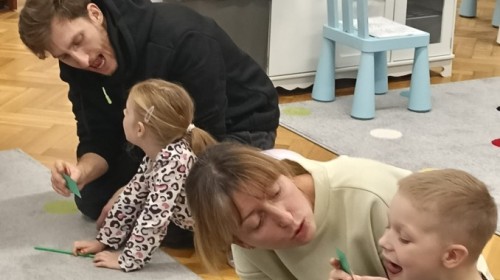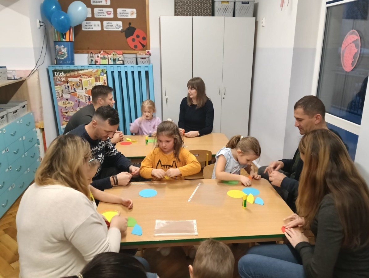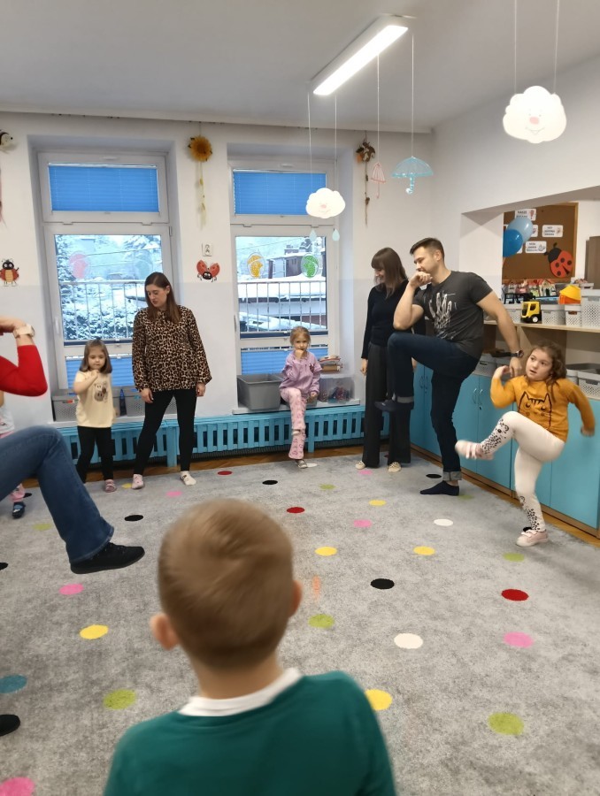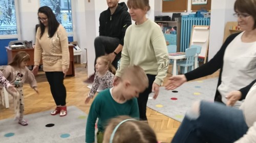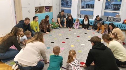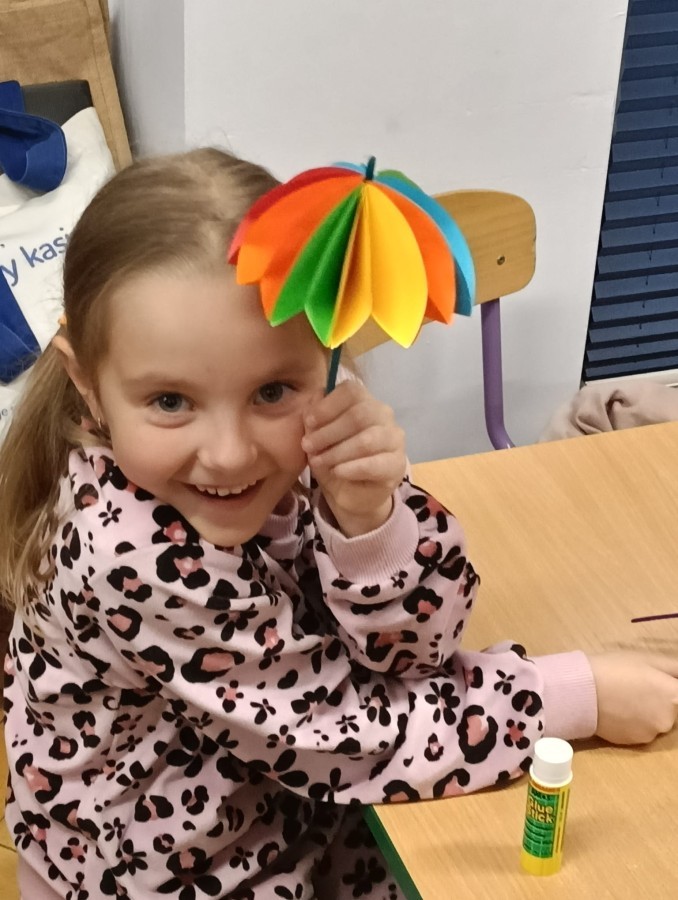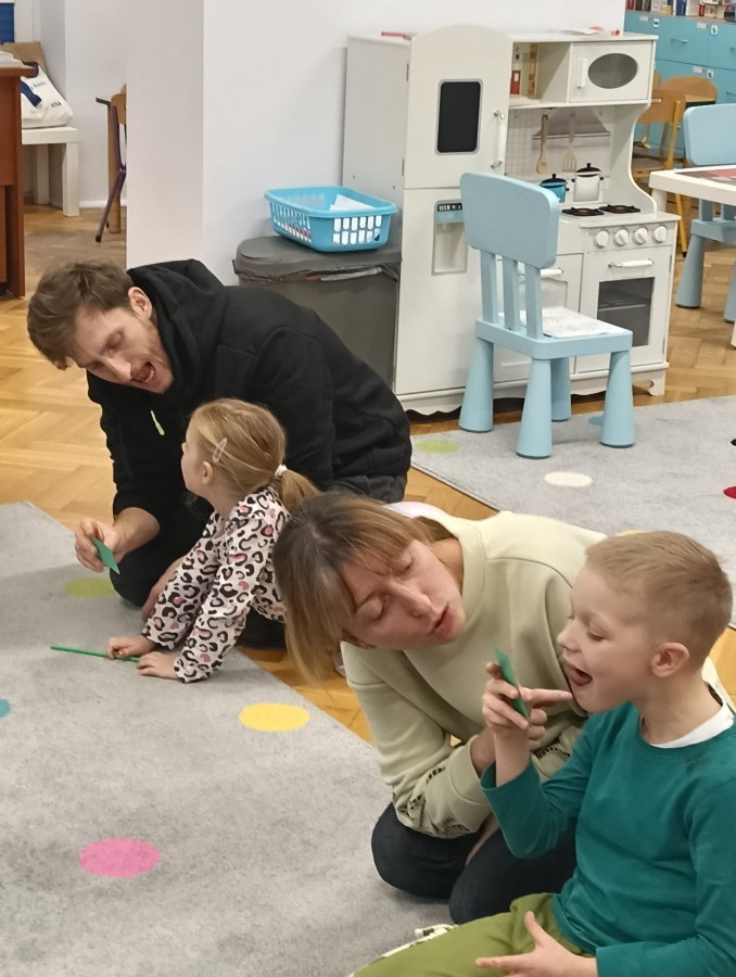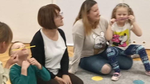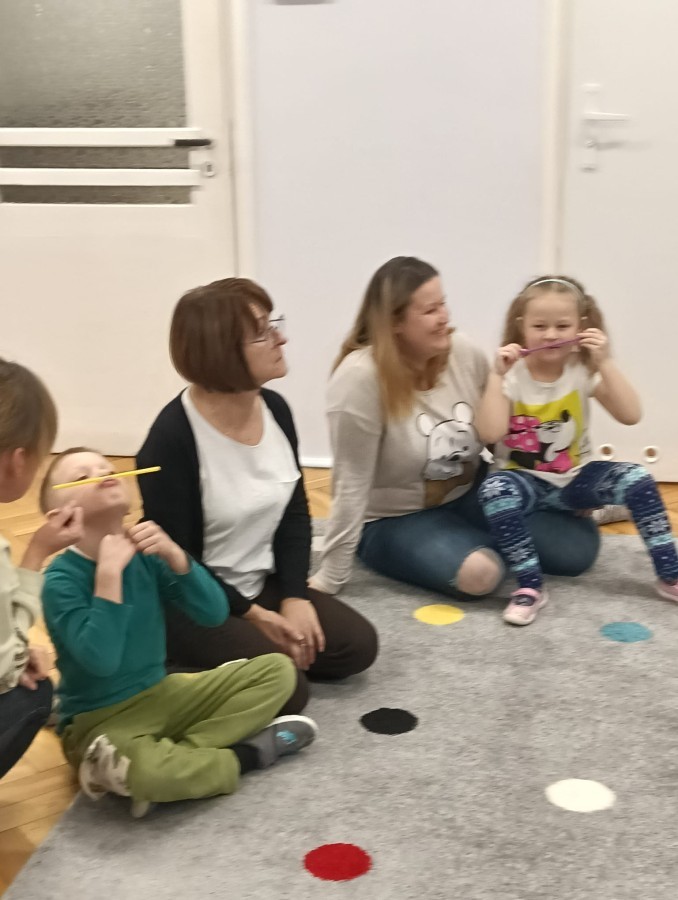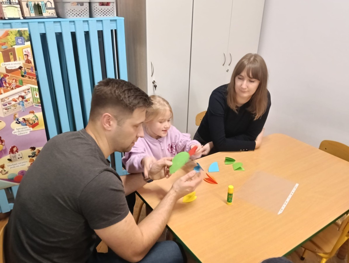 Zaprosiliśmy rodziców na zajęcie otwarte w naszym przedszkolu, podczas którego mieli okazję zobaczyć jak uczymy się i bawimy. Pani Ula - logopedka, zaprezentowała ćwiczenia do wykonywania w domu wspomagający rozwój aparatu mowy. Doskonaliliśmy również koordynację wzrokowo-ruchową, aktywnie słuchaliśmy muzyki, a na koniec wspólnie z Rodzicami stworzyliśmy kolorowe jesienne parasole.