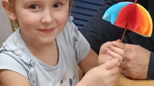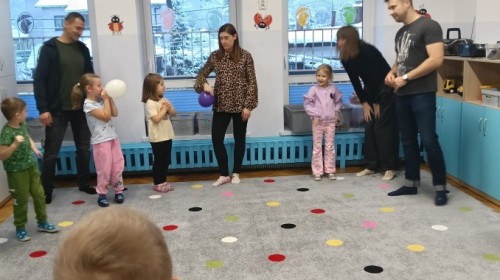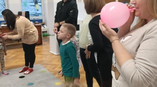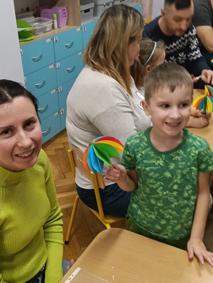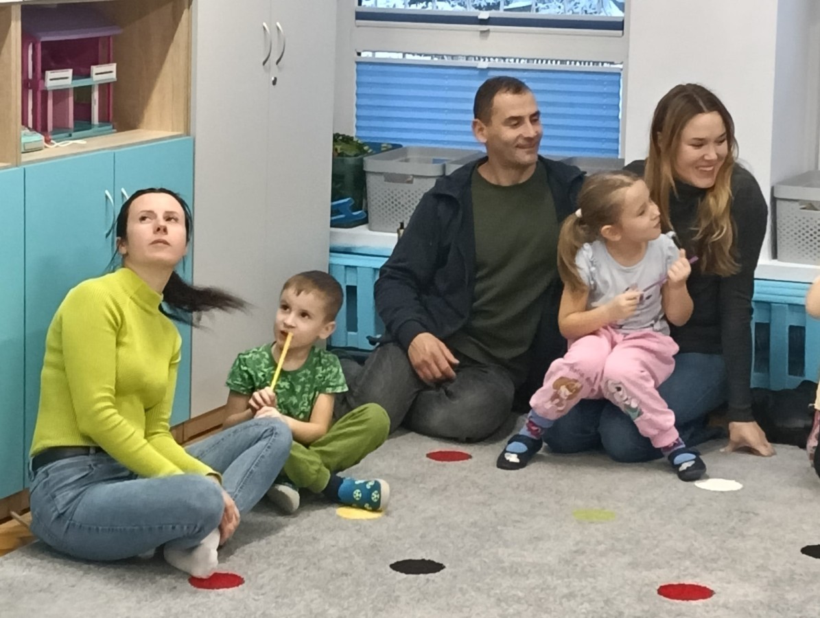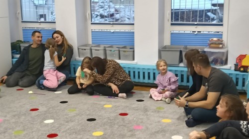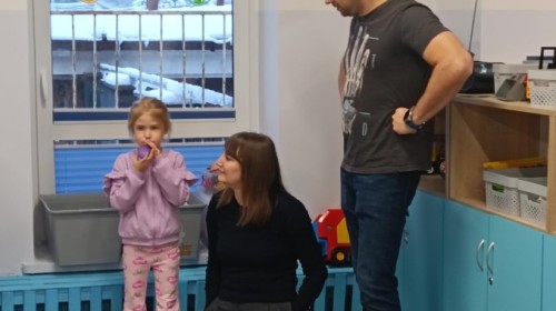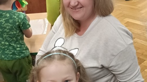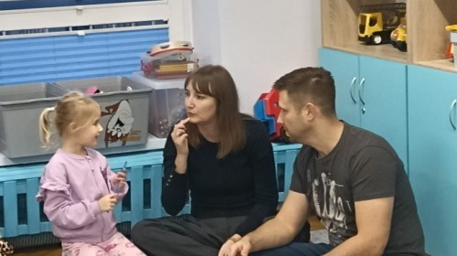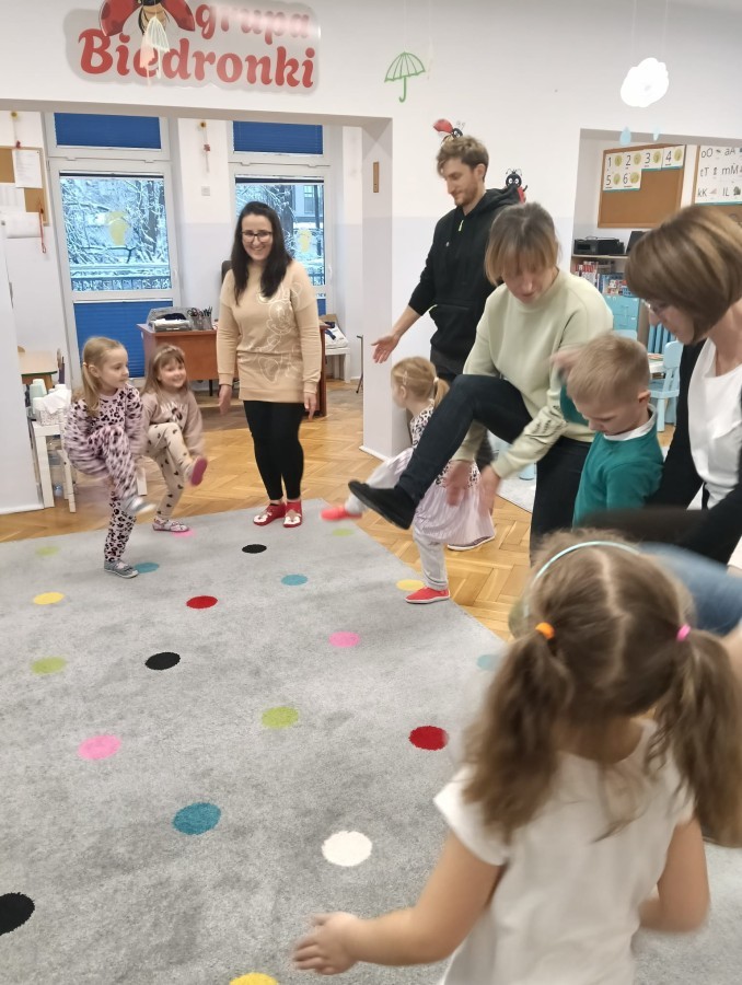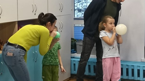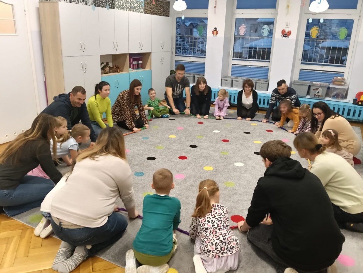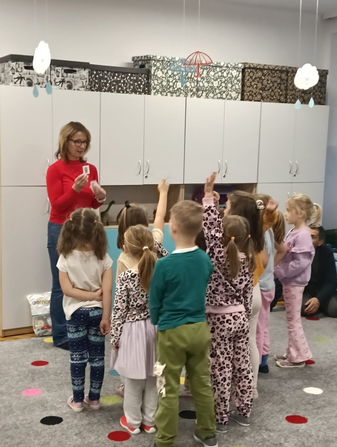 Zaprosiliśmy rodziców na zajęcie otwarte w naszym przedszkolu, podczas którego mieli okazję zobaczyć jak uczymy się i bawimy. Pani Ula - logopedka, zaprezentowała ćwiczenia do wykonywania w domu wspomagający rozwój aparatu mowy. Doskonaliliśmy również koordynację wzrokowo-ruchową, aktywnie słuchaliśmy muzyki, a na koniec wspólnie z Rodzicami stworzyliśmy kolorowe jesienne parasole.