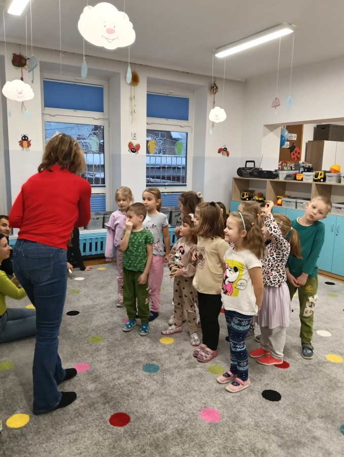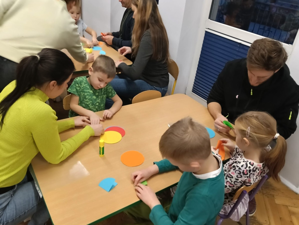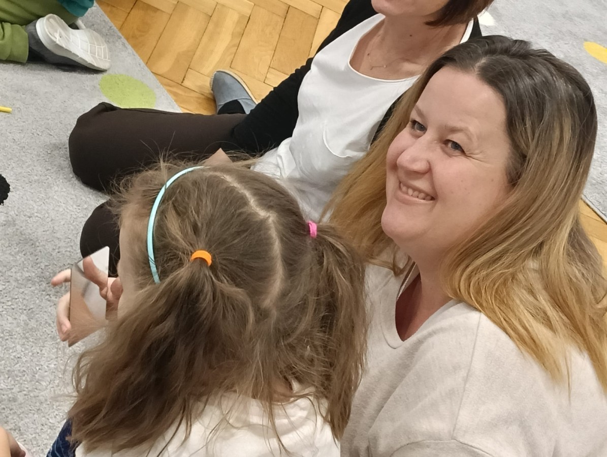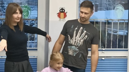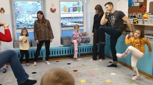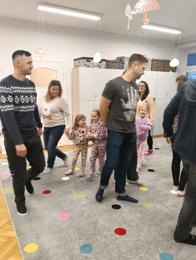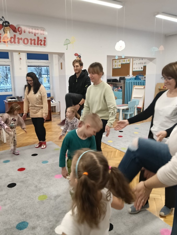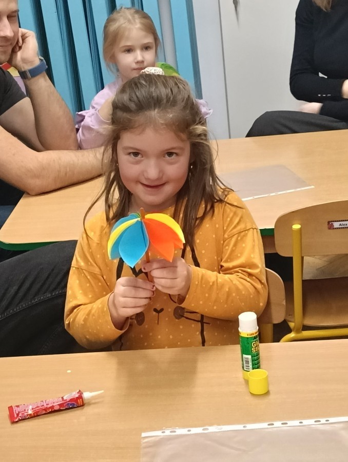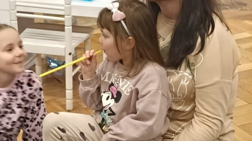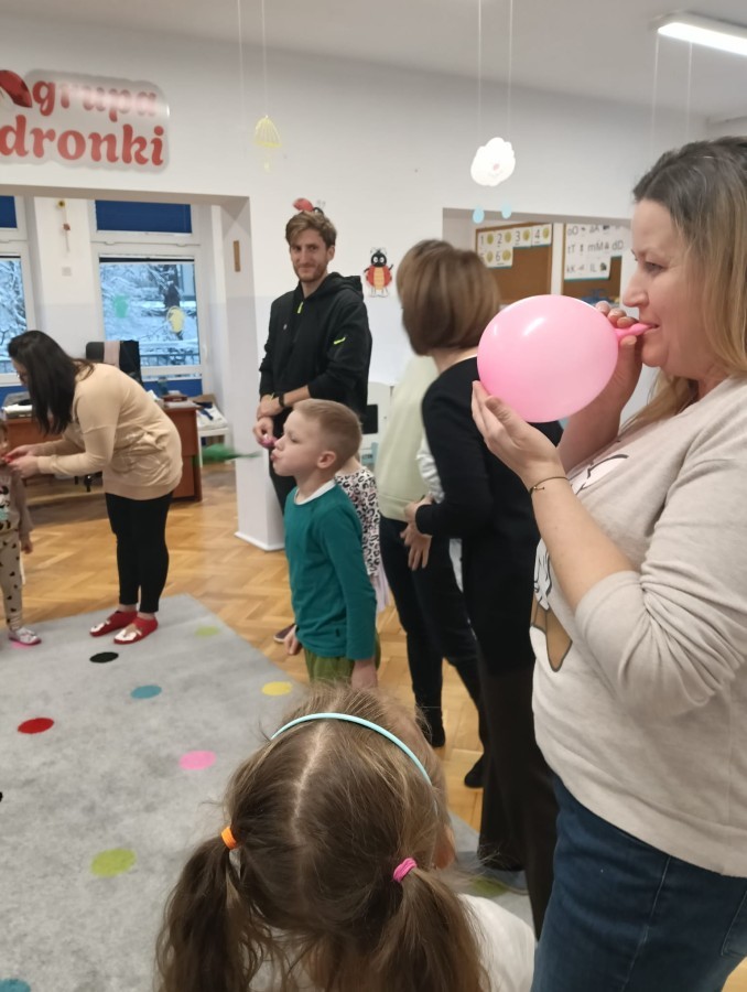 Zaprosiliśmy rodziców na zajęcie otwarte w naszym przedszkolu, podczas którego mieli okazję zobaczyć jak uczymy się i bawimy. Pani Ula - logopedka, zaprezentowała ćwiczenia do wykonywania w domu wspomagający rozwój aparatu mowy. Doskonaliliśmy również koordynację wzrokowo-ruchową, aktywnie słuchaliśmy muzyki, a na koniec wspólnie z Rodzicami stworzyliśmy kolorowe jesienne parasole.