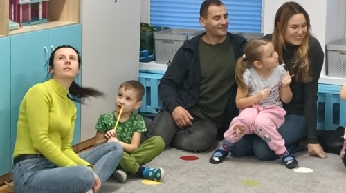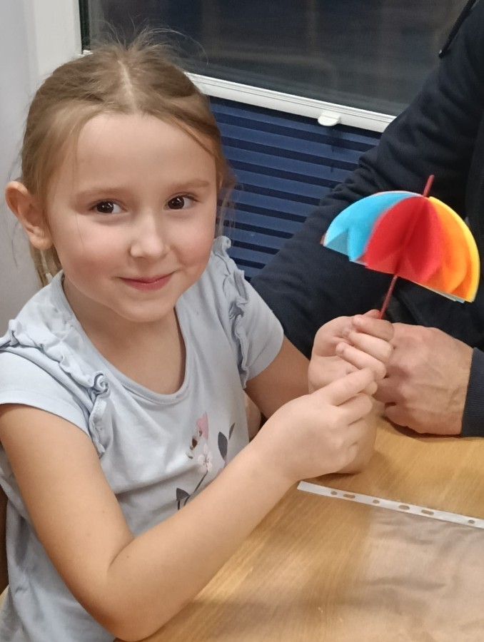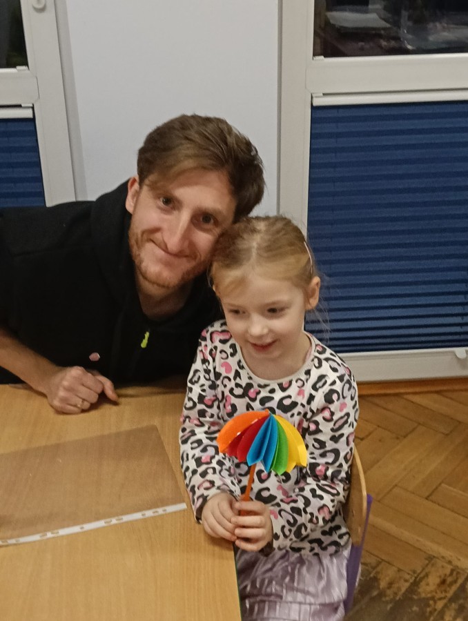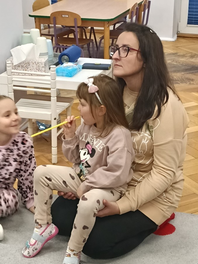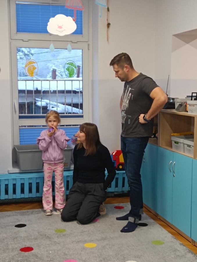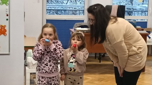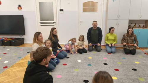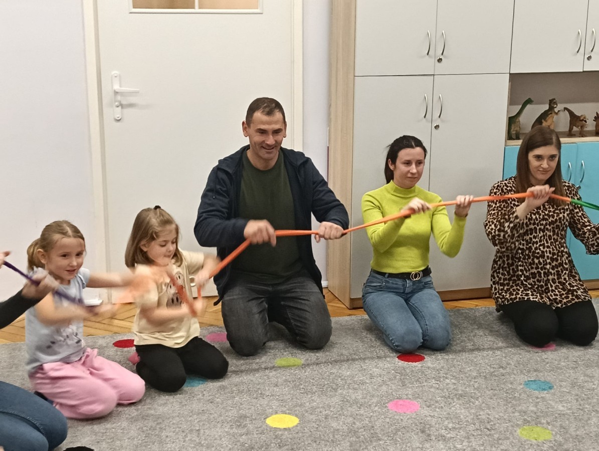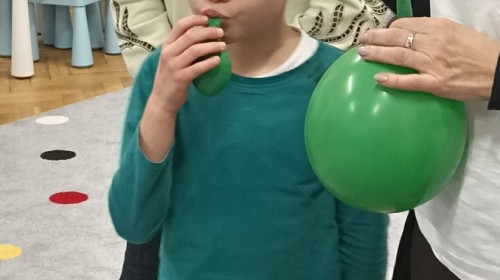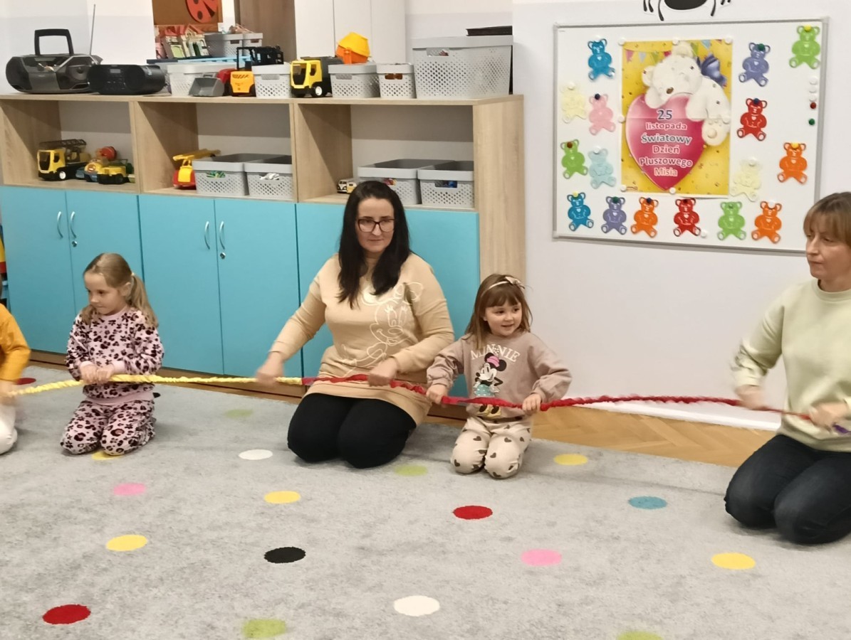 Zaprosiliśmy rodziców na zajęcie otwarte w naszym przedszkolu, podczas którego mieli okazję zobaczyć jak uczymy się i bawimy. Pani Ula - logopedka, zaprezentowała ćwiczenia do wykonywania w domu wspomagający rozwój aparatu mowy. Doskonaliliśmy również koordynację wzrokowo-ruchową, aktywnie słuchaliśmy muzyki, a na koniec wspólnie z Rodzicami stworzyliśmy kolorowe jesienne parasole.